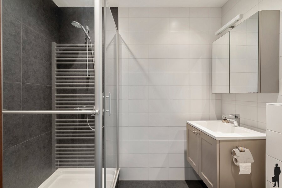 - Een douchekamer met lavabo, toilet en handdoekradiator