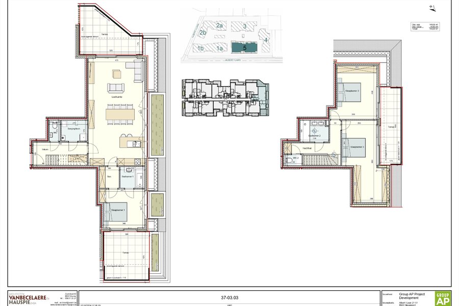 - op de 3de verdieping: Inkomhal, gastentoilet, berging met aansluiting voor wasmachine, trap, leefruimte met open keuken , zithoek, eethoek en aangrenzend zonneterras, slaapkamer 1 met aangrenzend terras en on-suite badkamer met enkele wastafel in meubel en keuze tussen ligbad, inloopdouche of hoekdouche.