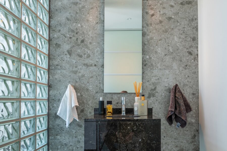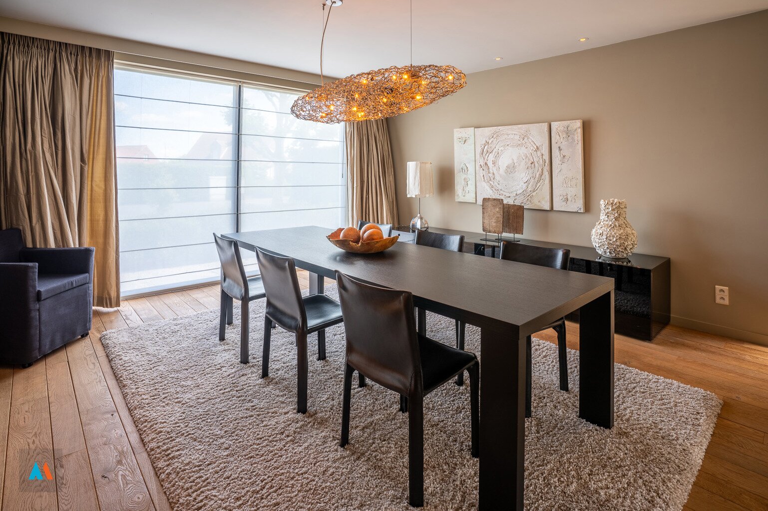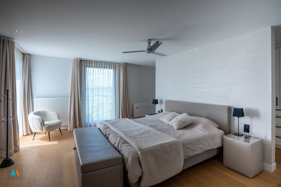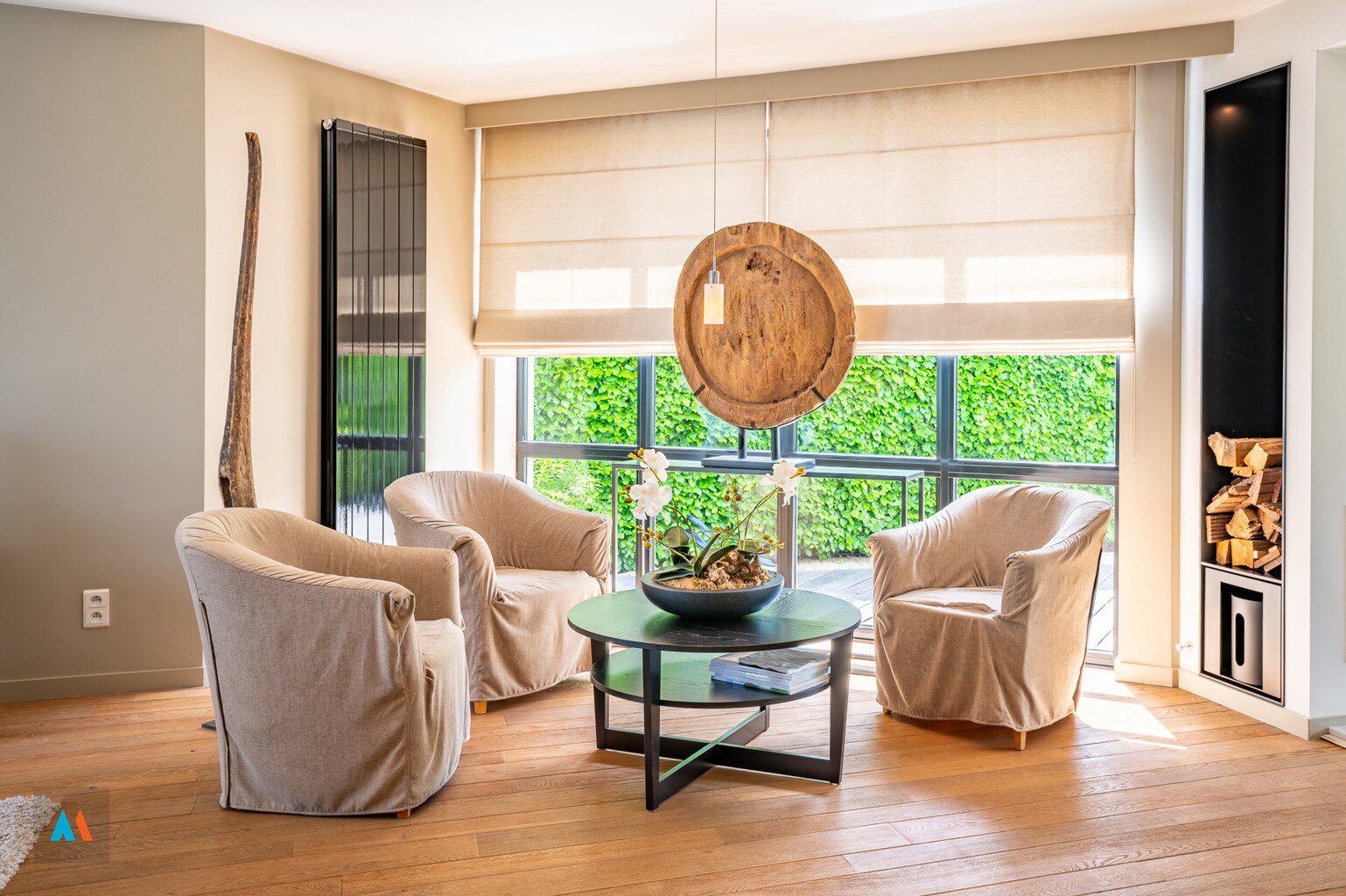 De woning beschikt over 4 slaapkamers, een bureau, een ruime woonkamer met overvloed aan lichtinval, een apart gastentoilet, een stijlvolle badkamer, een praktische wasplaats, koele berging en royale inkomhal. Het interieur straalt warmte en elegantie uit dankzij het gebruik van natuurlijke materialen zoals vol parket, natuursteen en keramische tegels. Maatwerk inmaakkasten zorgen voor een strak en functioneel geheel.