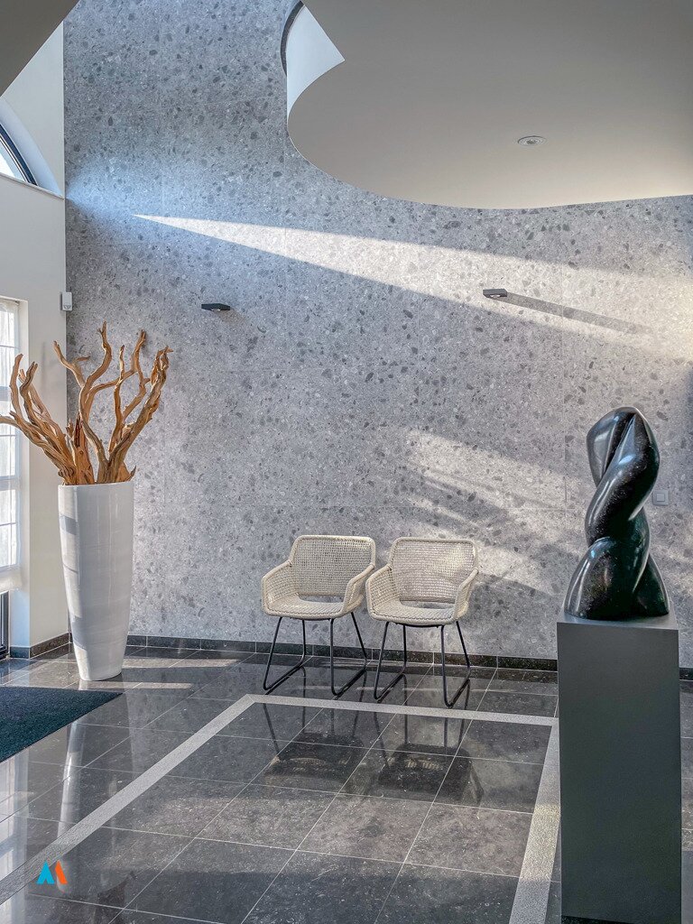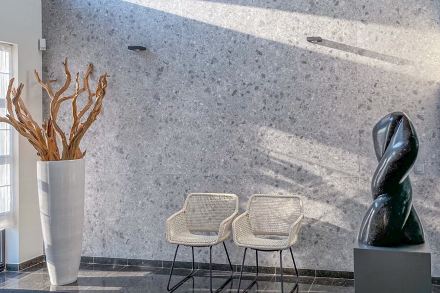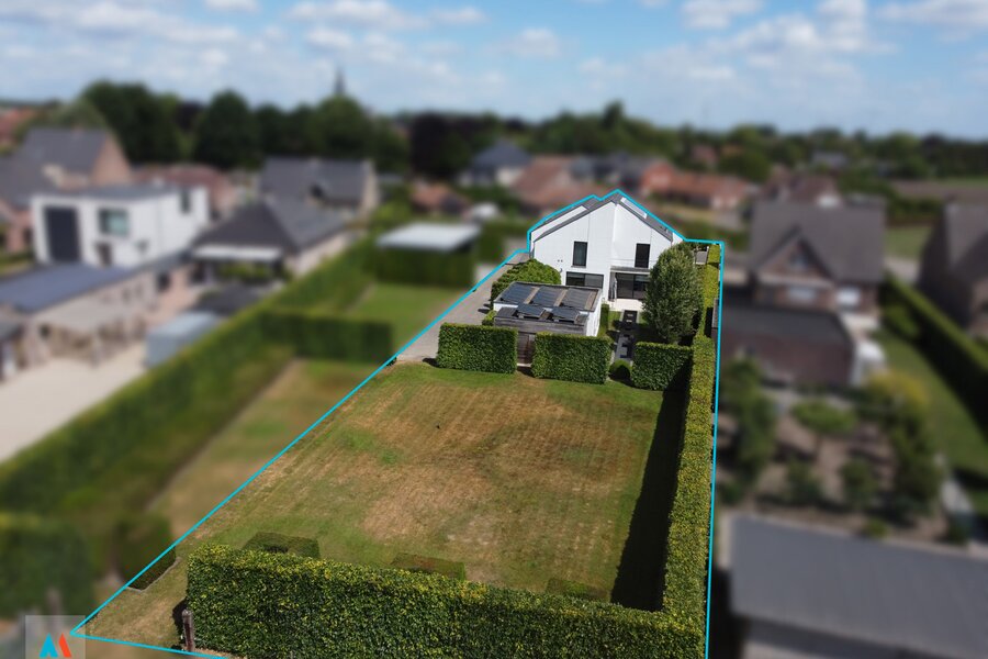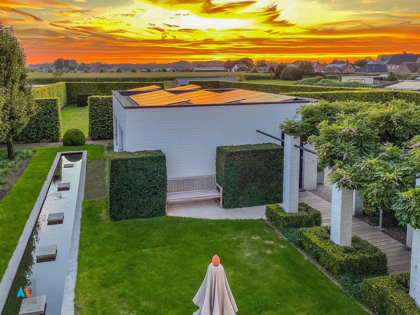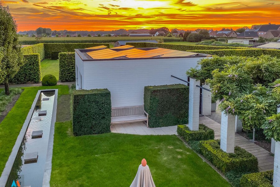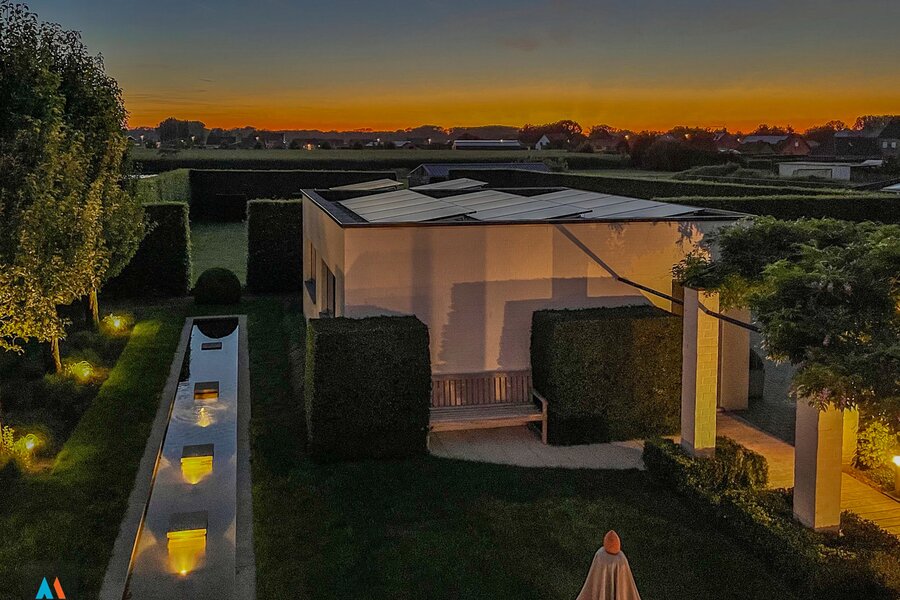 Het perceel van 1.438 m² is professioneel aangelegd en ademt rust en klasse. Grote keramische tegels, witte kiezelverhardingen, een waterpartij aansluitend op de woonkamer en een automatisch bewateringssysteem tillen de tuinbeleving naar een hoger niveau. De westgerichte oriëntatie staat garant voor zonovergoten namiddagen en avonden. Achteraan sluit de tuin aan op landbouwgrond, wat zorgt voor een prachtig, open zicht over de omliggende velden – een zeldzaam gevoel van ruimte en vrijheid.