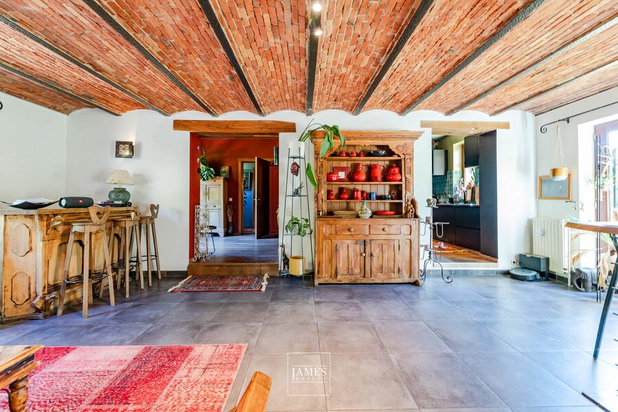 - Salon - eetkamer met houtkachel, gewelfde plafonds en zichtbare bakstenen muren