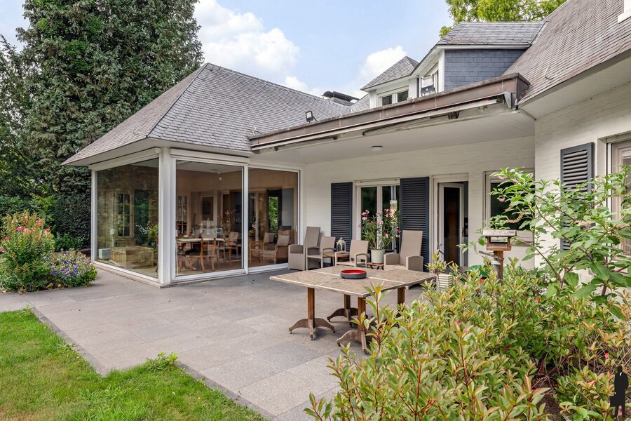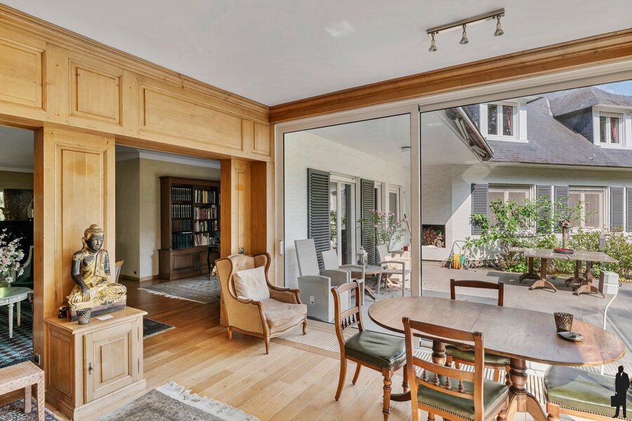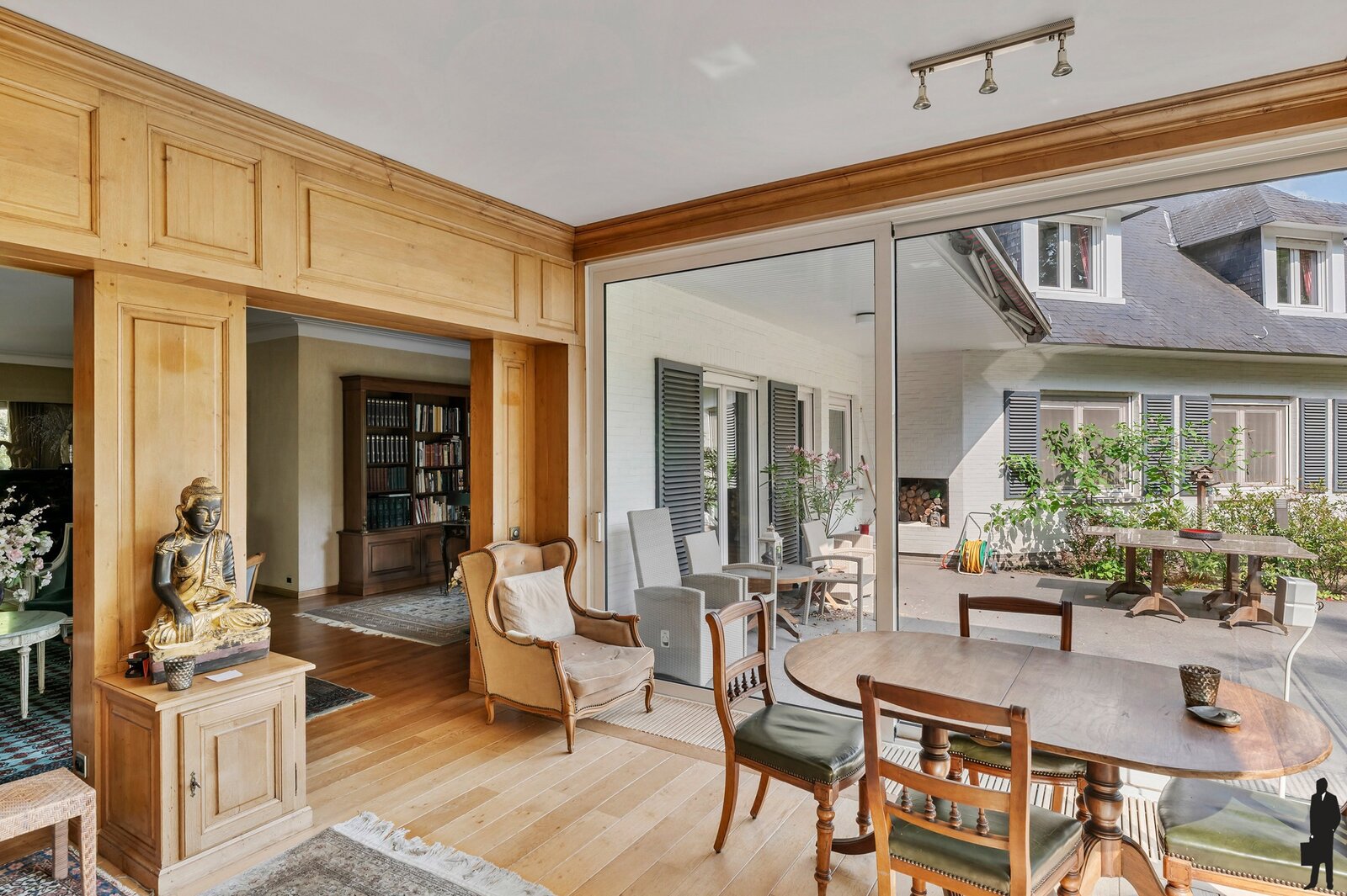 - Een achterliggende wintertuin/tuinkamer met plafondhoge ramen, veel lichtinval en prachtig zicht op het groen, eveneens op parketvloer