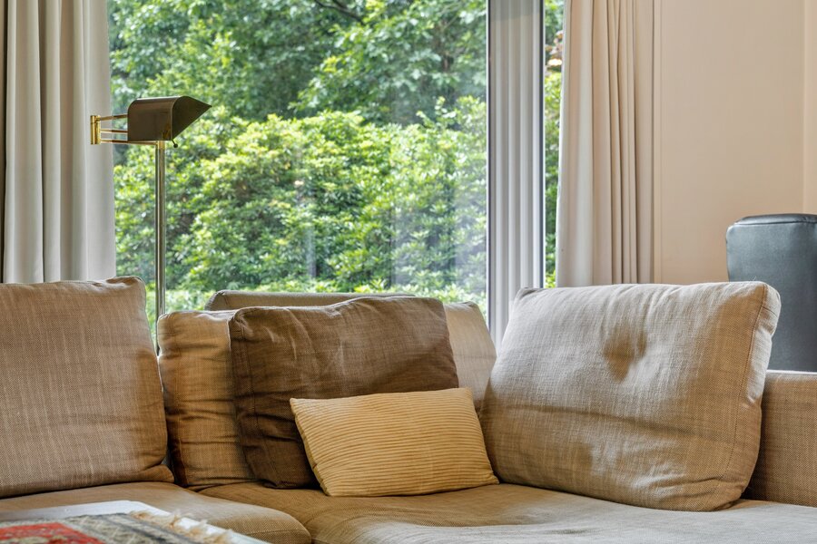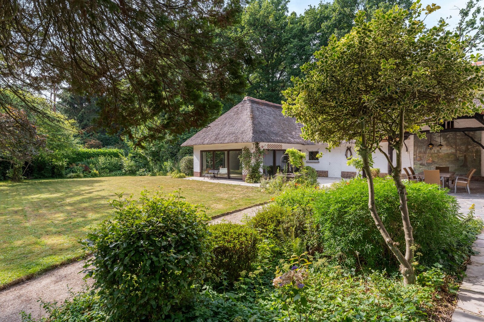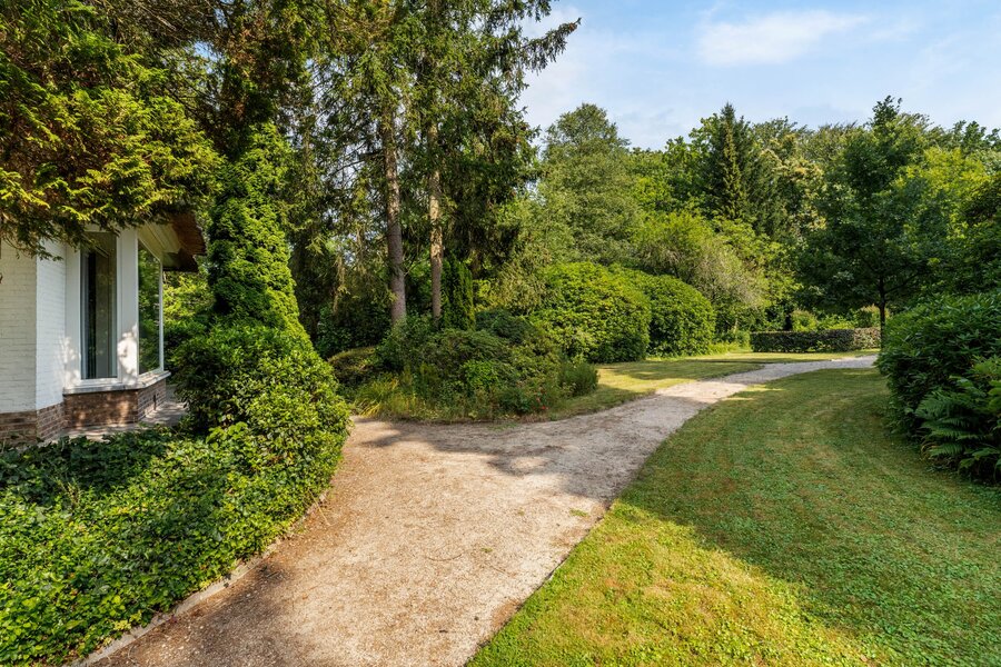 De tuin is een echte troef: volledig zuidwest georiënteerd, met een natuurlijke bosrand, maximale privacy en een prachtig uitzicht vanuit de leefruimtes. Het wellnessgedeelte omvat een ruim binnenzwembad, sauna (ca. 6 personen), douche en toilet. Een groot overdekt terras aan de keukenzijde maakt buitenleven het hele jaar door mogelijk. De garage met zolderverdieping en het tuinhuis bieden bijkomende opslagmogelijkheden.