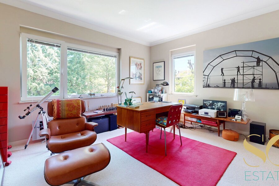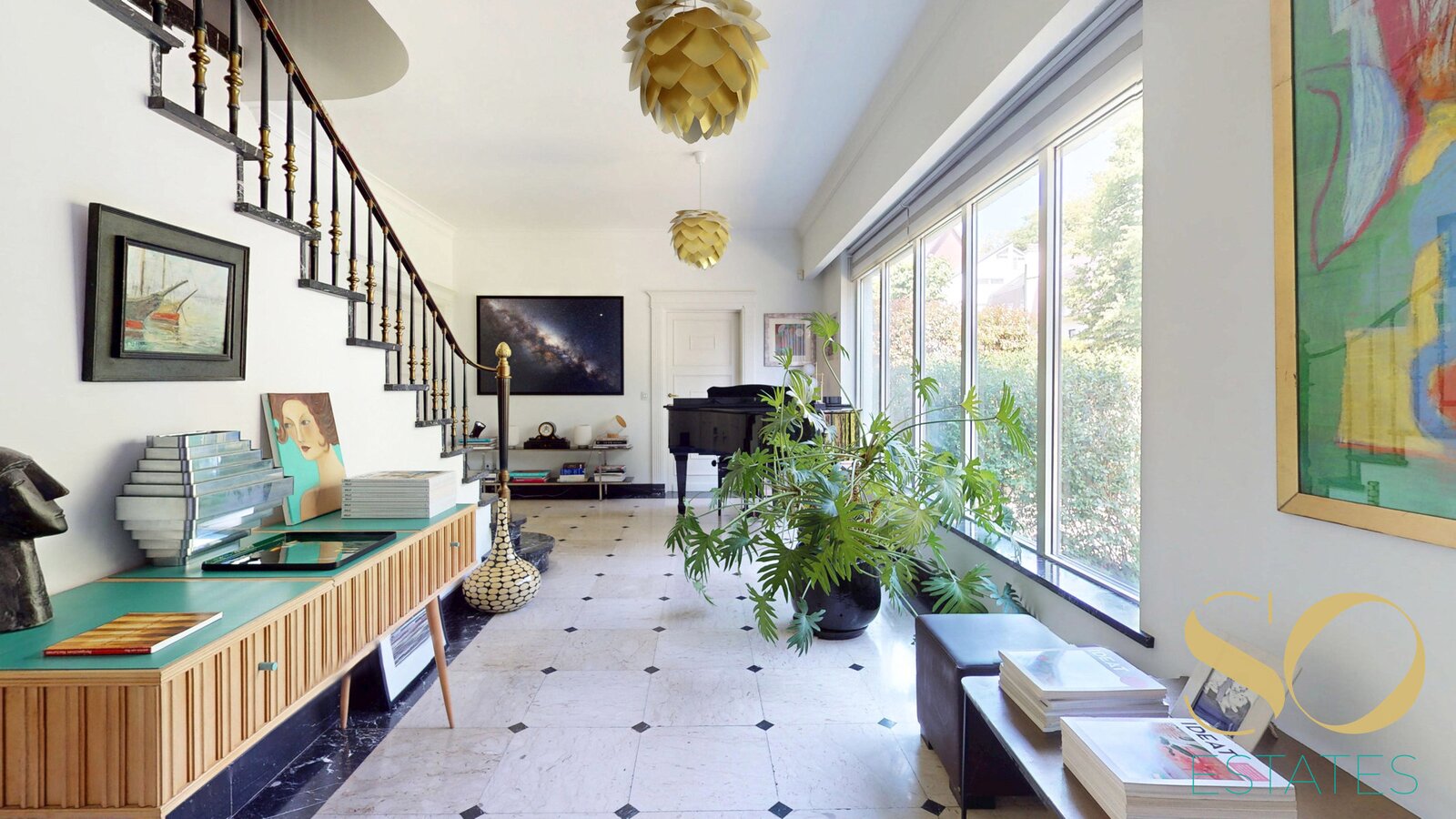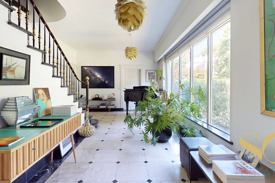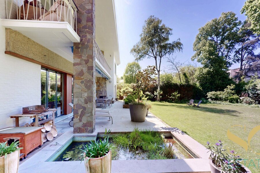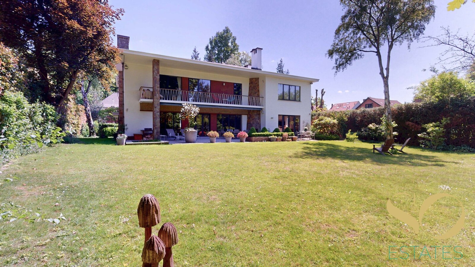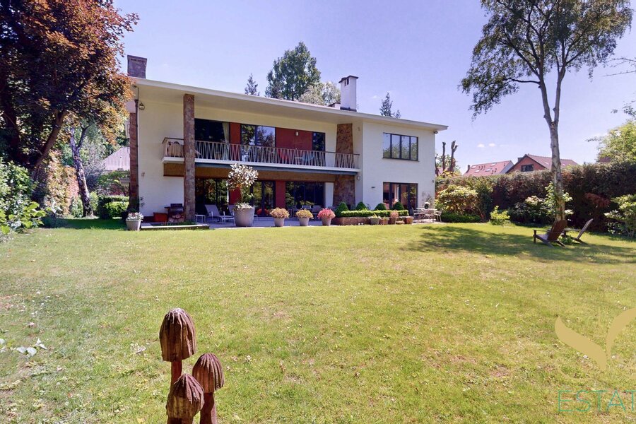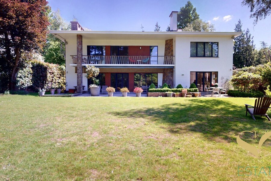 Prachtige architectenwoning van Stanislas Jasinski in Ukkel. In een van de meest begeerde en groene wijken van Ukkel ligt deze uitzonderlijke viergevelwoning, ontworpen door Stanislas Jasinski, een toonaangevend figuur binnen het Belgisch modernisme. De woning werd in 1958 gebouwd in opdracht van bouwmagnaat Jacques Delens en weerspiegelt de typische strakke lijnen en doordachte volumes van Jasinski’s stijl. Op een mooi georiënteerd perceel van 1.150 m² biedt de woning een bewoonbare oppervlakte van ± 372 m² verdeeld over twee verdiepingen. Het gelijkvloers omvat ruime en vloeiend verbonden leefruimtes: een dubbele woonkamer met veel lichtinval, twee eetkamers, een gezinskeuken, een bureau en brede gangen. Op de verdieping: vijf royale slaapkamers waaronder een master suite met dressing, twee badkamers en veel opbergruimte. Een zuidgericht balkon van 18 m² verlengt de achterste kamers op elegante wijze. Een dubbele garage met een laadpunt voor elektrische wagens, kelder en extra bergingen vervolledigen het geheel. De woning werd in 2015 gerenoveerd waarbij hedendaags comfort en originele elementen harmonieus werden gecombineerd. Een zeldzaam aanbod voor liefhebbers van karaktervolle architectuur of gezinnen op zoek naar ruimte en kwaliteit in Brussel. Zal u zeker bekoren met zijn prachtige look en uitstekende ligging! Te bezoeken!