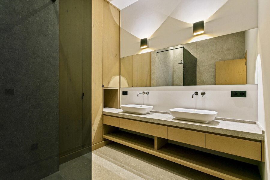 De ruime master-bedroom met ingemaakte dressing heeft ensuite een badkamer met design-ligbad, inloopdouche en een dubbele wastafel. De tweede slaapkamer werd eveneens voorzien van ingemaakt kastenwerk en heeft een rechtstreekse toegang tot de tweede badkamer met inloopdouche en dubbele wastafel.