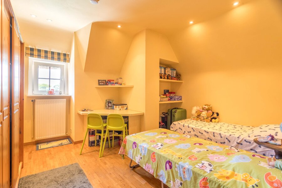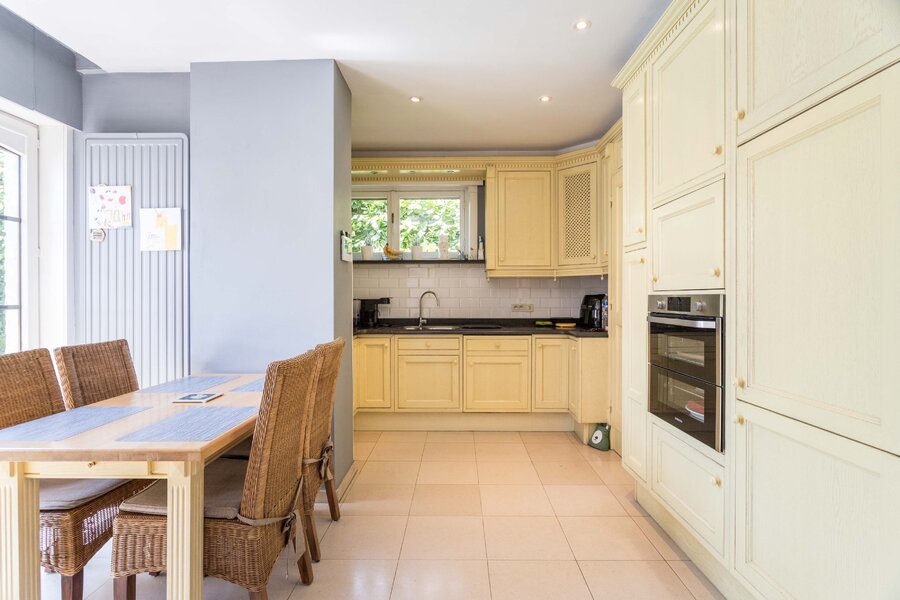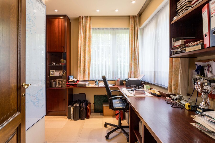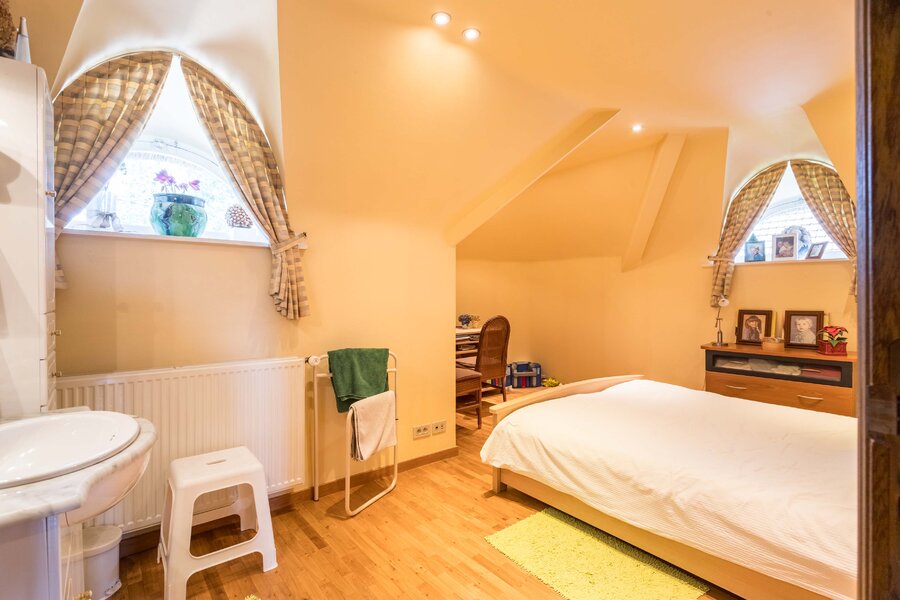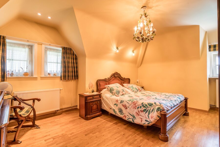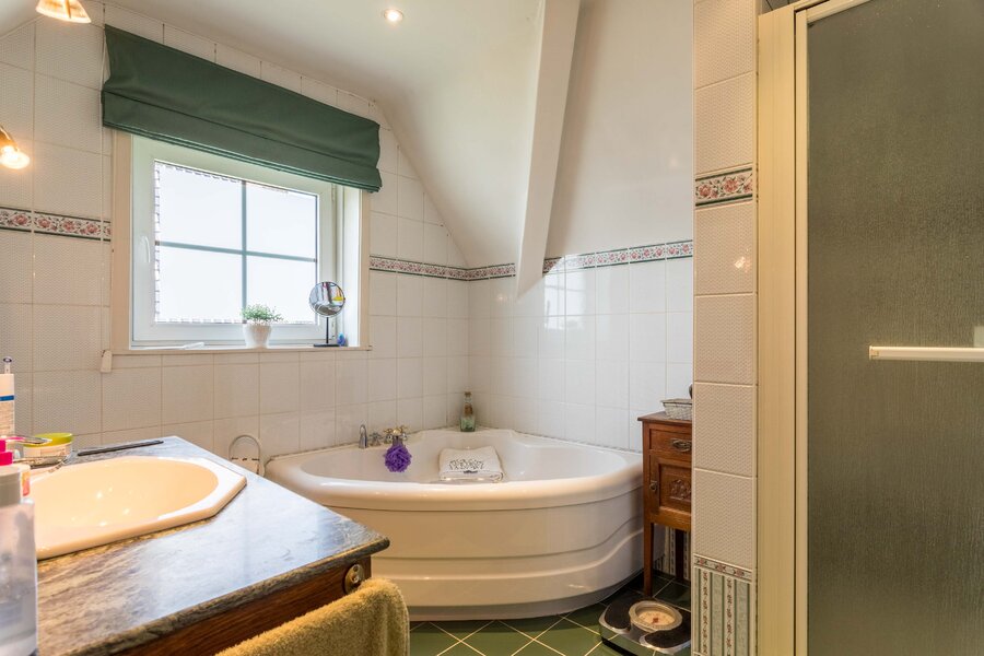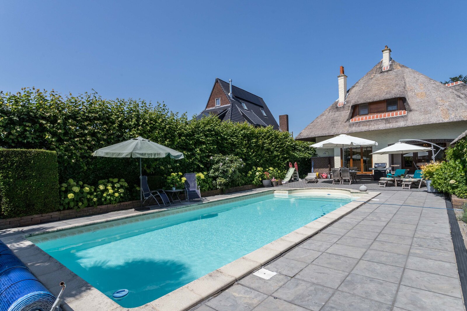Indeling: Bij binnenkomst in de inkomhal met apart gastentoilet kan u rechts een bureauruimte vinden. Verder treft u de lichtrijke leefruimte met aanpalend de volledig uitgeruste keuken. Het eerste verdiep herbergt 3 ruime slaapkamers en de badkamer met douch, ligbad en toilet. Deze villa beschikt ook nog over een kelder en zolder. In de zuid gerichte tuin kan u genieten van de zon of het verwarmde zwembad (met recent vernieuwde warmtepomp). Zoekt u veel parkeerplaats? Dan is deze villa zeker iets voor u, met zijn 2 garages en diverse staanplaatsen heeft u voldoende plaats.