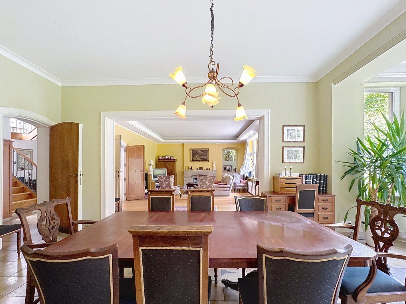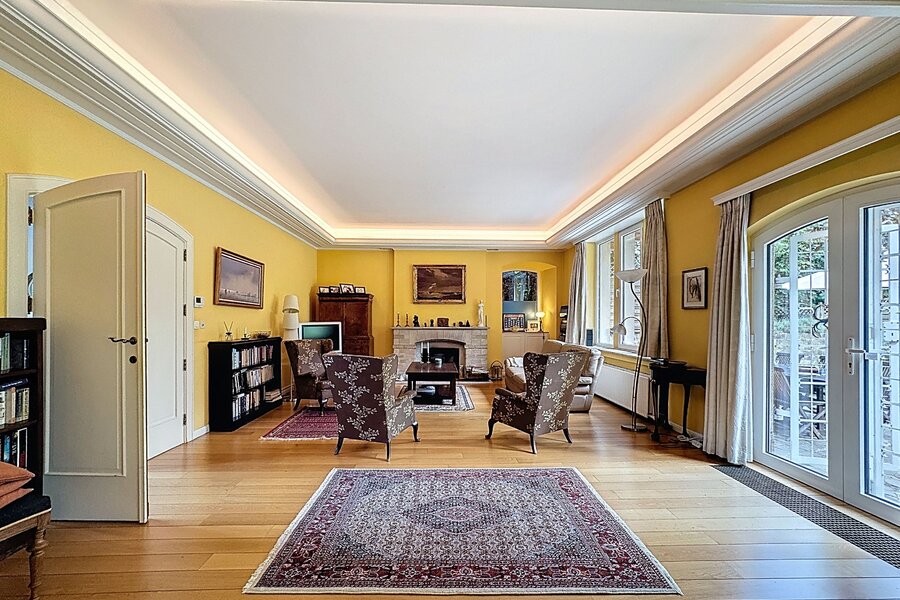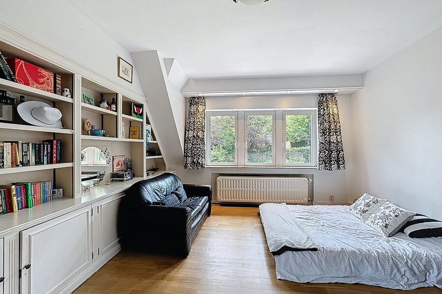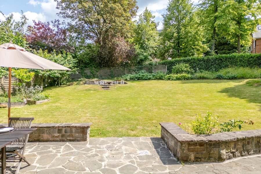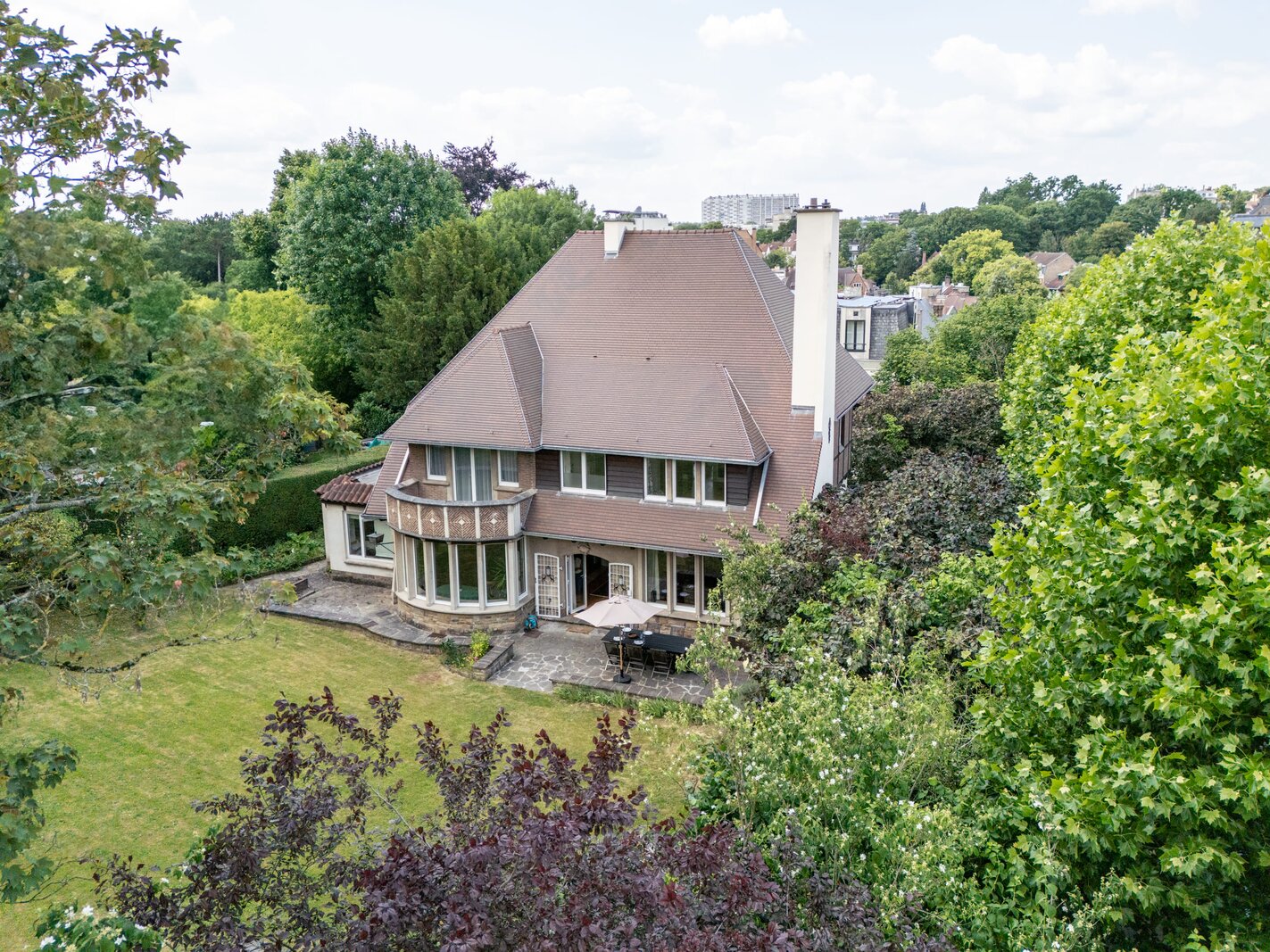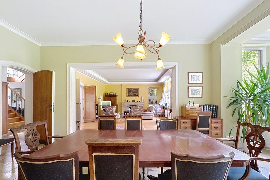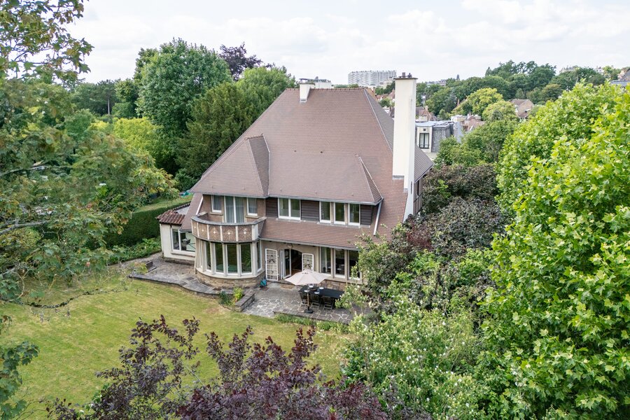 Deze karaktervolle woning ligt in het hart van een lommerrijke wijk in Ukkel en heeft een ritmische gevel van 15 meter. De villa heeft een totale oppervlakte van ongeveer 585 m² en ongeveer 335 m² woonruimte verdeeld over twee verdiepingen en geeft uit op een elegante entreehal met een origineel trappenhuis dat de toon zet. De begane grond beschikt over een grote woonkamer met open haard, aangrenzende eetkamer, aparte familiekeuken met aparte bijkeuken, studeerkamer, gastenslaapkamer met eigen badkamer en apart toilet. Er is ook de mogelijkheid om een ruimte te creëren voor een vrij beroep, dat profiteert van een aparte ingang.