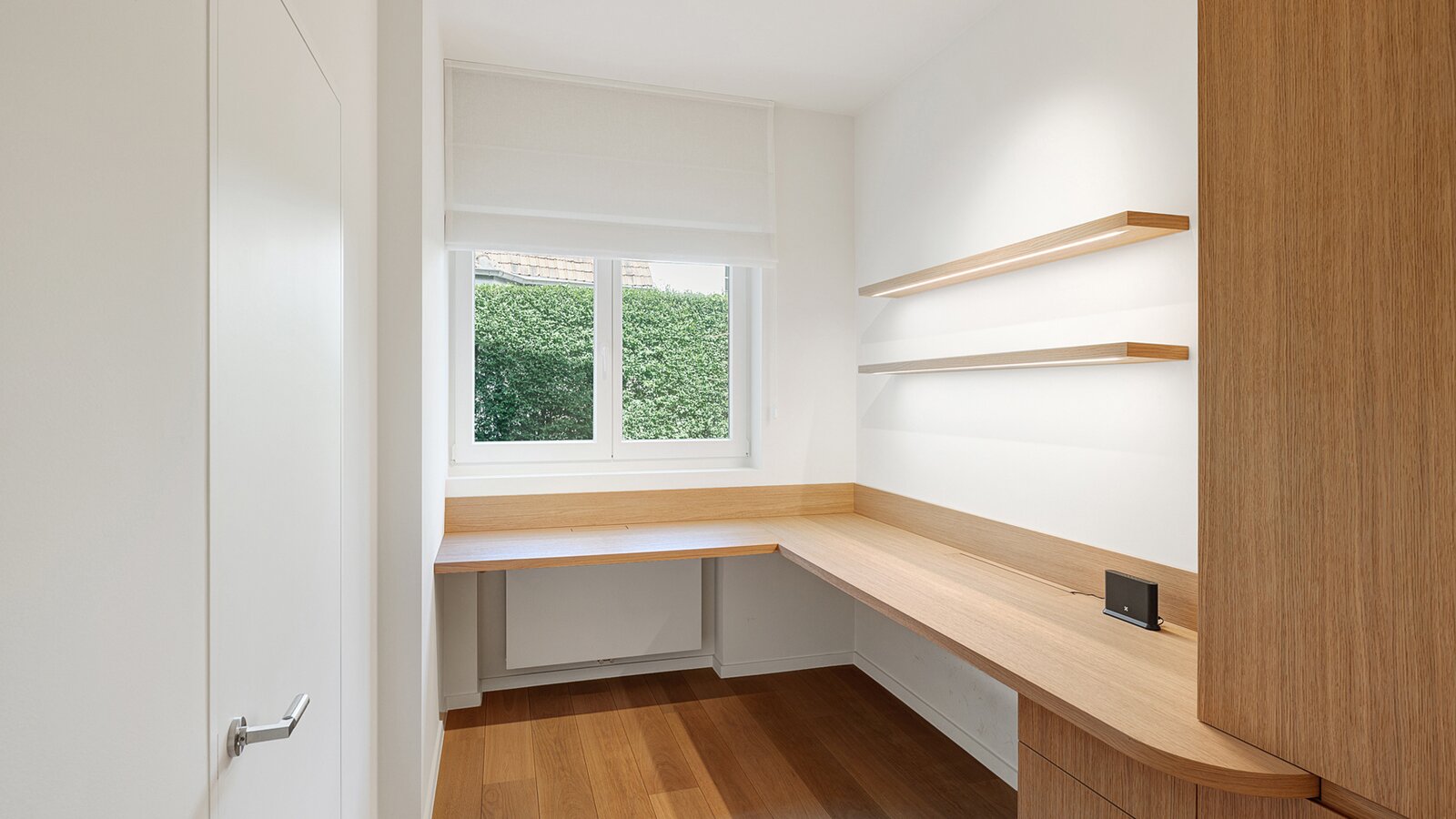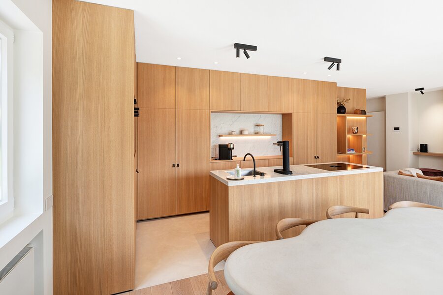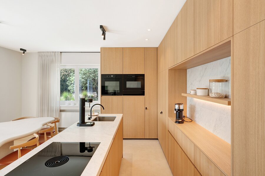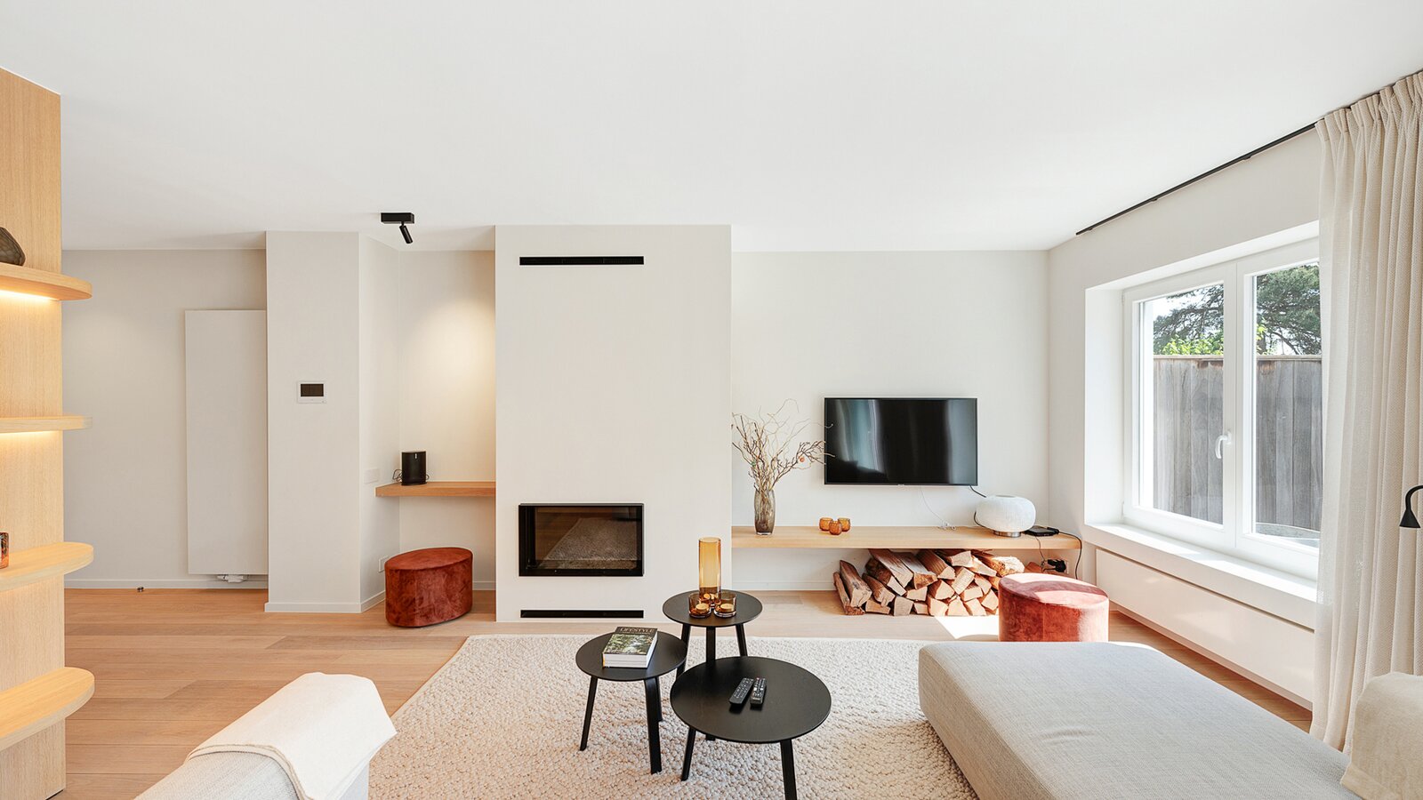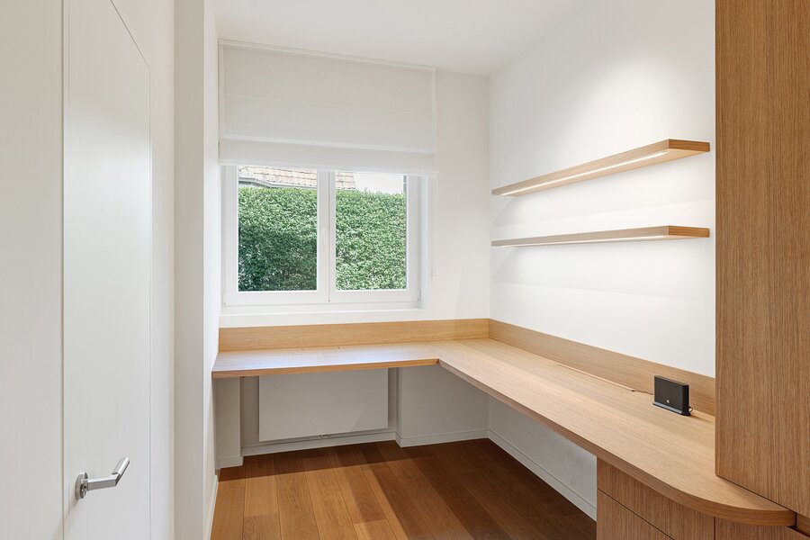 Afwerking: top kwalitatieve renovatie. Interieur in zachte lichte tinten, combinatie van eik fineer, carrara marmer, beton ciré en geolied eik parket. Open haard op hout, subtiele verlichting, Bticino domotica en schakelmateriaal. Overal rolluiken. Tuin door Dominique Eeman met automatische besproeiing.