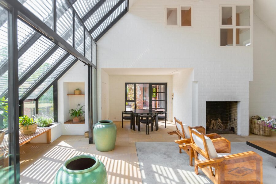 Sfeervolle eetkamer en XL woonkamer met open haard en volop natuurlijk licht dankzij de enorme raampartij tot in de nok van het dak met daarachter een fijne wintertuin. Pianohoek én de originele bridge corner (aparte bar voor een drankje tijdens het spelen inbegrepen).
