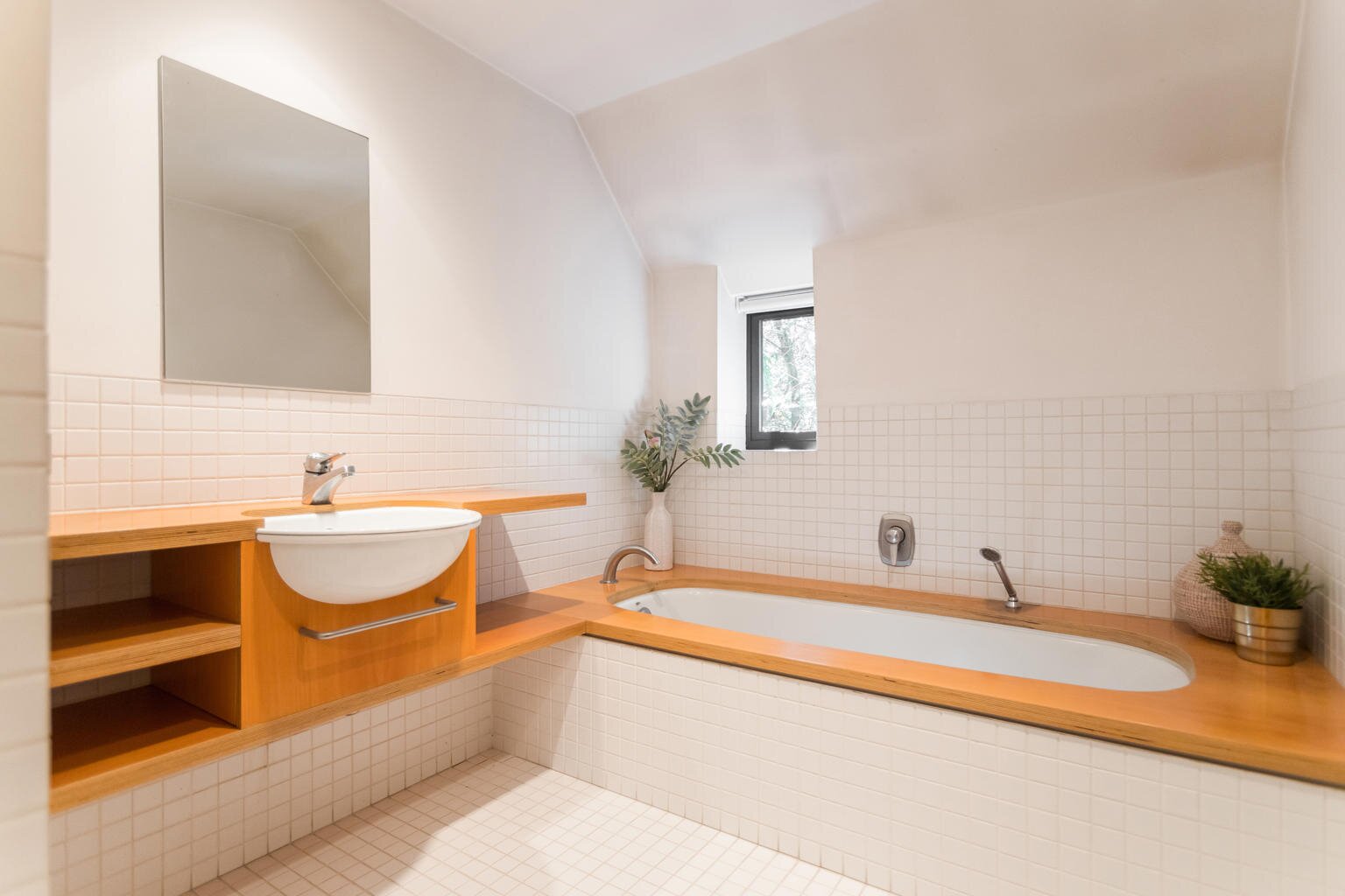 Open trap naar de 1ste verdieping met riant bureau en master bedroom met dressing en ingebouwde make-uptafel van de hand van Claire Bataille, badkamer met dubbele wastafel, ligbad en douche. Uitzonderlijk: de oorspronkelijke meubels van Claire Bataille – gerenommeerd Belgisch interieurontwerpster, bekend om haar zuivere esthetiek – kunnen bij de woning worden aangekocht.