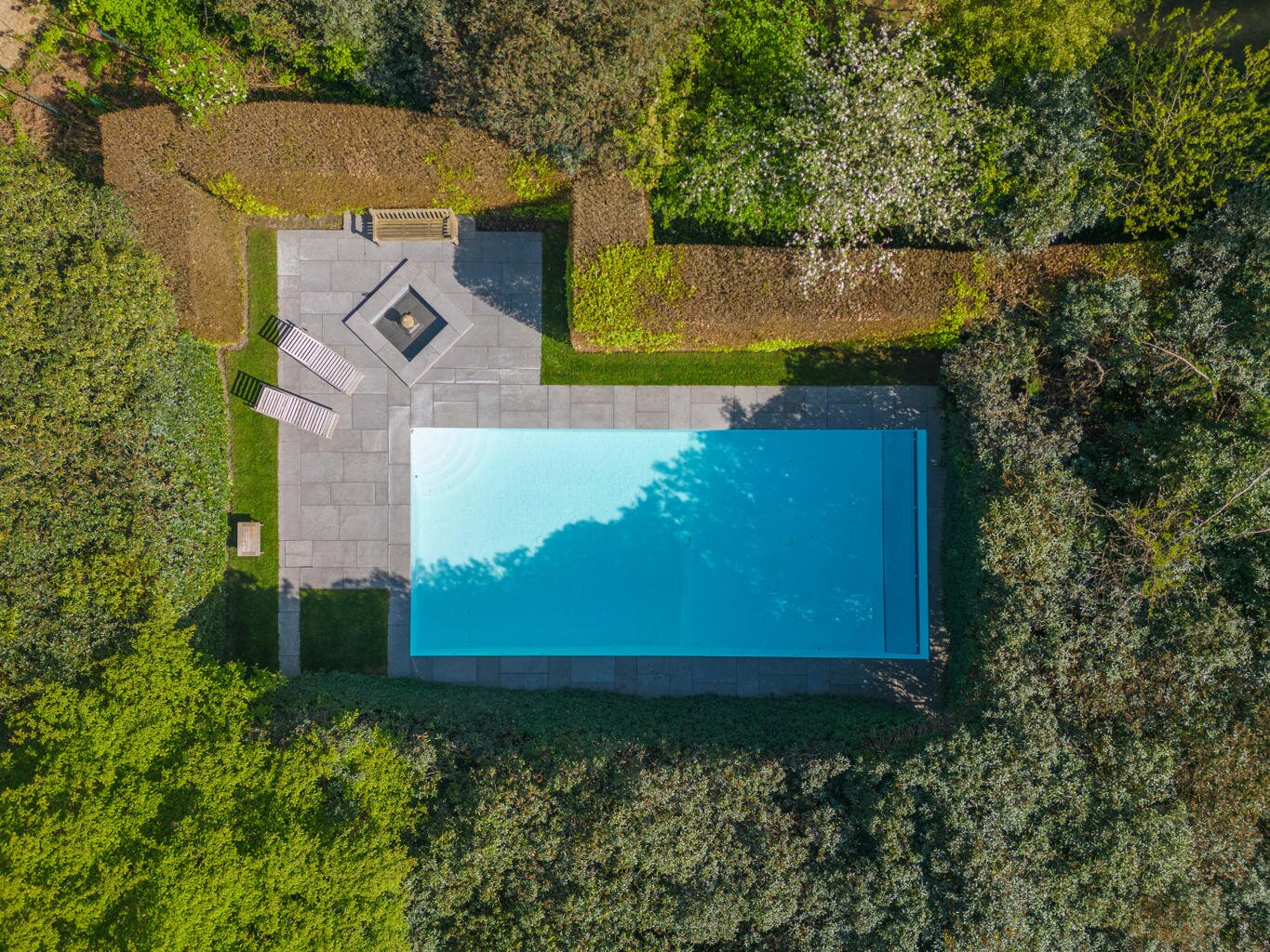 Giga Amerikaanse keuken met veel kast- en werkruimte en mooi tuinzicht tijdens het koken of aperitief aan het grote, gezellige eiland. Vaste trap naar de kelder. Prachtige, door Wirtz aangelegde tuin met volgroeide beukenhagen en rododendrons, waar bauwe natuursteen het heerlijke zwembad omzoomt.