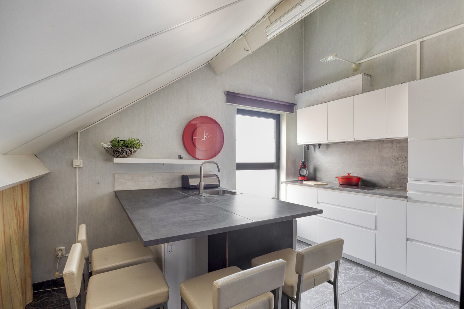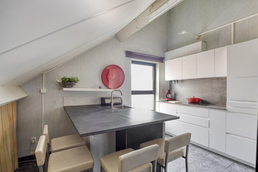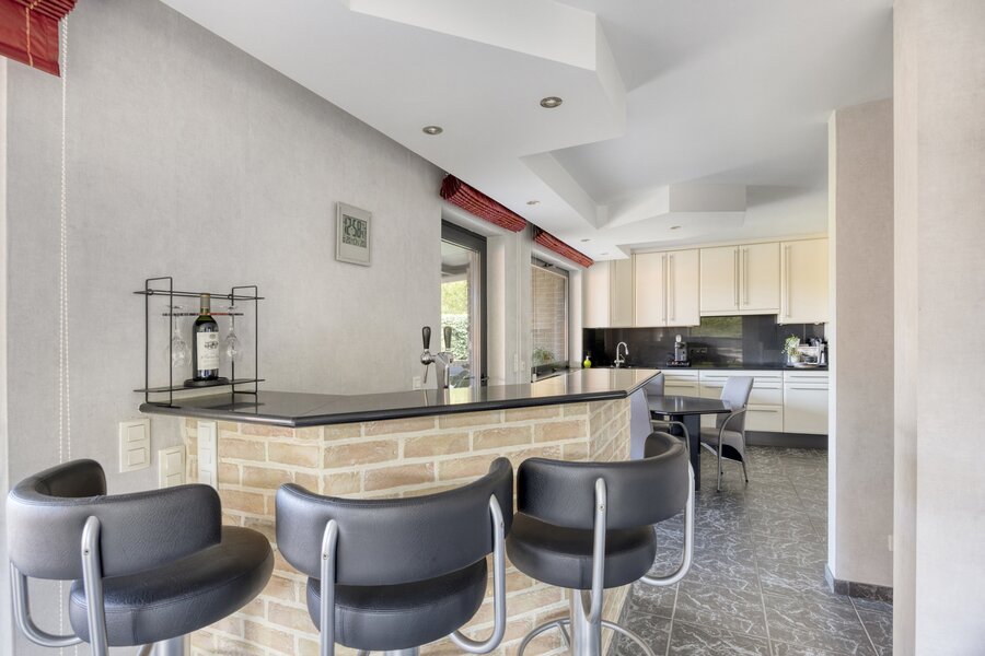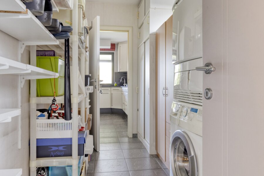 De ruime keuken met eethoek, afgewerkt in natuursteen, straalt luxe uit en is uitgerust met alle comfort. Daarnaast is er een praktische berging/wasplaats.