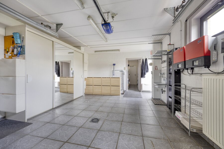 Er is een inpandige garage met elektrische sectionaalpoort en afgietbak, en aan de voorzijde zijn vier autostaanplaatsen voorzien.