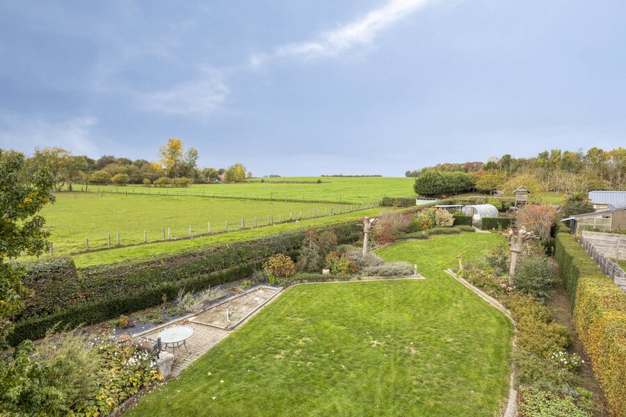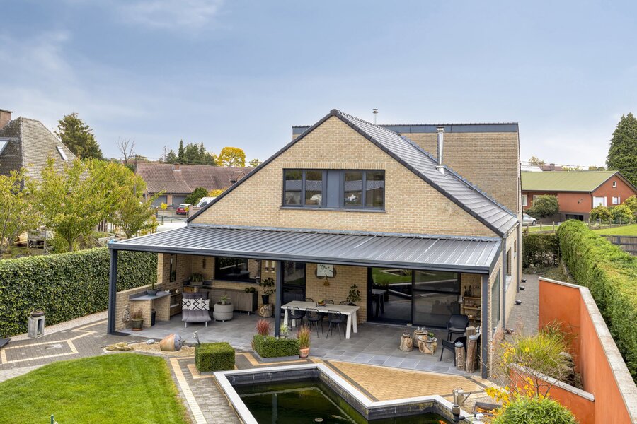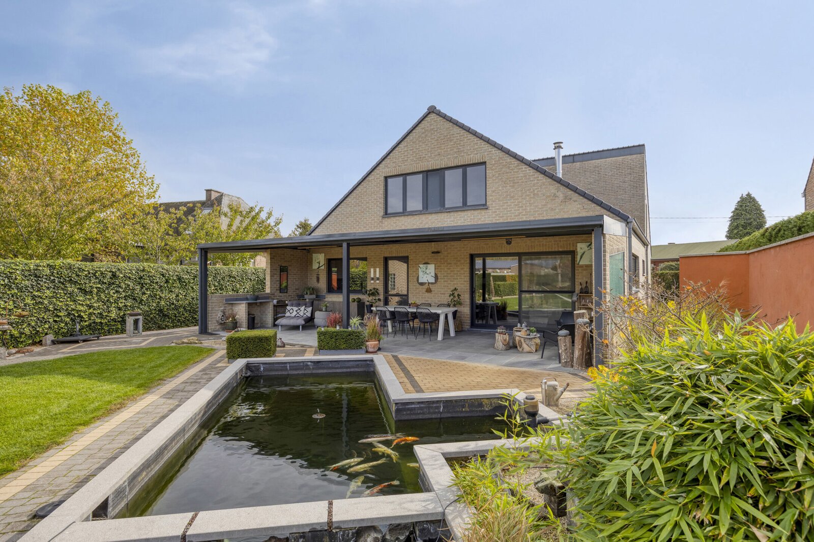 De buitenruimte is al even uitnodigend: een ruim terras met pergola en sier/zwemvijver, omringd door een zorgvuldig aangelegde tuin met tuinberging – een plek waar je in alle rust kan genieten van de landelijke omgeving.