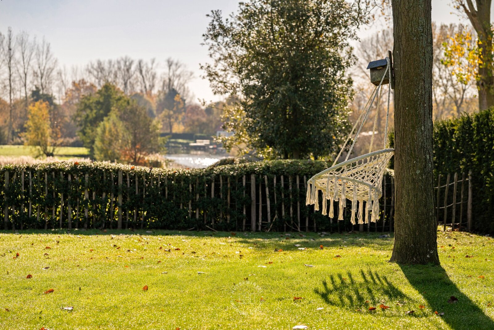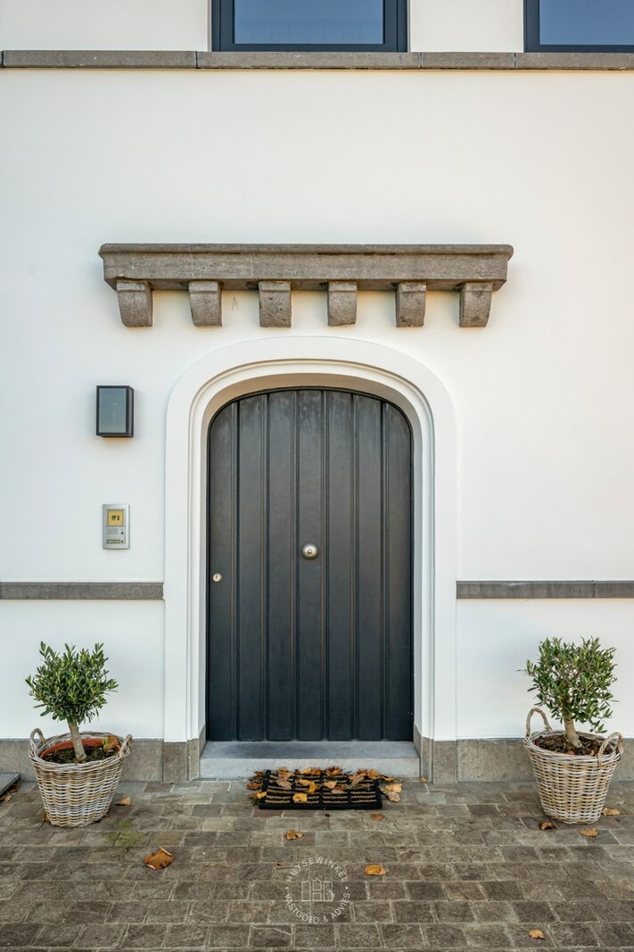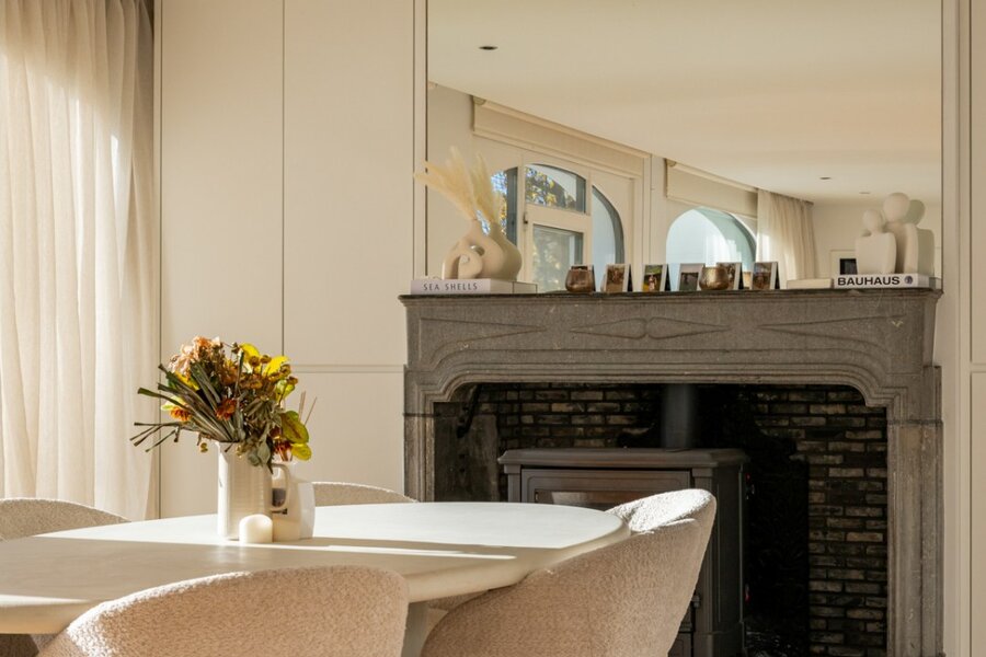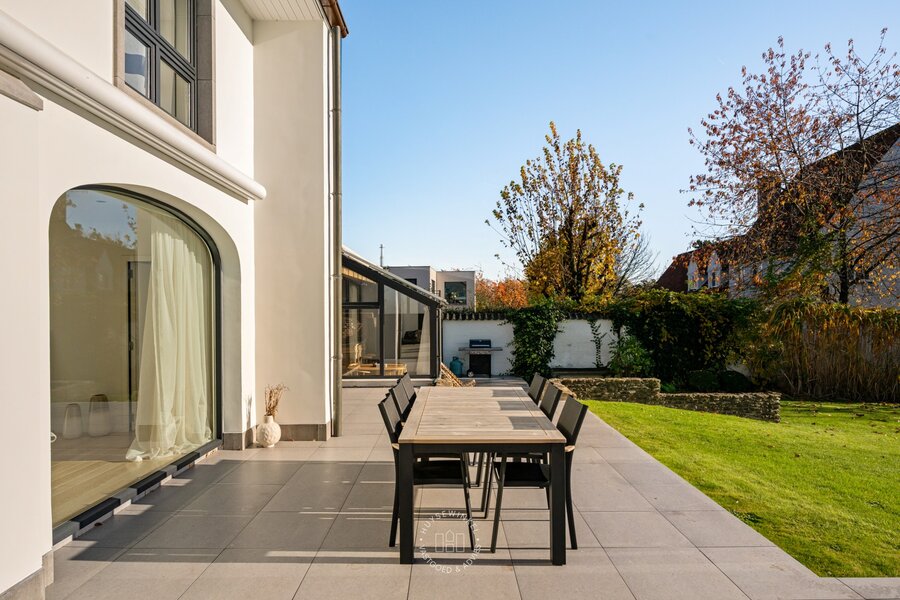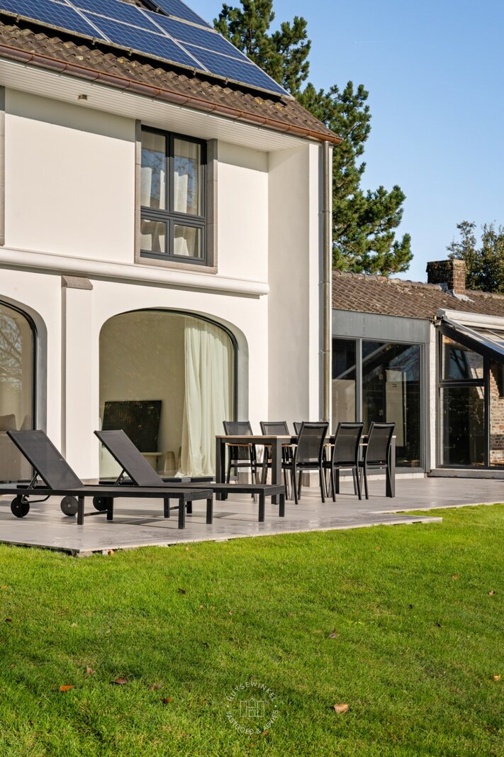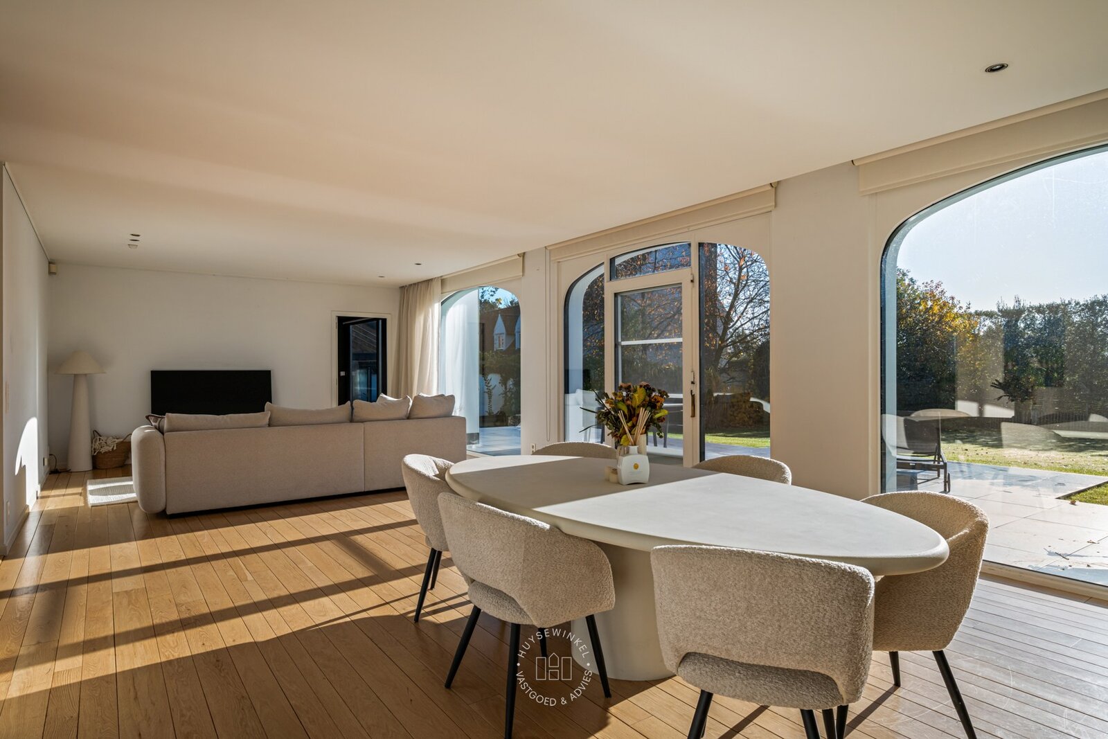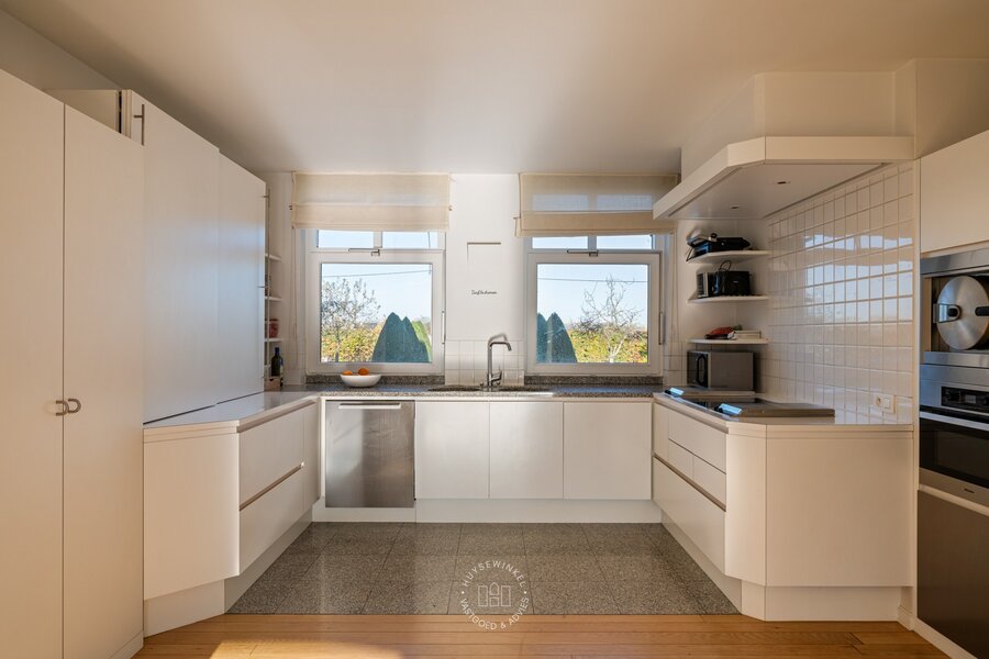 Men betreedt de woning langs de charmante inkomhal die reikt over de twee verdiepingen. De leefruimte, voorzien van parket en haard, bevindt zich achteraan en kijkt uit over de prachtige tuin met zuidgericht terras waar het uiterst aangenaam vertoeven is. De open keuken is voorzien van Miele toestellen en kan indien gewenst afgesloten worden met schuifdeuren. Aansluitend vinden we een dubbele garage terug. Er is nog een losstaande fietsenberging/tuinhuis aanwezig, alsook een kelder.