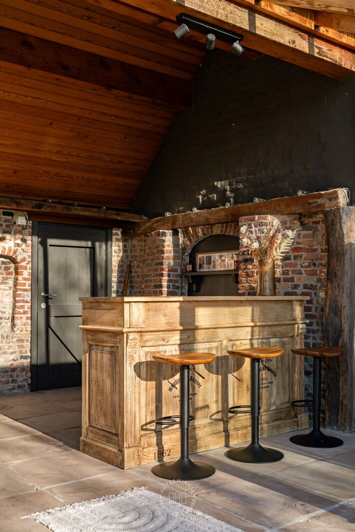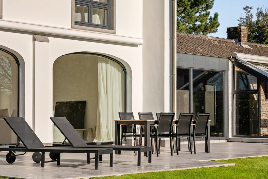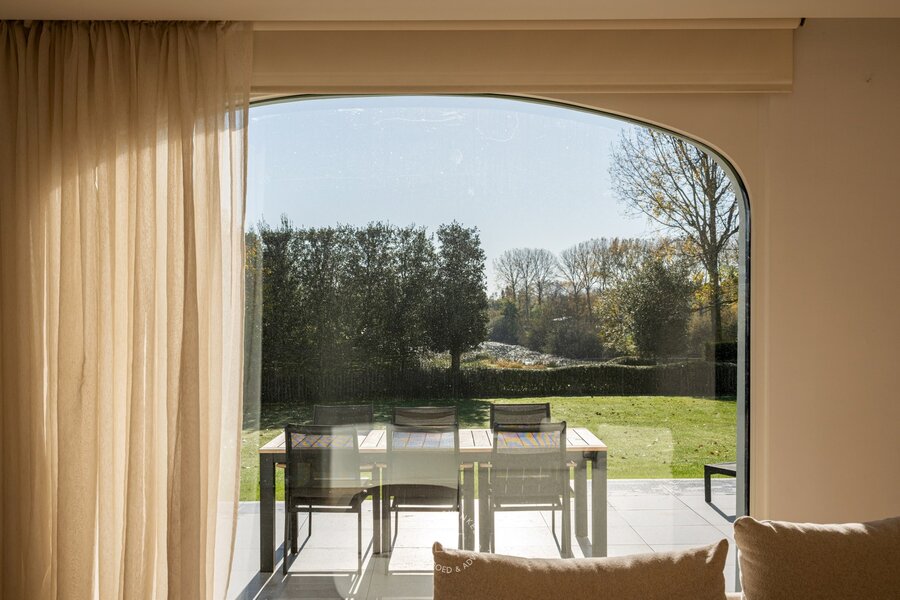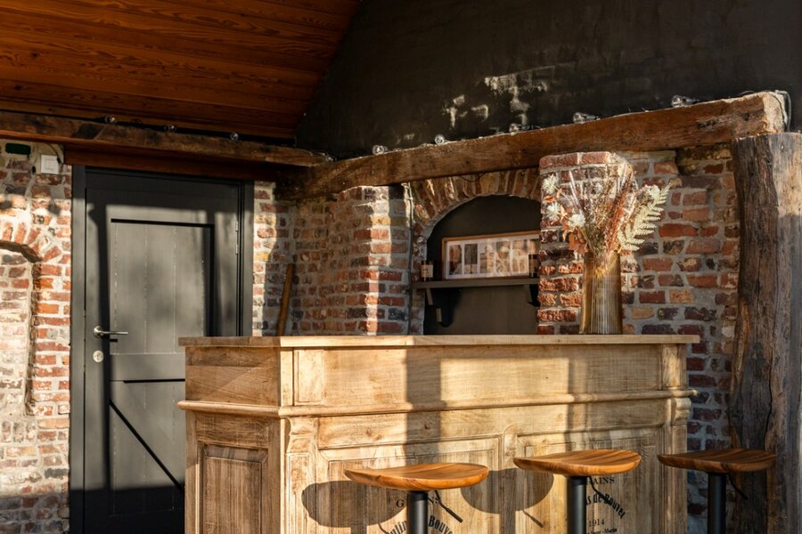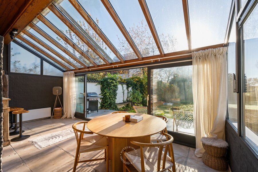 Vanuit de leefruimte hebben we toegang tot het bijgebouw dat als bureauruimte of ontspanningsruimte kan gebruikt worden. Dankzij de grote raampartijen staat deze in verbinding met de tuin. Er is ook een aparte toegang.