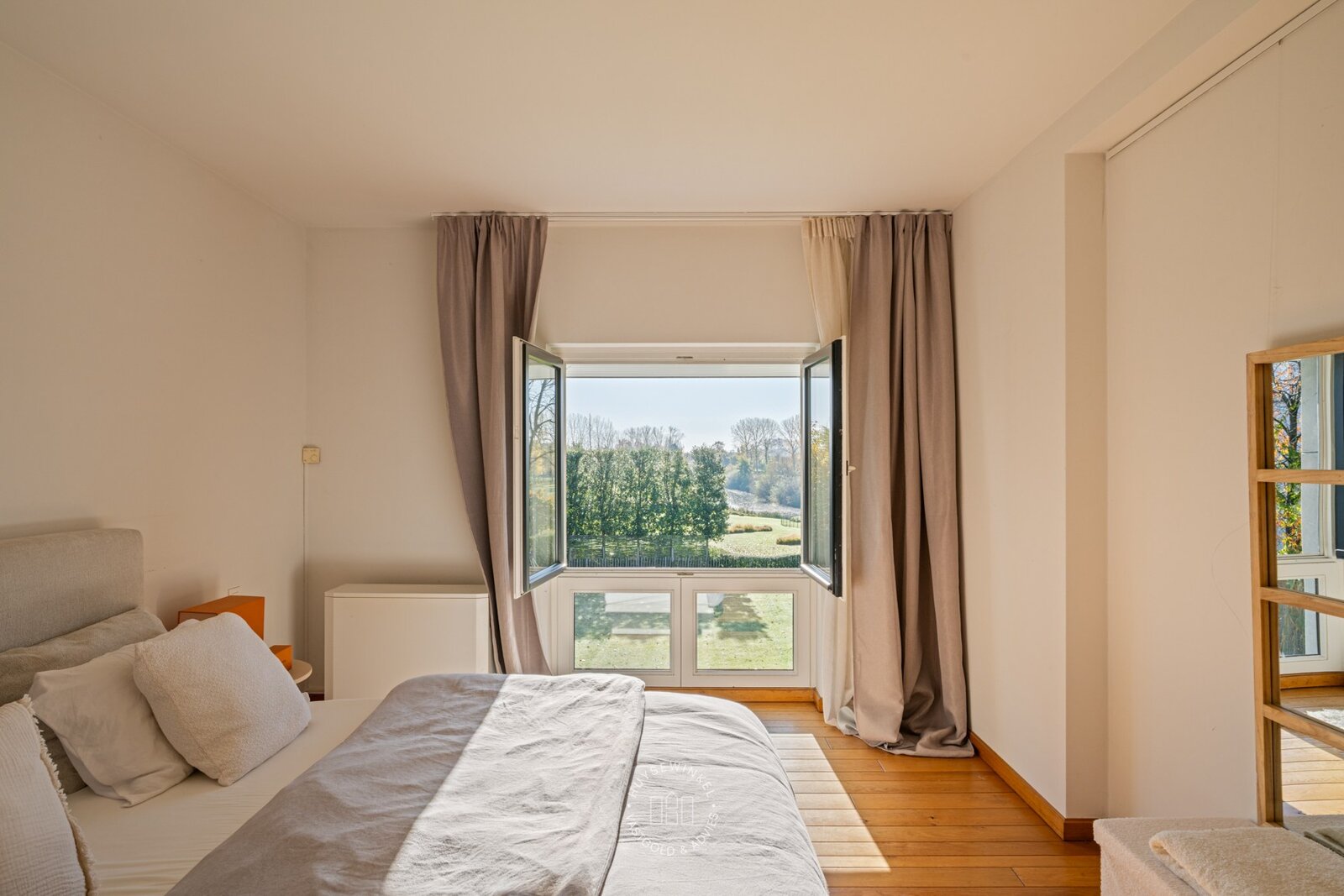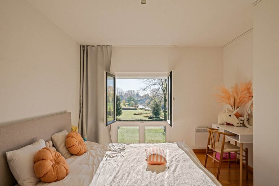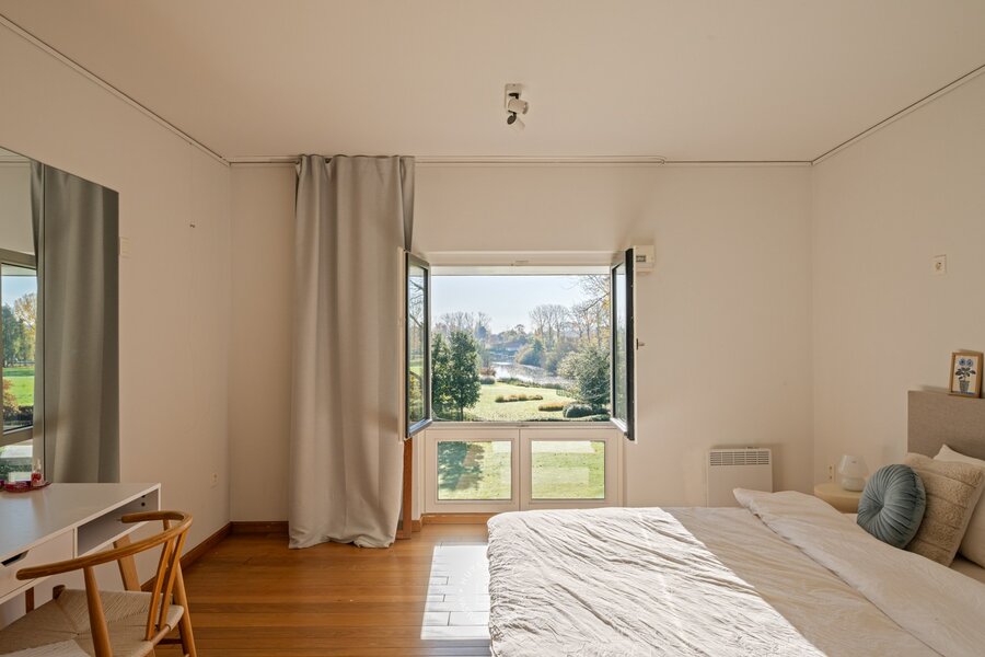 Op de bovenverdieping vinden we drie slaapkamers terug, opnieuw met zicht naar de tuin en Oude Leie. waarvan een met aansluitende dressing en badkamer met ligbad en dubbele lavabo. Verder is nog een douchekamer voorzien.