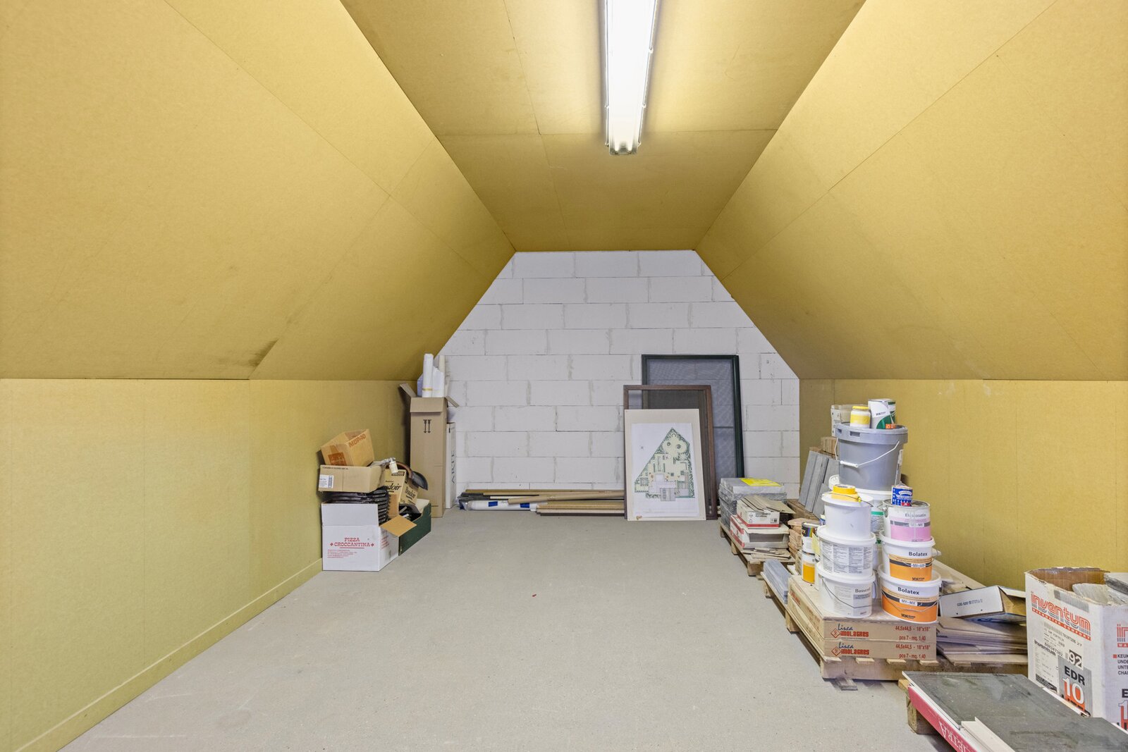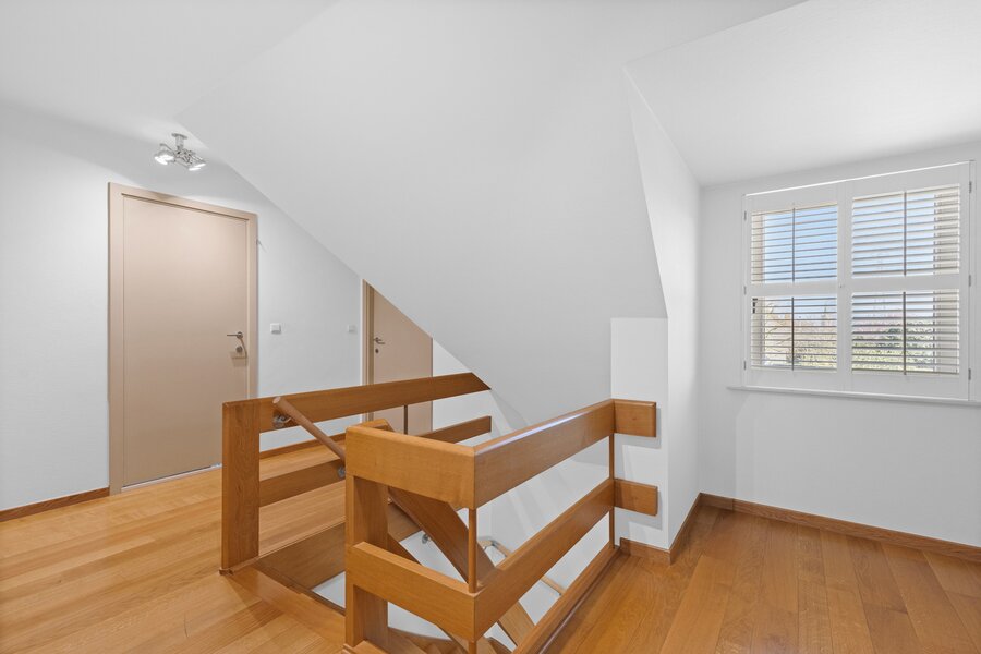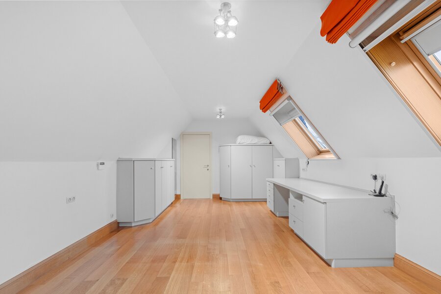 Op het verdiep vinden we de master bedroom, grote badkamer (bubbelbad, douche, dubbele lavabo en toilet), tweede slaapkamer met bureau en dressing, derde slaapkamer en een apart toilet (voorheen een douchekamer). Boven de garage bevindt zich nog een zolderruimte bereikbaar via een vaste trap.