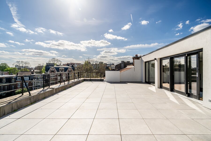 In de directe omgeving van het Montgomery-plein, in een huis vermeld in de architectonische inventaris van Brussel, volledig gerenoveerd duplex appartement met een bruto oppervlakte volgens PEB van 210 m ² met drie slaapkamers, een kantoor en een groot terras.