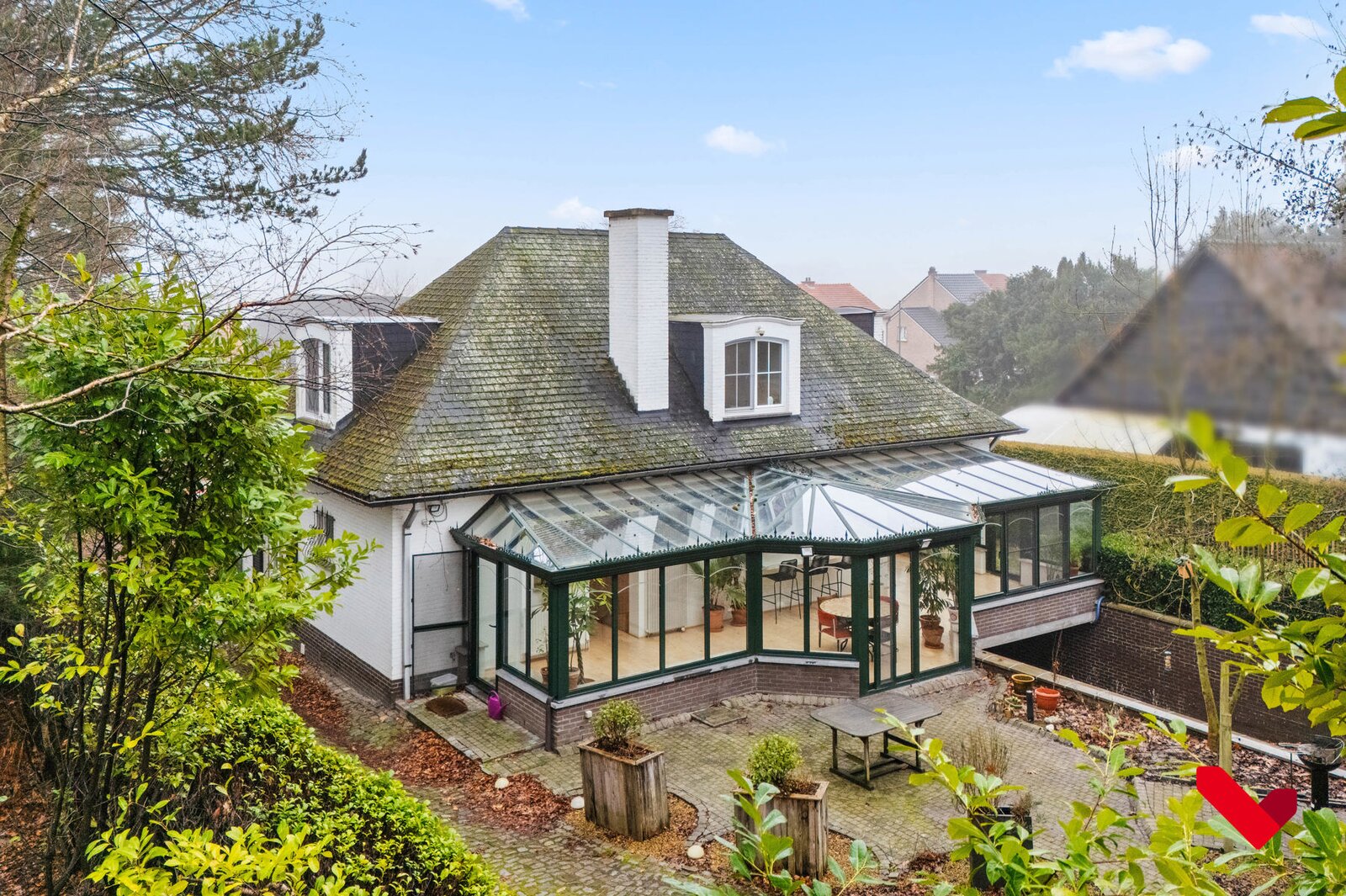 In een groene omgeving nabij het dorpscentrum van Lubbeek, bevindt zich deze uitzonderlijk ruime en lichtrijke villa.