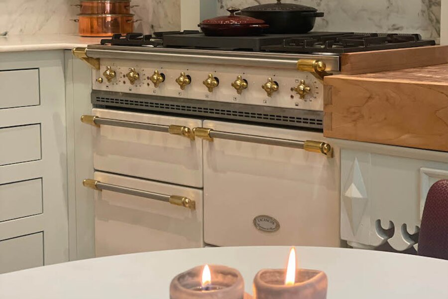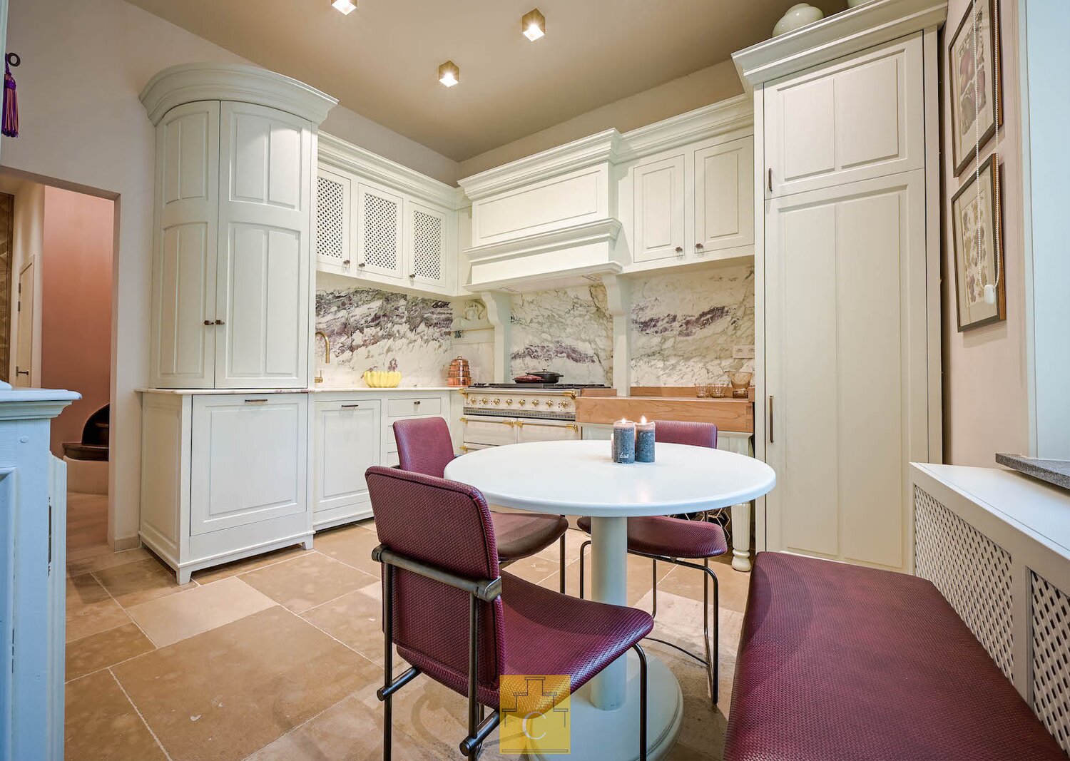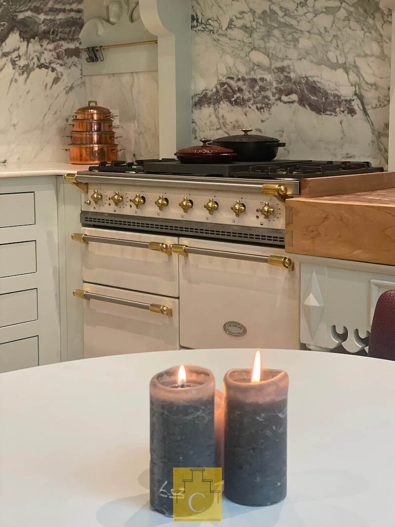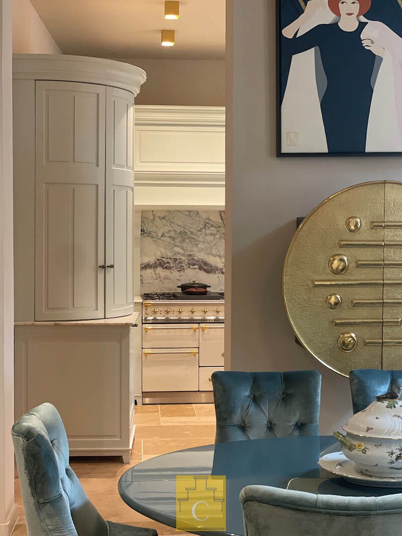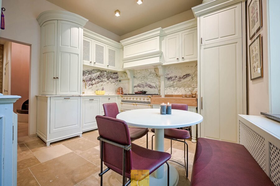 De maatwerk keuken werd uitgevoerd met oa marmer en kwalitatieve toestellen. Hier is plaats voor een eettafel, waardoor koken en tafelen naadloos samenkomen. De aparte bijkeuken/wasplaats is praktisch en eveneens voorzien van maatwerk kasten.