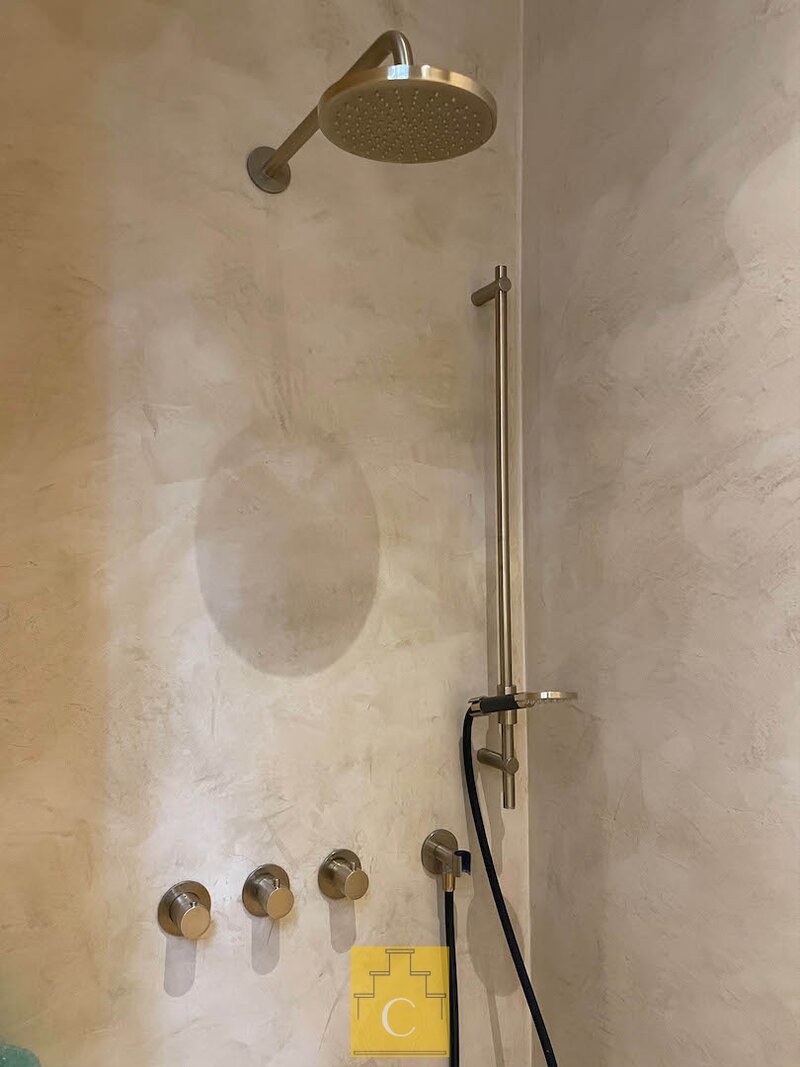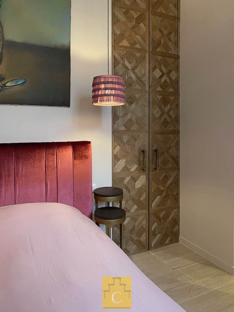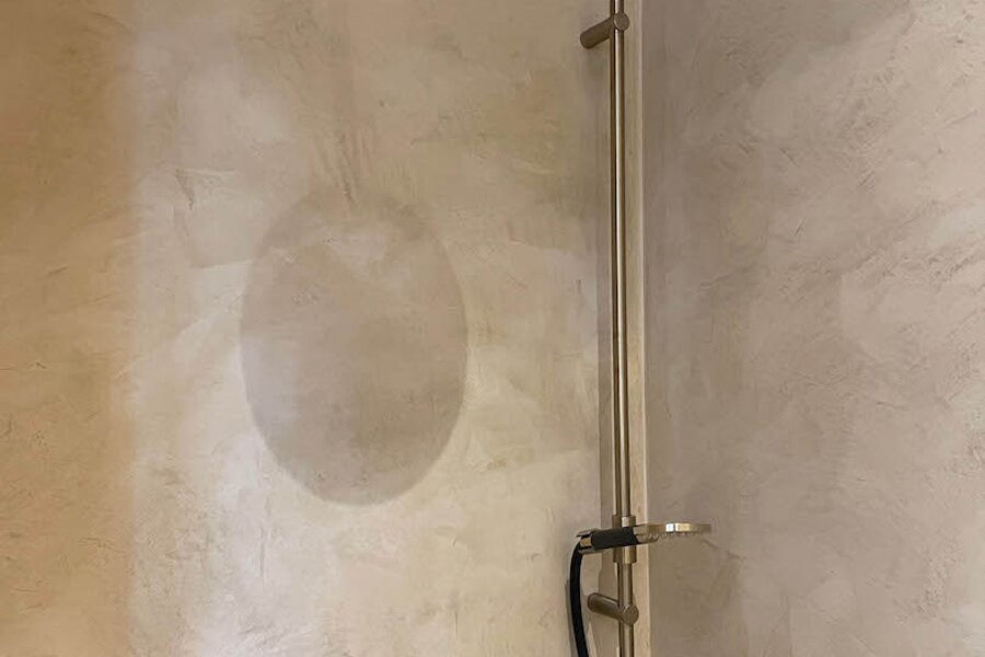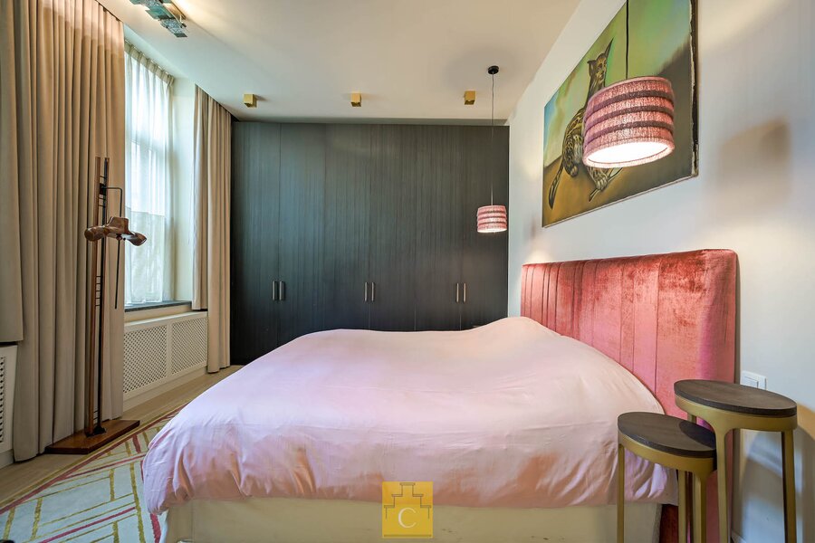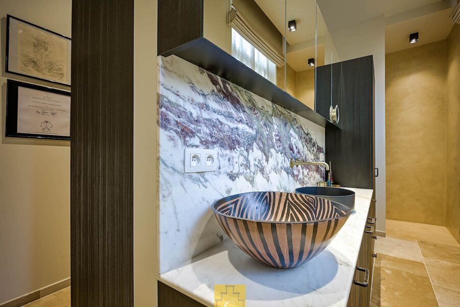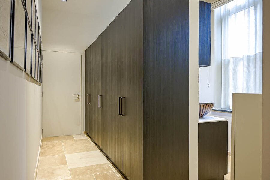 De bijzonder ruime master bedroom beschikt over een kastenwand. De aansluitende dressing en badkamer, eveneens maatwerk, omvat een douche (tadelakt), toilet en lavabo. Ook hier is de afwerking tot in de details doorgetrokken.