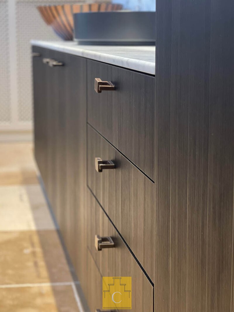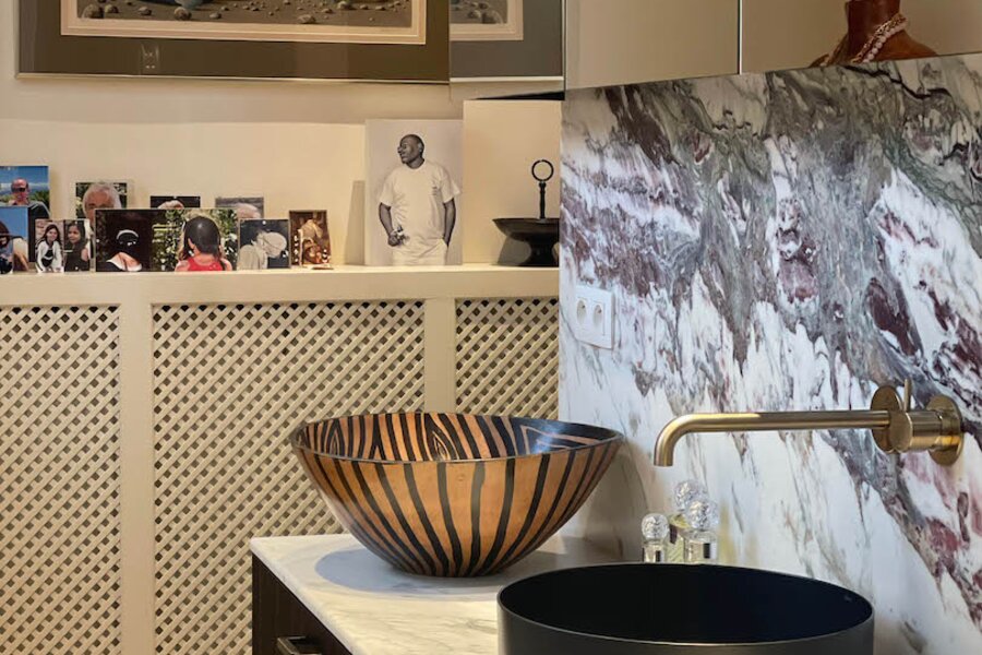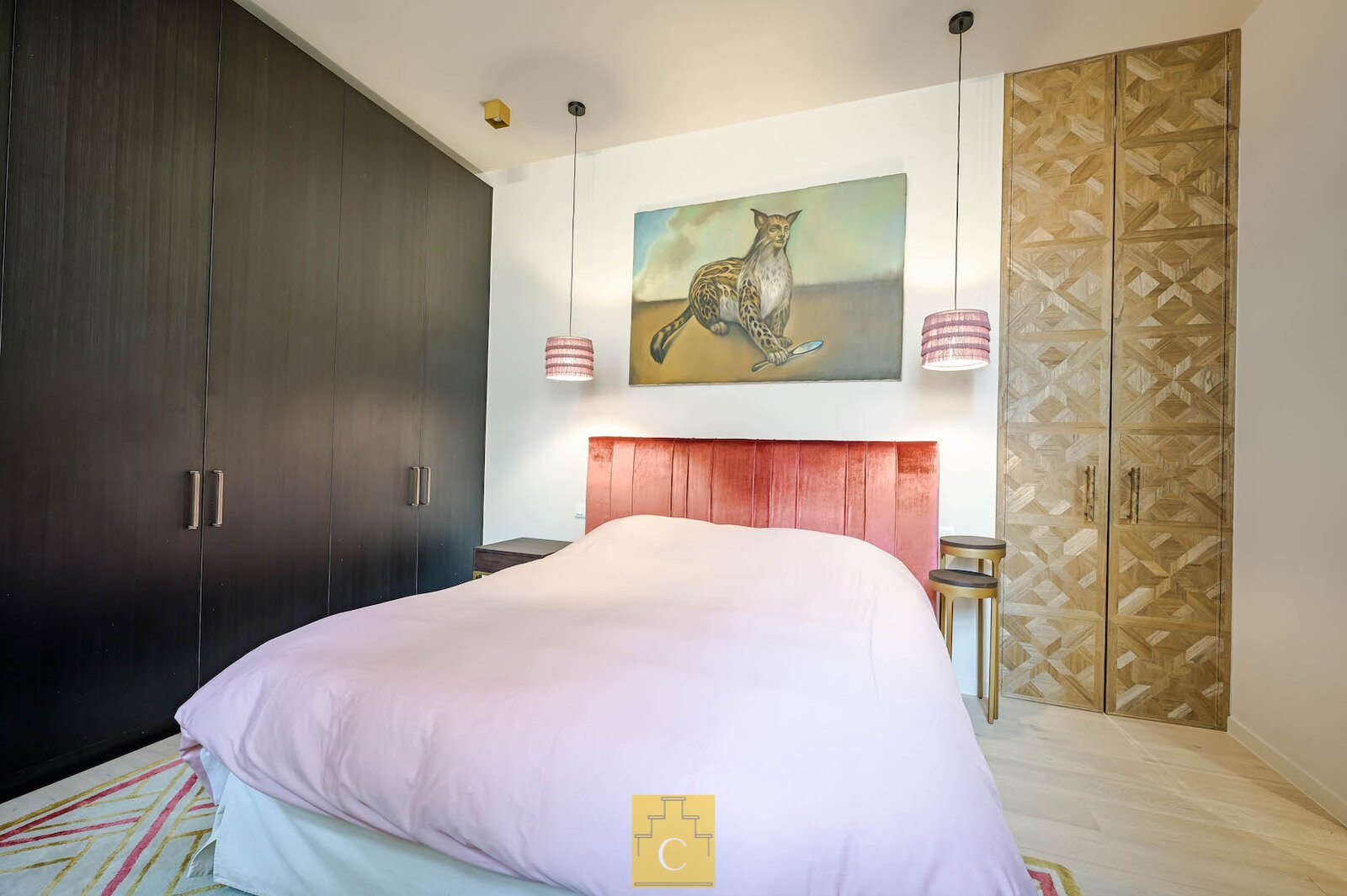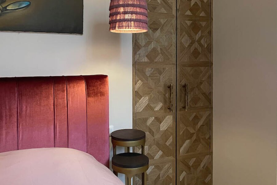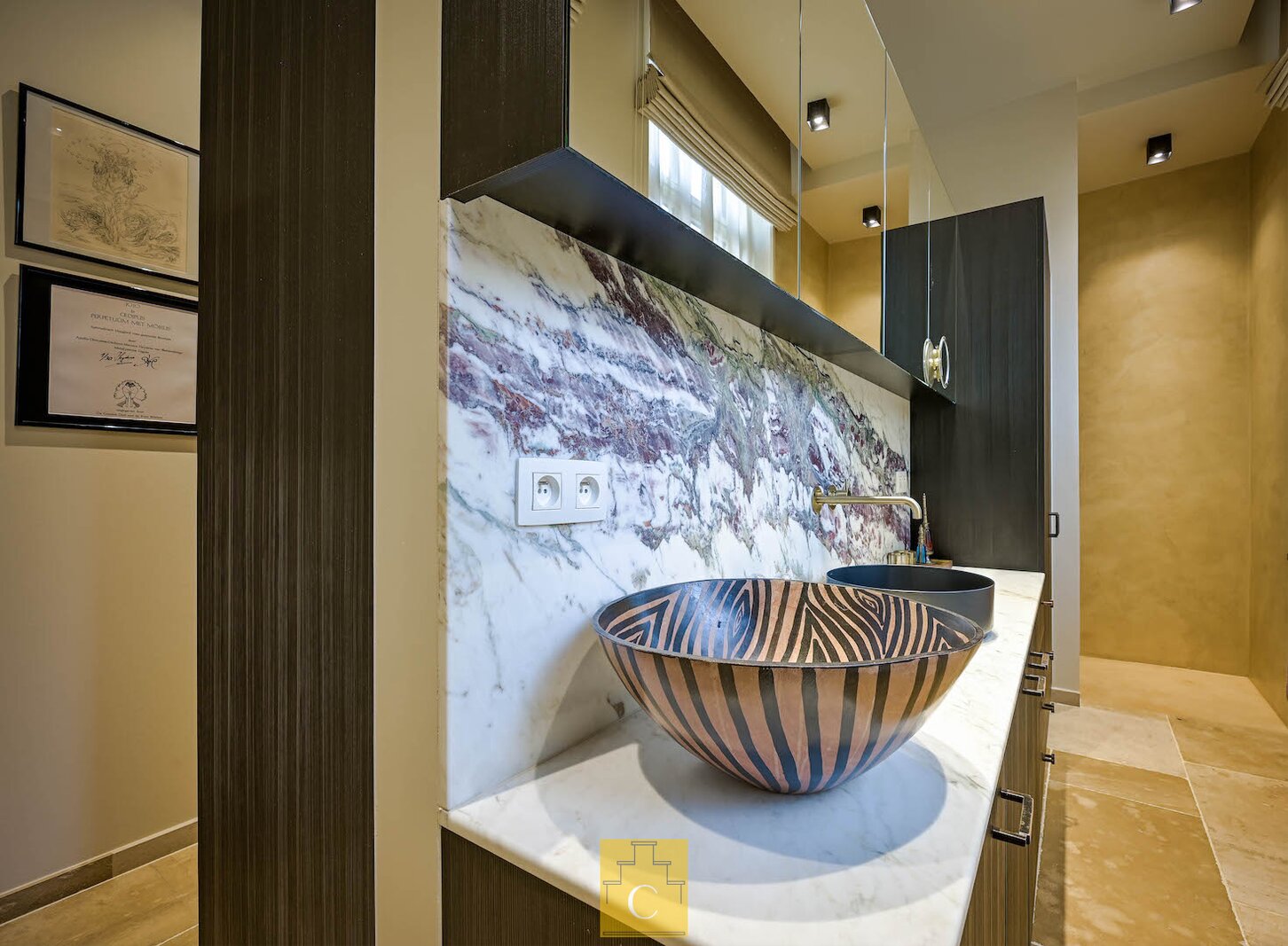 De bijzonder ruime master bedroom beschikt over een kastenwand. De aansluitende dressing en badkamer, eveneens maatwerk, omvat een douche (tadelakt), toilet en lavabo. Ook hier is de afwerking tot in de details doorgetrokken.