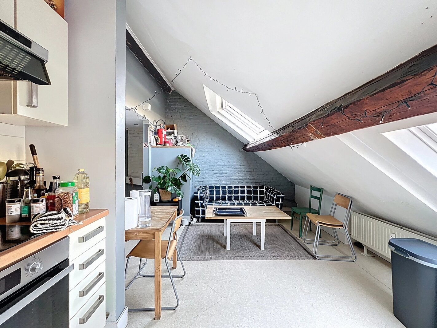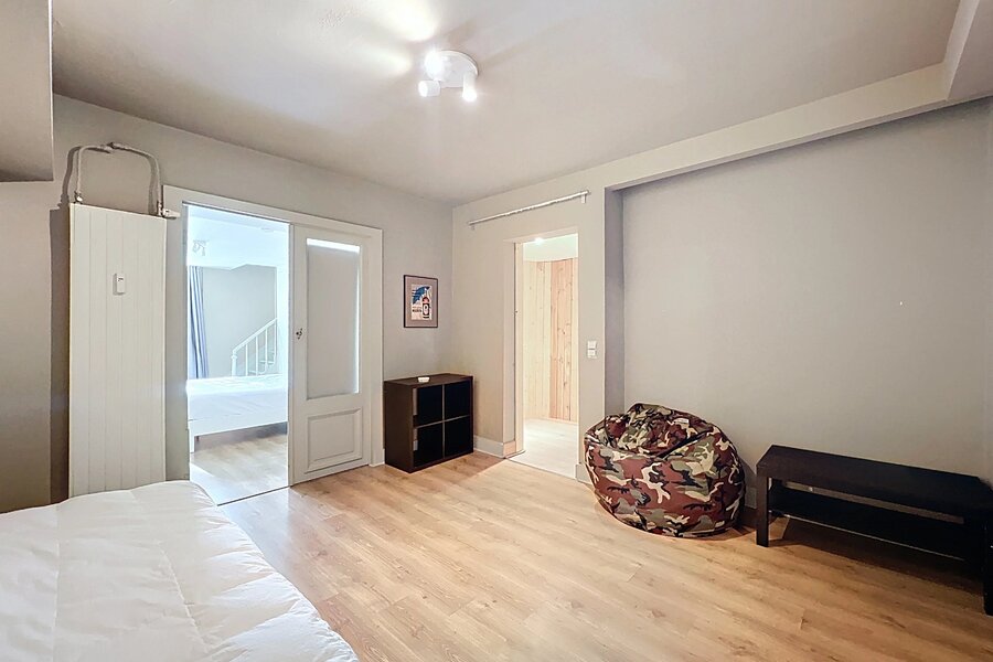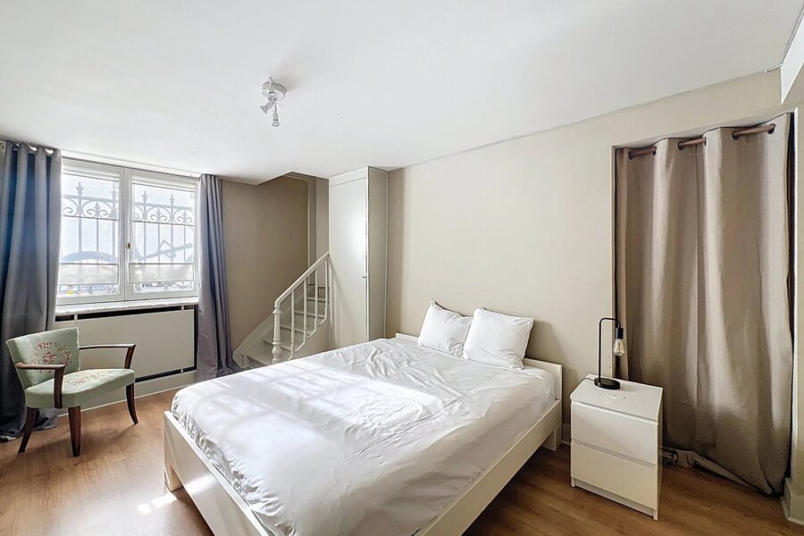 Op de begane grond bevindt zich een duplex van ongeveer 128m2 (bron PEB) met een woonkamer, een keuken met ontbijthoek, twee slaapkamers en een doucheruimte. EPB E+.