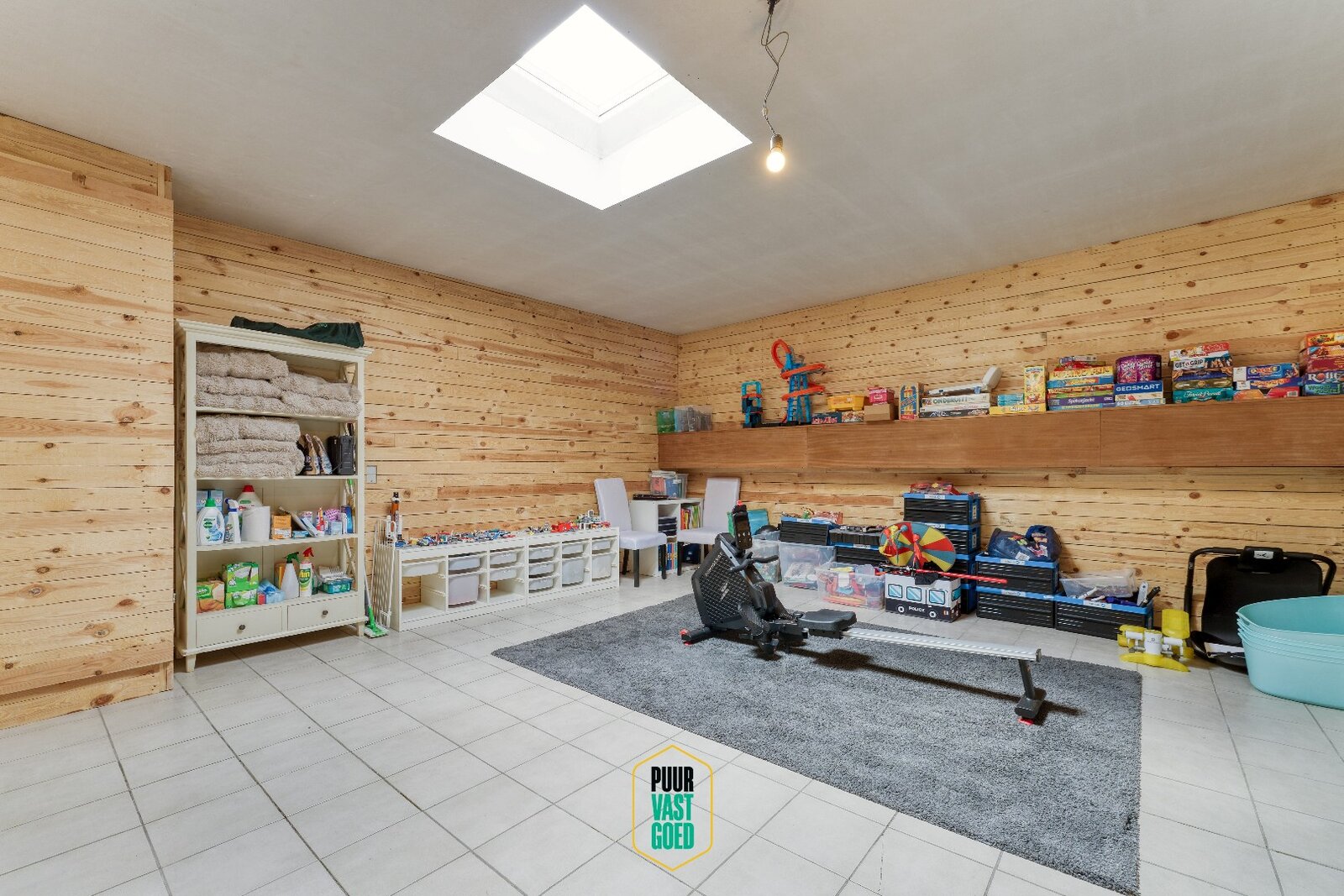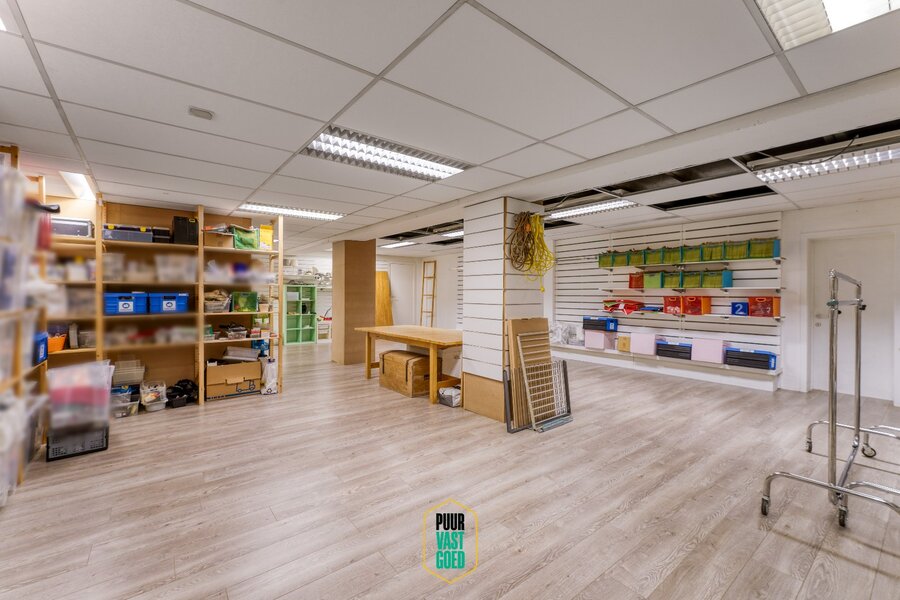 Het gelijkvloers omvat een handelsruimte van ongeveer 500 m², aangevuld met een ruime garage en meerdere opslagruimtes. Boven de opslag is er extra ruimte die kan dienen als atelier, werkruimte of bijkomende berging. De achteruitgang maakt het geheel bijzonder praktisch, zowel voor professioneel gebruik als logistiek.