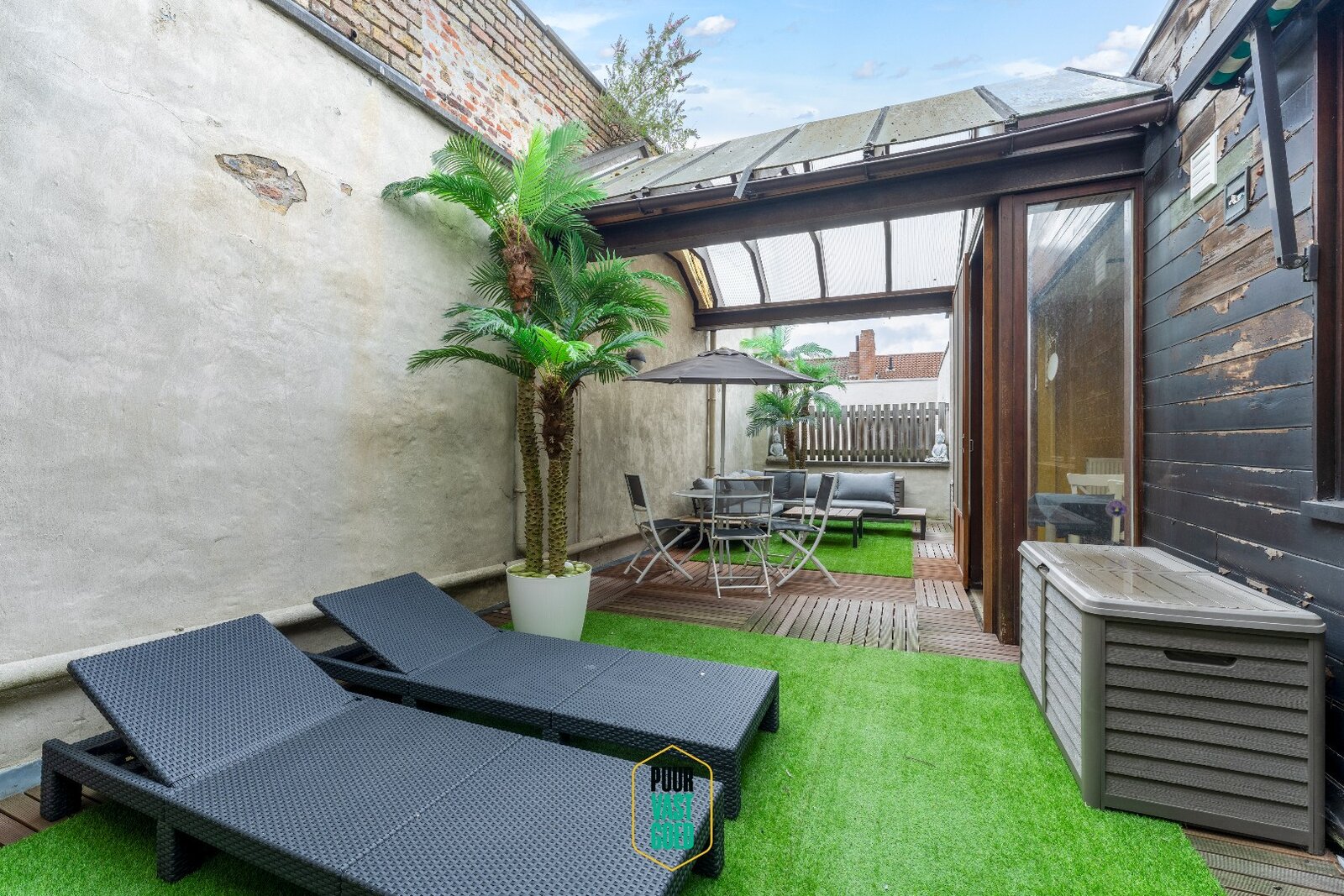 De tweede verdieping telt een vernieuwd éénslaapkamerappartement met open keuken en toegang tot een uitzonderlijk groot dakterras, discreet en rustig gelegen.