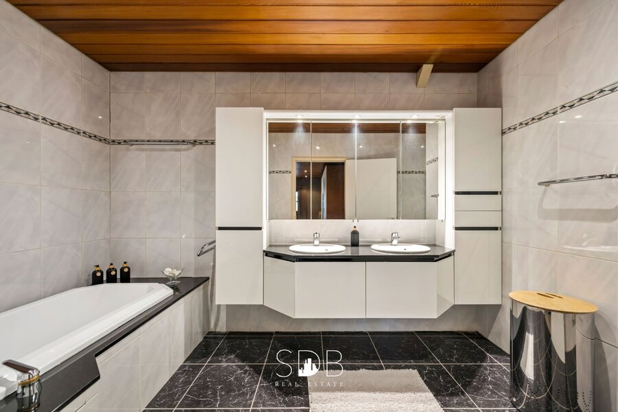 Deze eigentijdse badkamer beschikt over een dubbel lavabomeubel, een ligbad, een zeer ruime douche en een toilet.