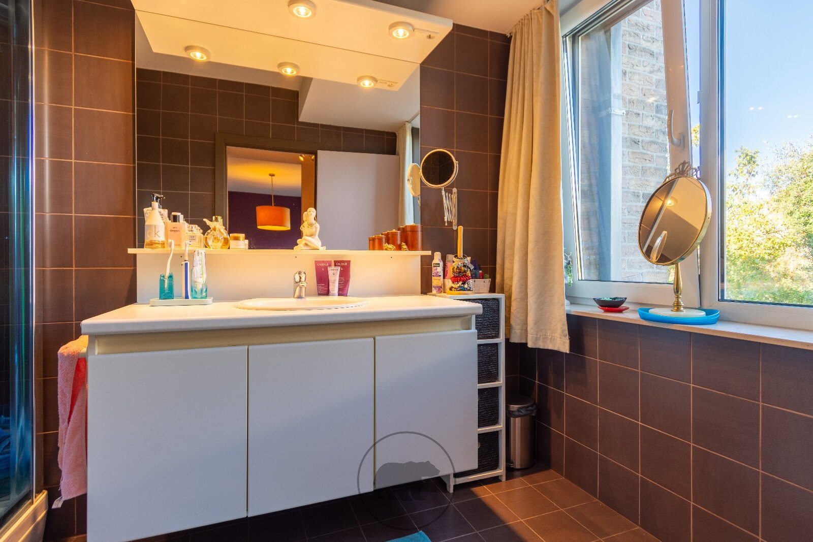 De inkomhal van het privatief appartement heeft een veiligheidsdeur en gastentoilet. Een glazen deur geeft toegang tot de lichtrijke leefruimte met open leefkeuken en annex berging. De leefruimte heeft toegang tot beide terrassen van zo'n 55 en 9 vierkante meter. Vanop deze terrassen heeft u een groen uitzicht, middenin een oase van rust en dit op wandelafstand van het bruisende centrum van de gemeente. Op deze eerste verdieping is er verder nog een slaapkamer met dressing en badkamer met douche.