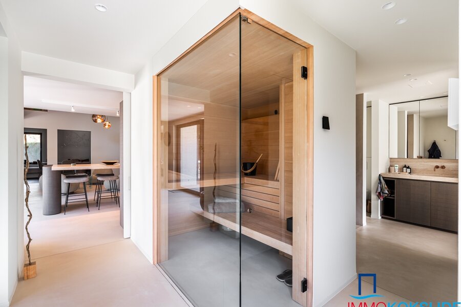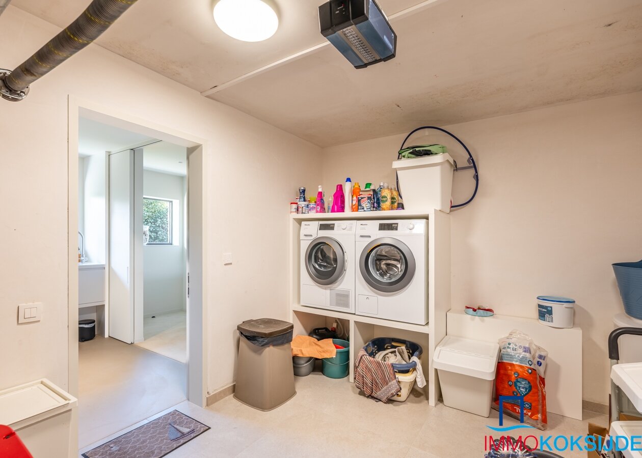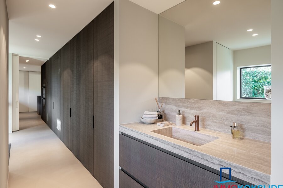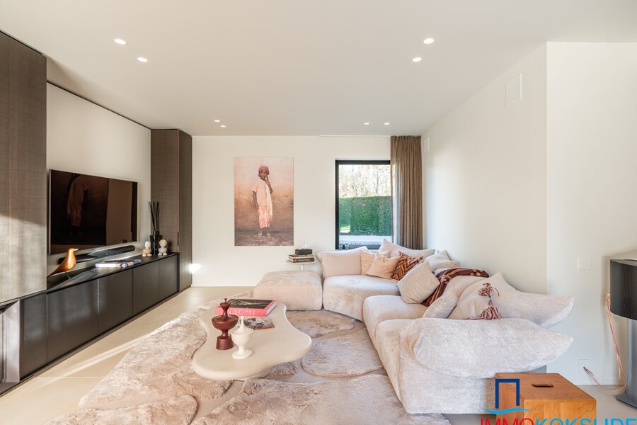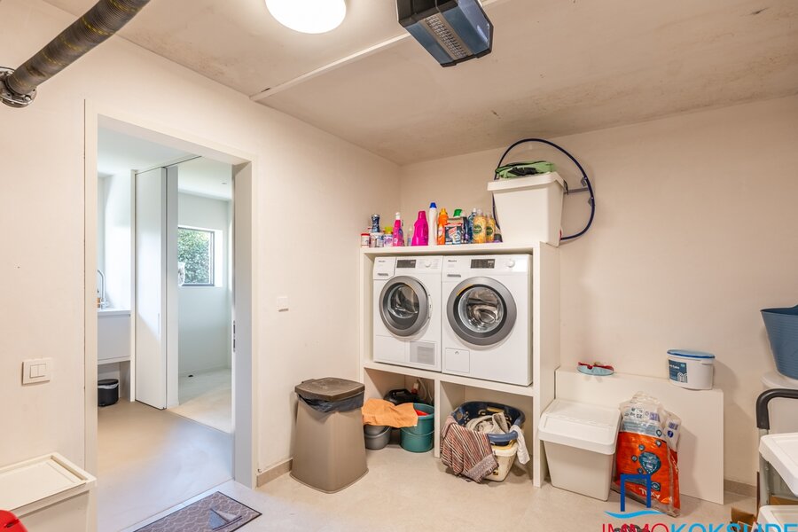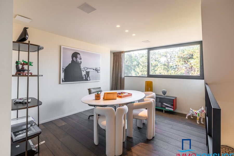 De villa bestaat uit: - op het gelijkvloers: inkomhall met toilet en vestiaire, prachtige en lichtrijke leefruimte met gezellige eetplaats en salon, open en volledig ingerichte moderne keuken voorzien van alle toestellen, master bedroom met dressing, badkamer en sauna. Vanuit alle ruimtes toegang tot de zonnige tuin. Verder op het gelijkvloers nog een wasplaats en garage. - op de verdieping: open en lichtrijke bureauruimte, 4 slaapkamers waarvan 3 met badkamer en een afzonderlijk toilet. Een oprit voor de garage en een ruime voorraad kelder. Meubels bespreekbaar.
