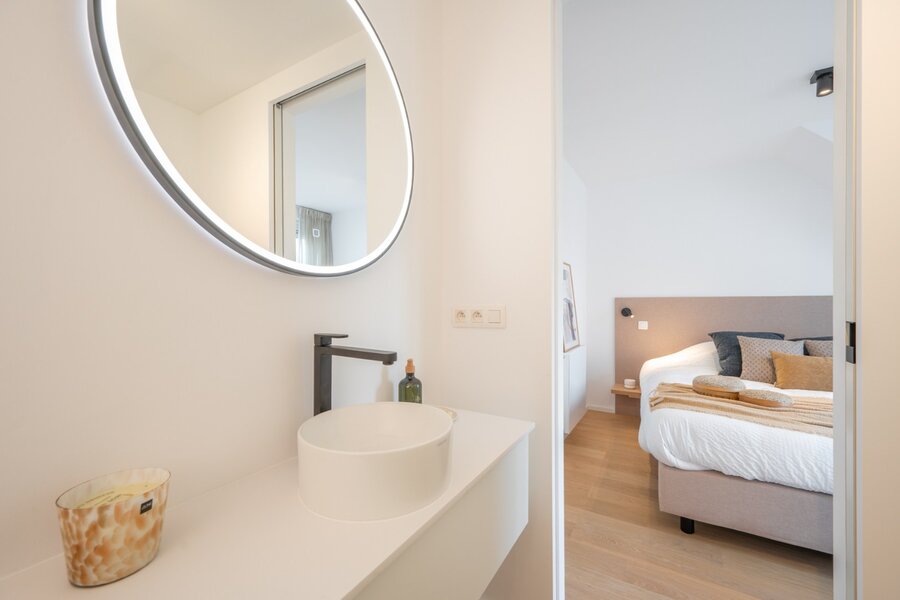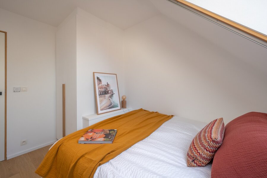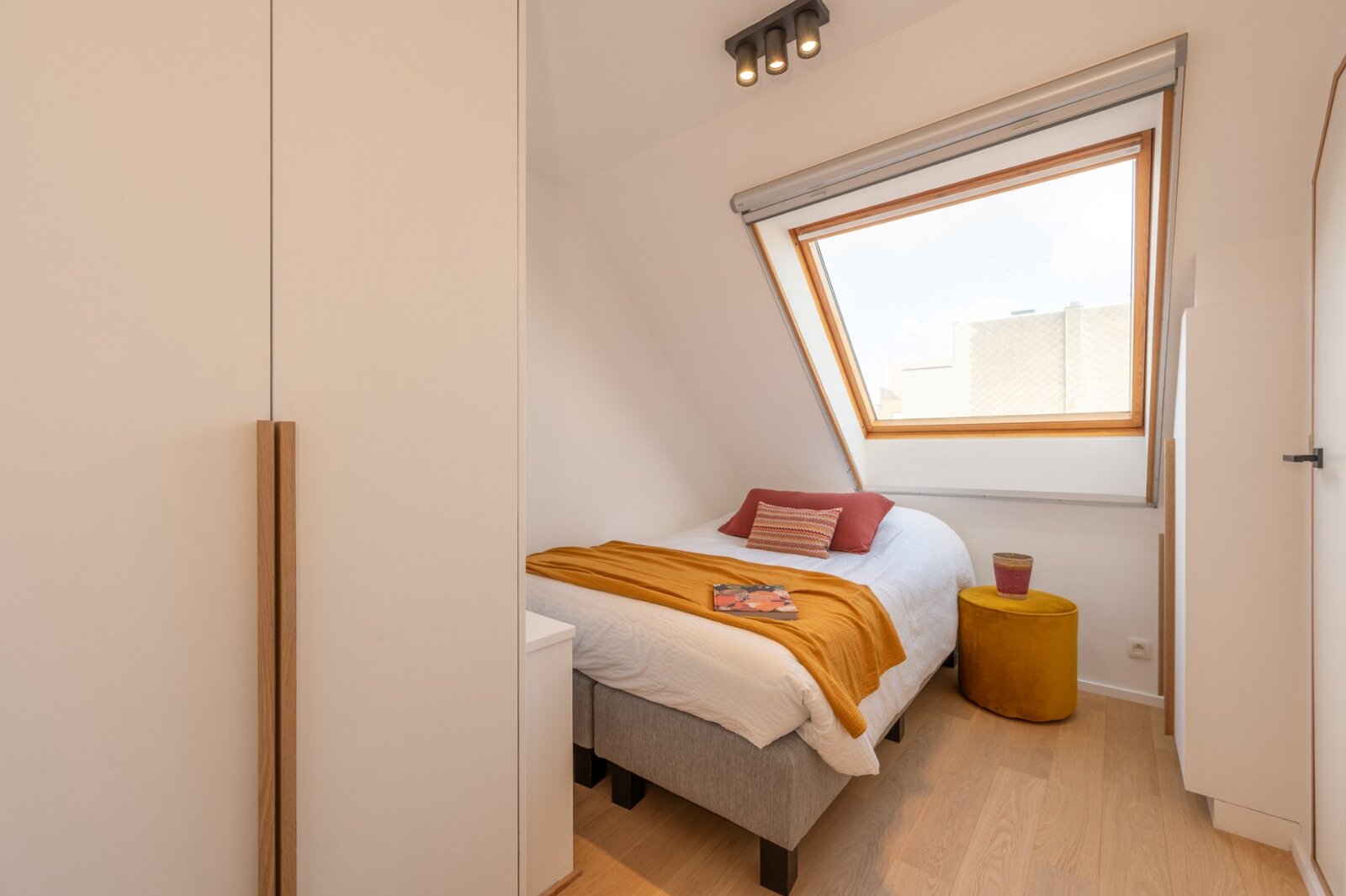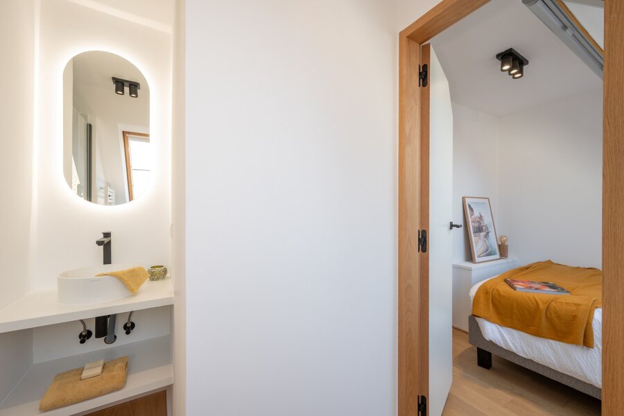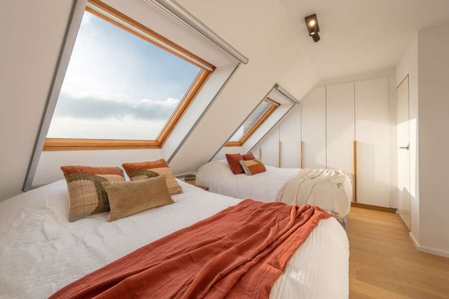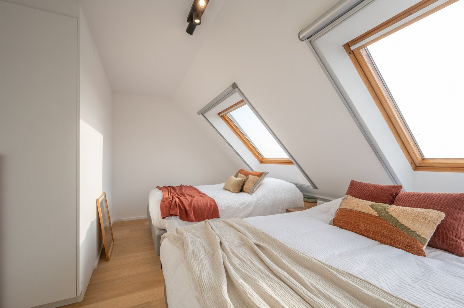 Op de bovenste verdieping bevinden zich twee volwaardige slaapkamers, elk met een eigen badkamer.