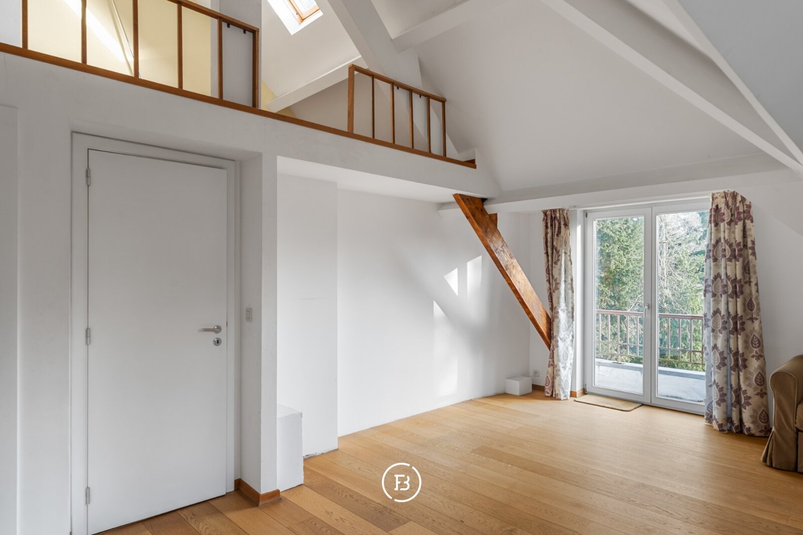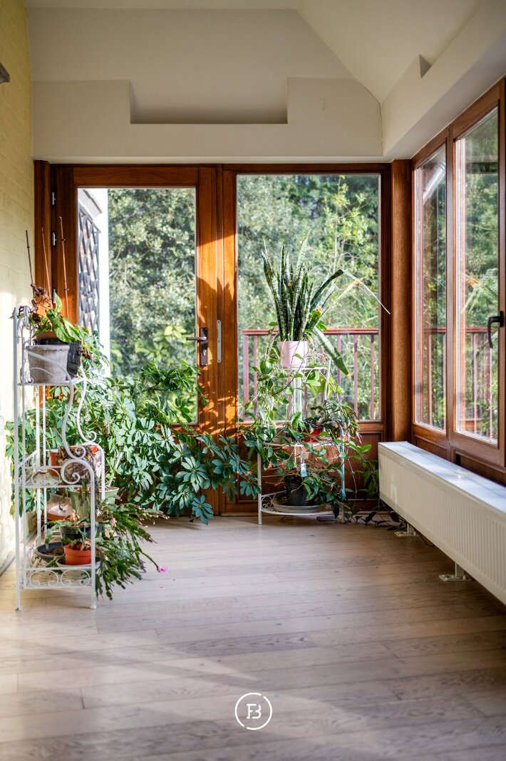 - Gelijkvloers: lichtrijke leefruimte met openhaard, eetruimte, aparte keuken, bureau, TV-kamer met ensuite badkamer en veranda