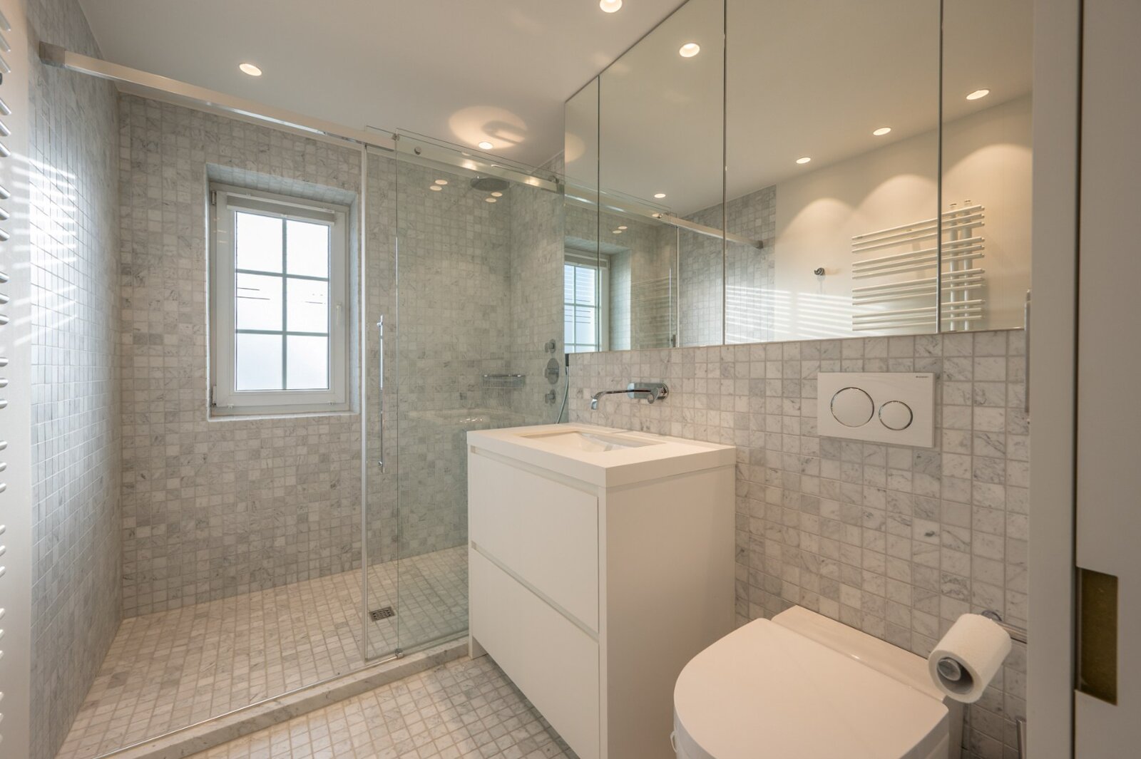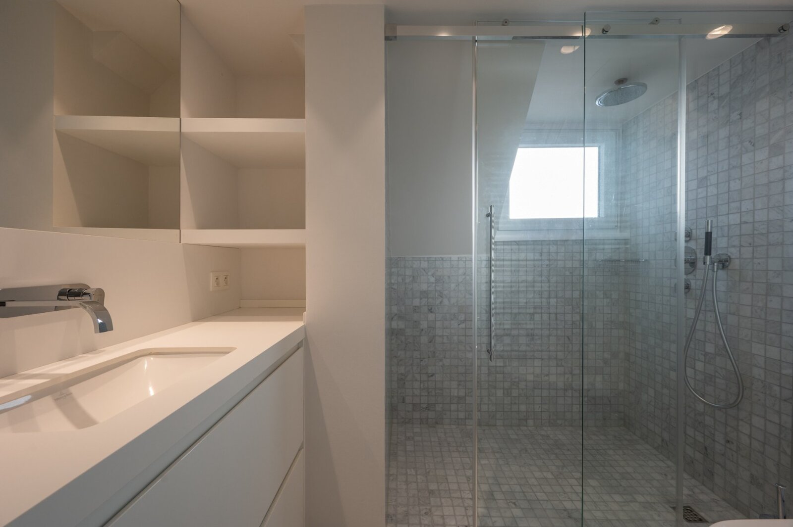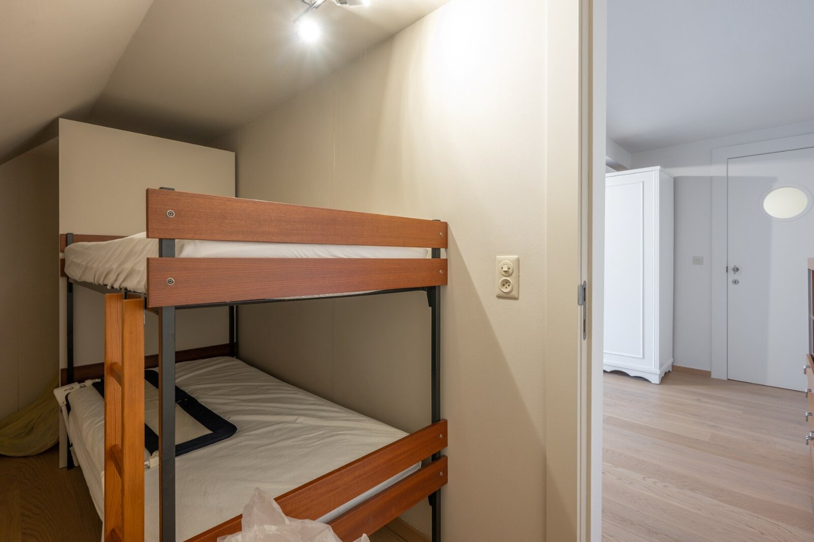 De eerste verdieping omvat twee ruime slaapkamers. Eén daarvan is momenteel ingericht als extra leefruimte en geeft uit op een aangenaam, zonnig terras. Verder is er een grote dressing, die ook perfect kan dienen als derde, compactere slaapkamer, en een comfortabele badkamer.