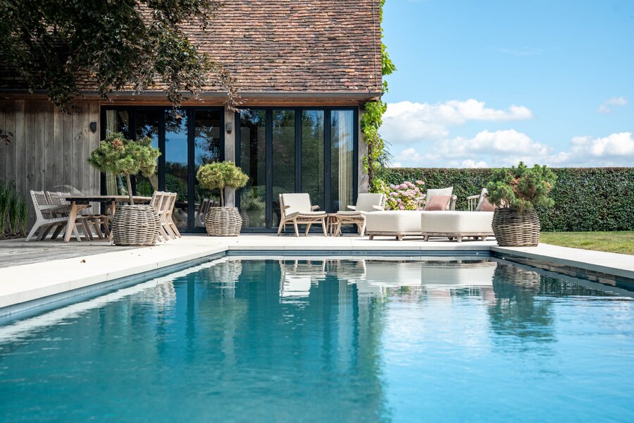 De landschapstuin, met zorg ontworpen en aangelegd door Monballiu, vormt een natuurlijk verlengstuk van de woning. Meerdere terrassen bieden zon- en schaduwplekken, waaronder een prachtig terras aan het zwembad, verwarmd via warmtepomp, en grenzend aan het exclusieve poolhouse. Dit poolhouse functioneert volledig autonoom en is uitgerust met vloerverwarming, open haard, keuken, sanitair en badkamer – de perfecte gastenvleugel of ontspanningsruimte.