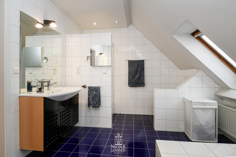- Ruime betegelde badkamer met ligbad, toilet, douche en twee grote wastafels