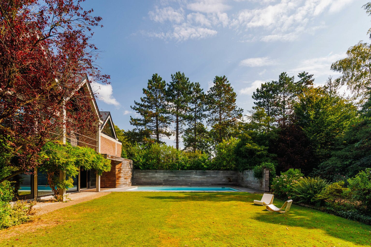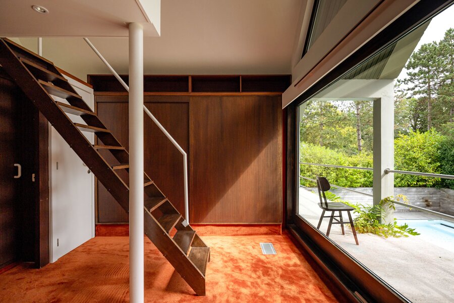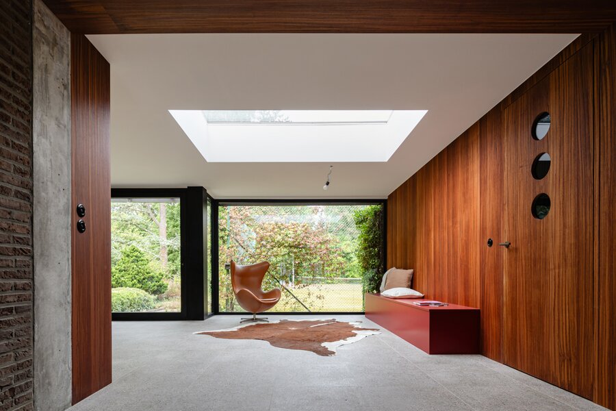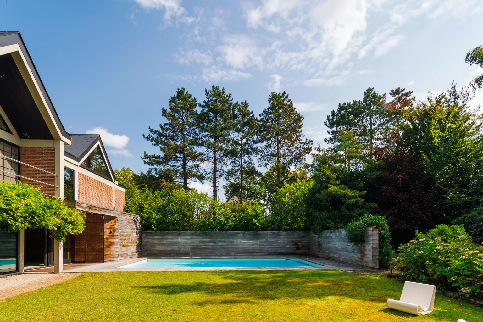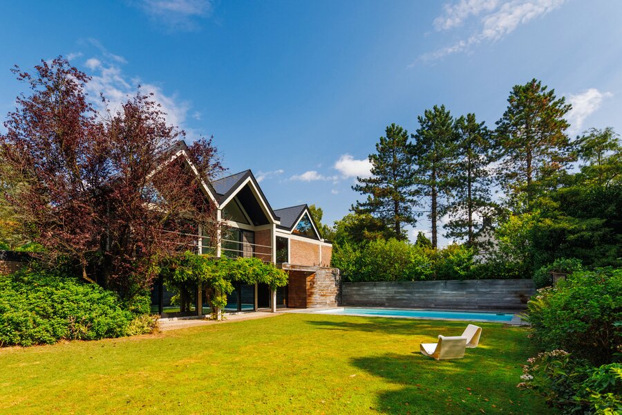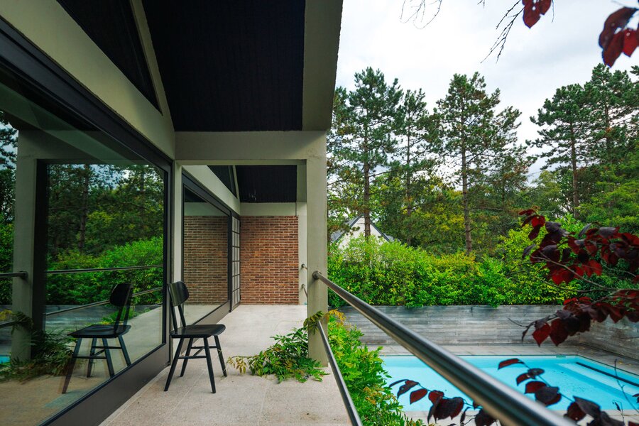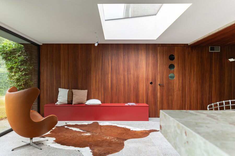 Je weet niet waar eerst kijken in dit architecturale meesterwerk. De inkomhal met gastentoilet en vestiairekast ademt meteen de coole seventies sfeer. Door de deur in gefumeerd glas ga je naar de zonovergoten woonkamer. Onder de opvallende open trap: gezellige zitput met open houthaard. Vanuit de grote zitruimte heb je fijn zicht op tuin en zwembad en plaats voor al je boeken en trouvailles in de op maat gemaakte bibliotheekkast. Rechts de open keuken met kwaliteitstoestellen van Miele, ruim eiland om rond samen te komen en plaats voor een grote eetruimte met supertoffe, ingebouwde hoekbank naast de tweede open houthaard. Of wordt dit een speelruimte voor de kinderen?