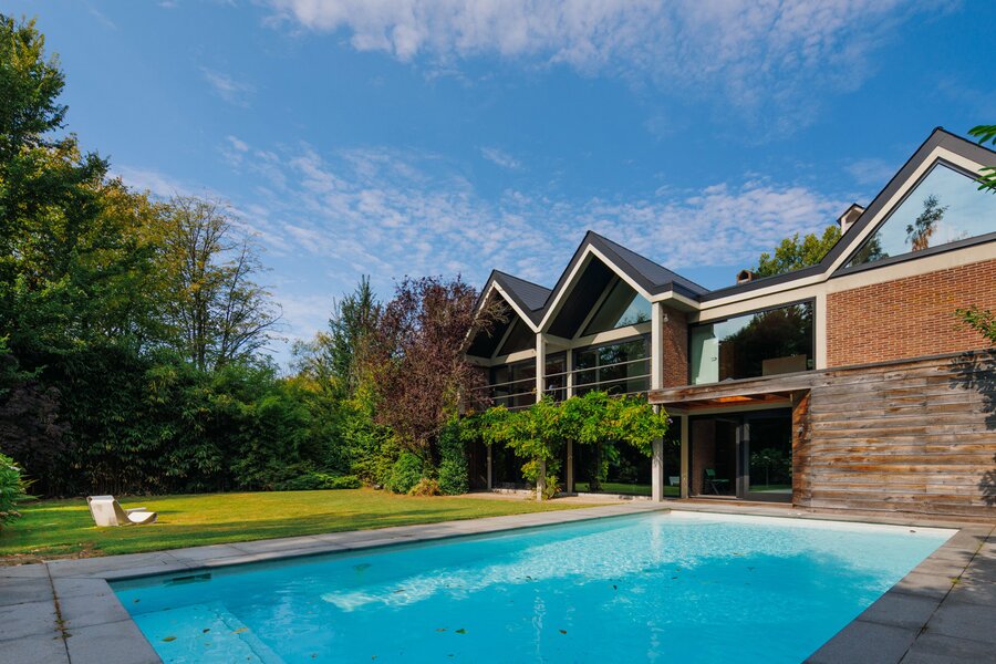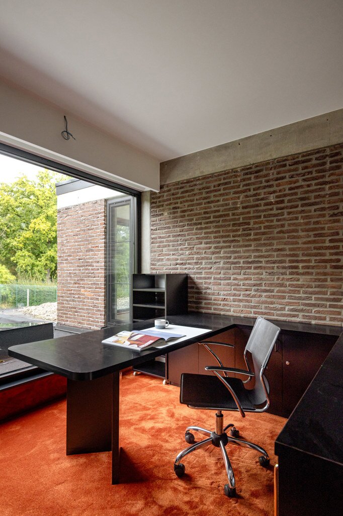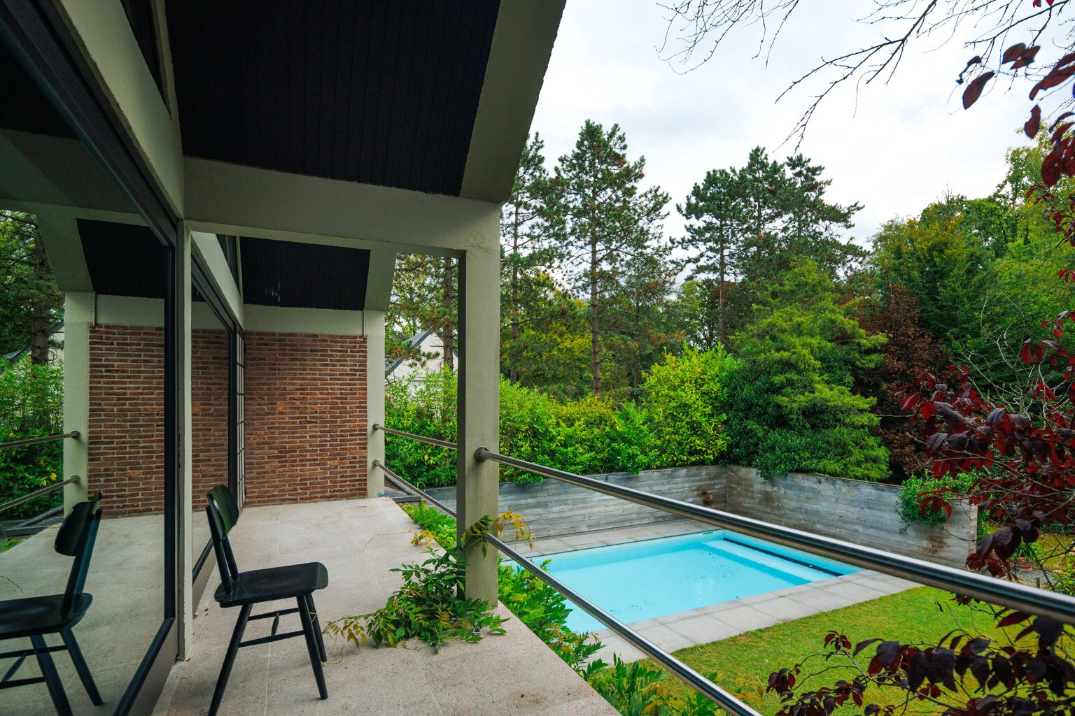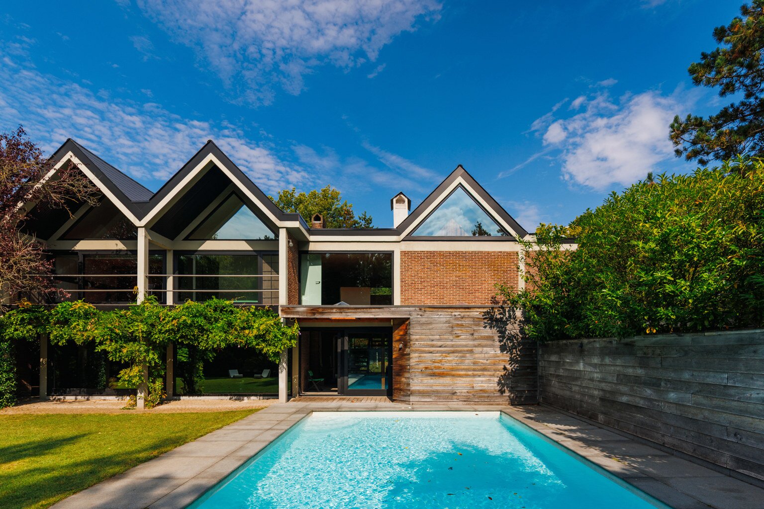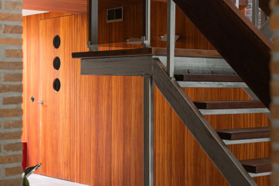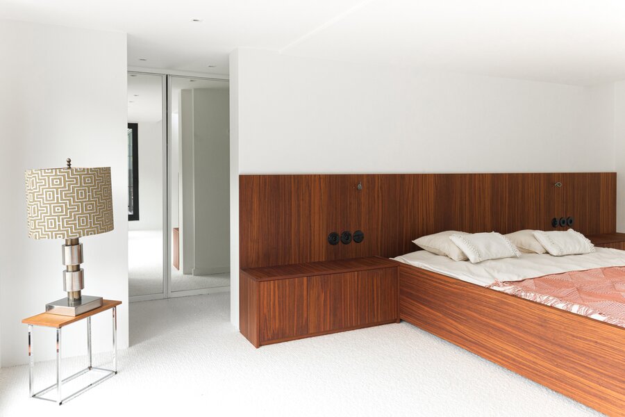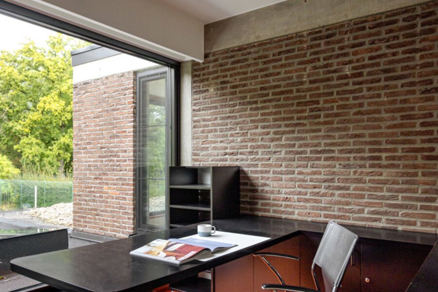 Je weet niet waar eerst kijken in dit architecturale meesterwerk. De inkomhal met gastentoilet en vestiairekast ademt meteen de coole seventies sfeer. Door de deur in gefumeerd glas ga je naar de zonovergoten woonkamer. Onder de opvallende open trap: gezellige zitput met open houthaard. Vanuit de grote zitruimte heb je fijn zicht op tuin en zwembad en plaats voor al je boeken en trouvailles in de op maat gemaakte bibliotheekkast. Rechts de open keuken met kwaliteitstoestellen van Miele, ruim eiland om rond samen te komen en plaats voor een grote eetruimte met supertoffe, ingebouwde hoekbank naast de tweede open houthaard. Of wordt dit een speelruimte voor de kinderen?