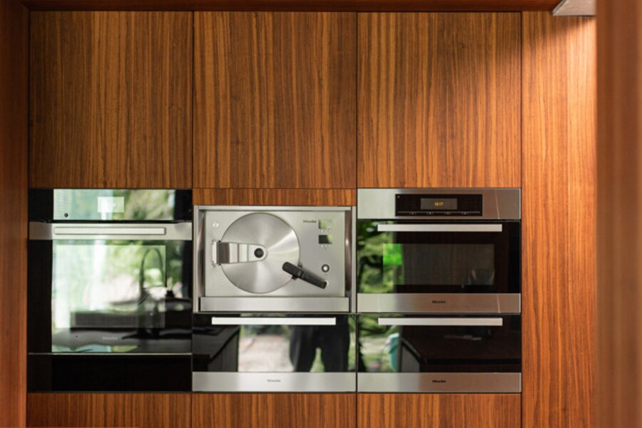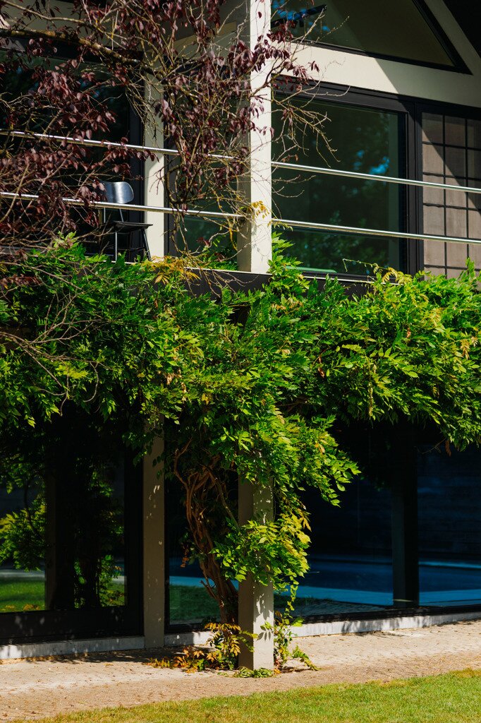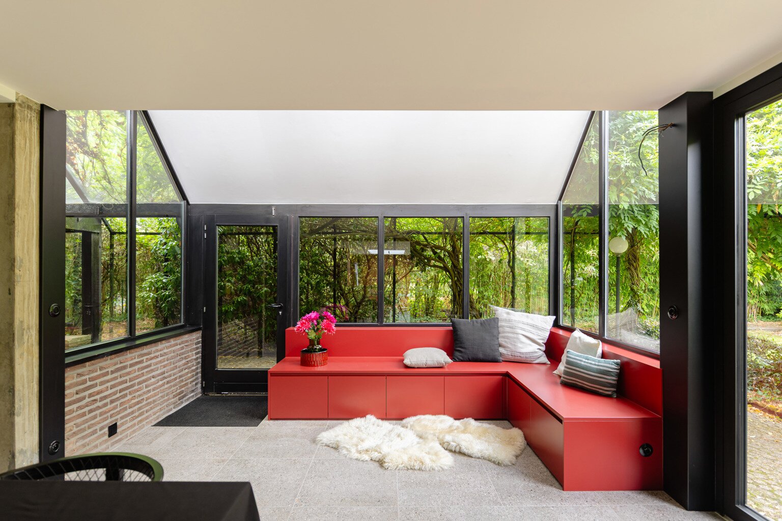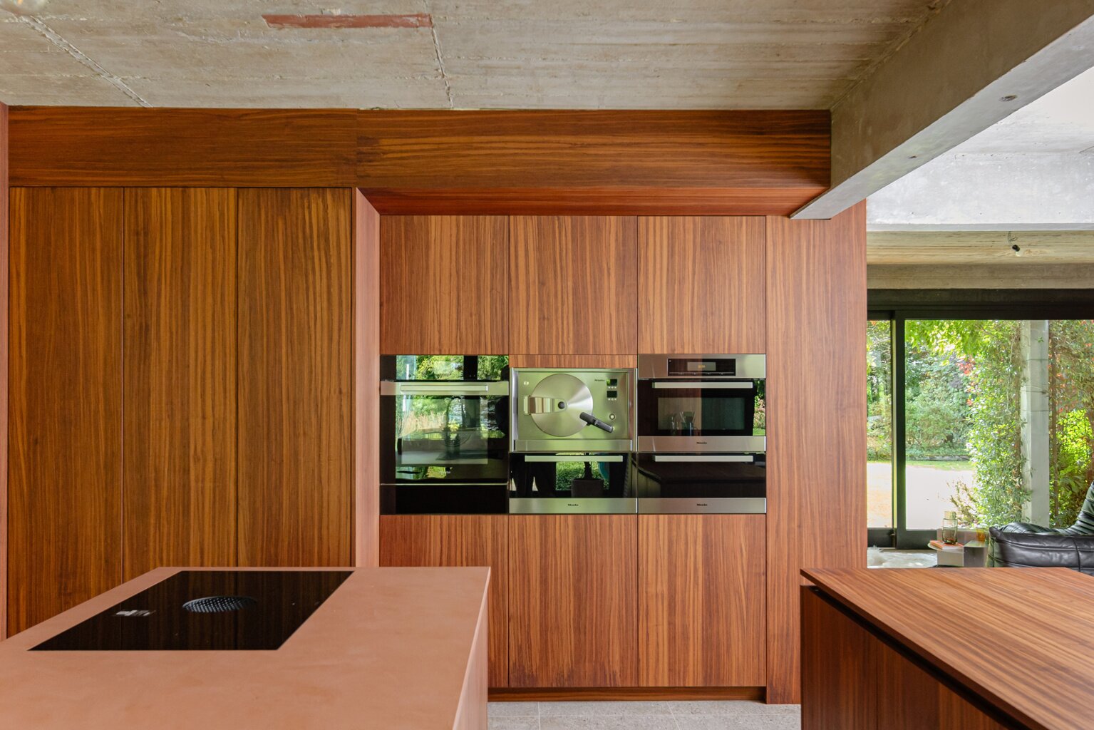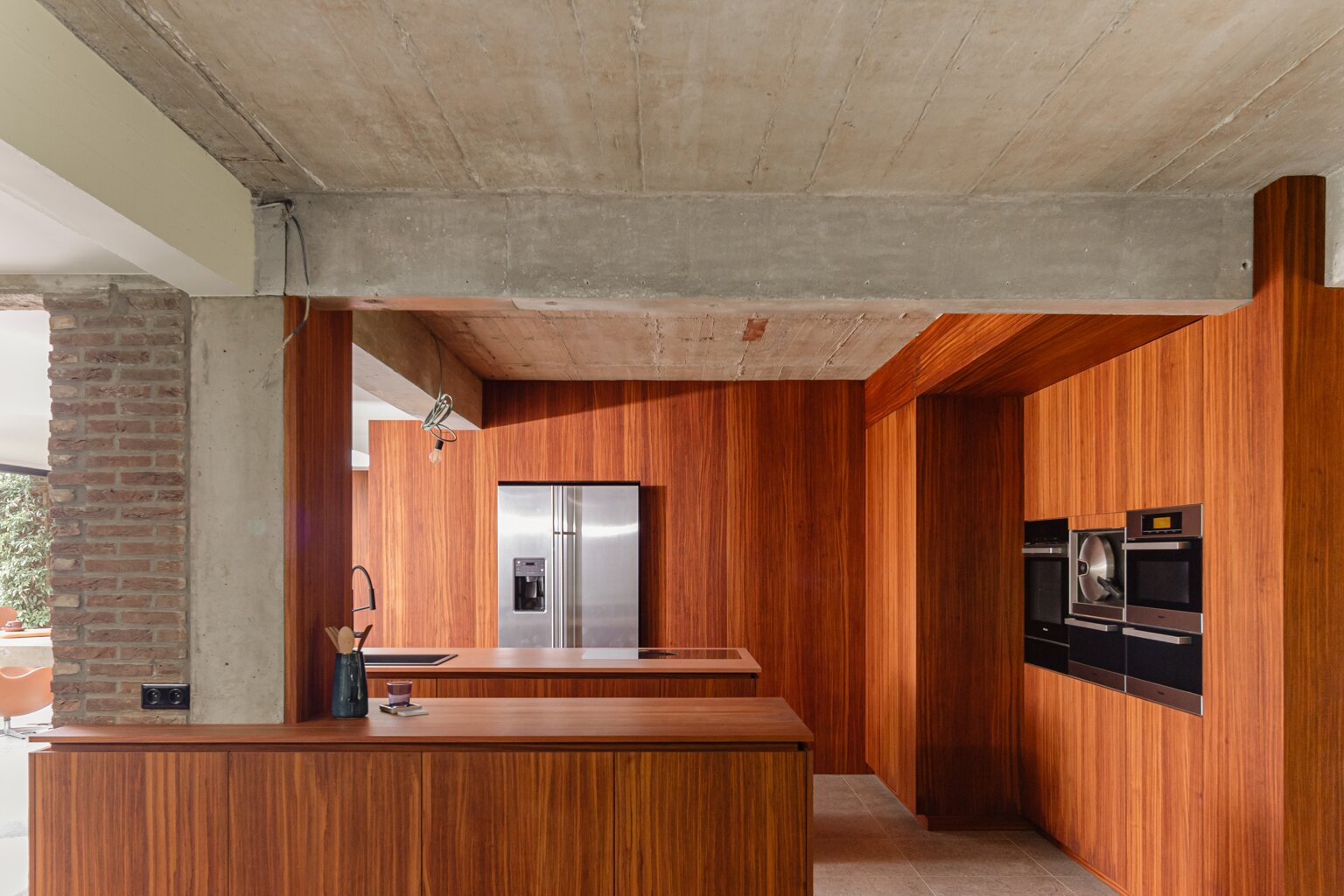 Je weet niet waar eerst kijken in dit architecturale meesterwerk. De inkomhal met gastentoilet en vestiairekast ademt meteen de coole seventies sfeer. Door de deur in gefumeerd glas ga je naar de zonovergoten woonkamer. Onder de opvallende open trap: gezellige zitput met open houthaard. Vanuit de grote zitruimte heb je fijn zicht op tuin en zwembad en plaats voor al je boeken en trouvailles in de op maat gemaakte bibliotheekkast. Rechts de open keuken met kwaliteitstoestellen van Miele, ruim eiland om rond samen te komen en plaats voor een grote eetruimte met supertoffe, ingebouwde hoekbank naast de tweede open houthaard. Of wordt dit een speelruimte voor de kinderen?