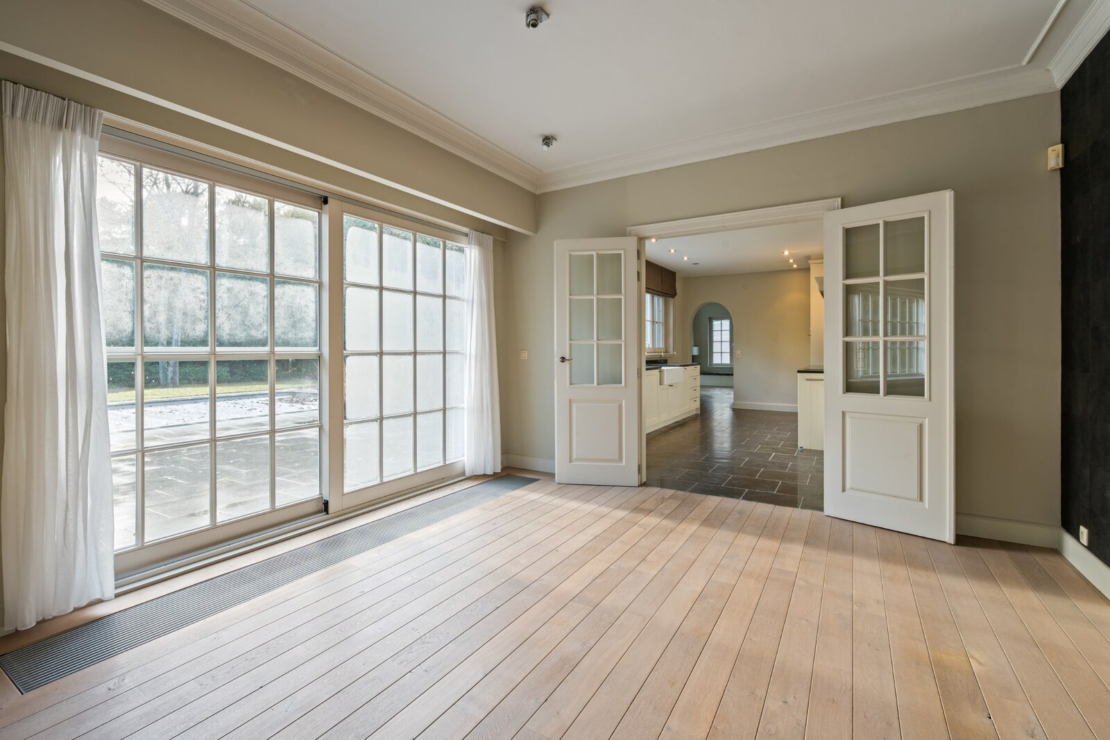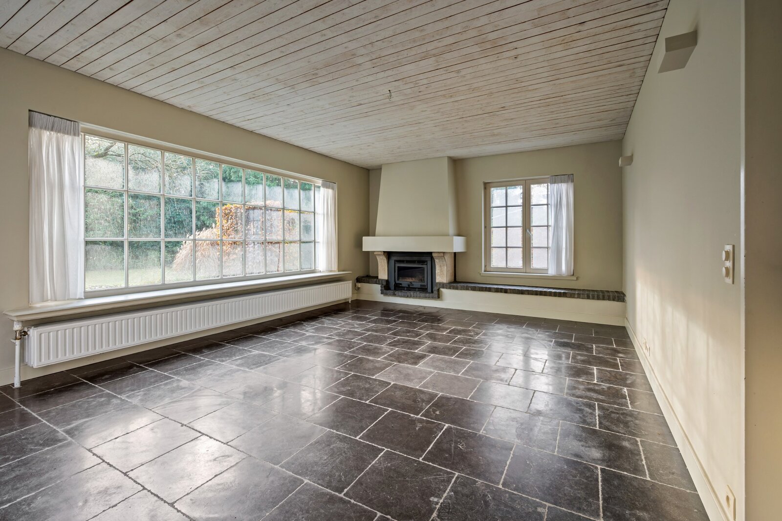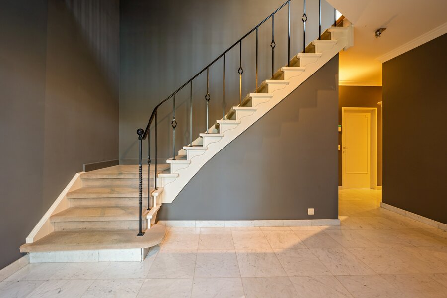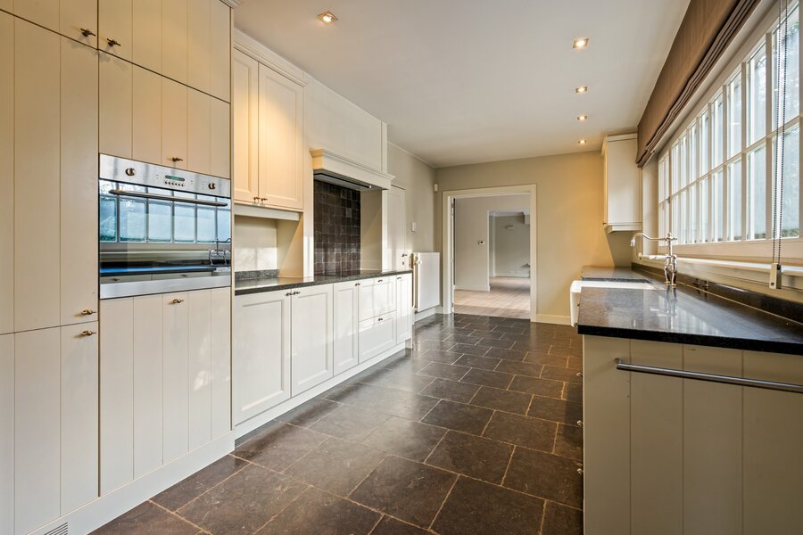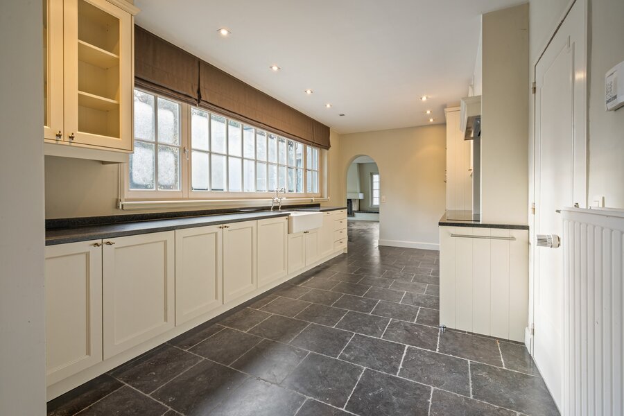 Via de inkomhal met gastentoilet bereikt u de verschillende leefruimtes. De woning beschikt over een dubbele garage, een bureauruimte of speelkamer, een stijlvolle volledig ingerichte keuken met aansluitende, zonnige eetkamer, en een ruime leefruimte met haard. De afwerking met parket en blauwe hardsteen creëert een warme, tijdloze sfeer.