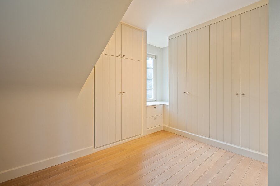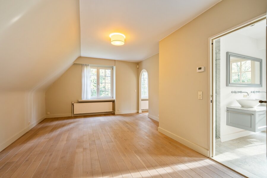 Op de verdieping bevindt zich de royale master bedroom met dressing, private badkamer en toegang tot een zonneterras. Daarnaast zijn er vier ruime slaapkamers, een douchekamer, een apart toilet en een praktische bergzolder.