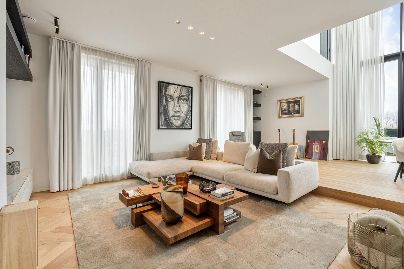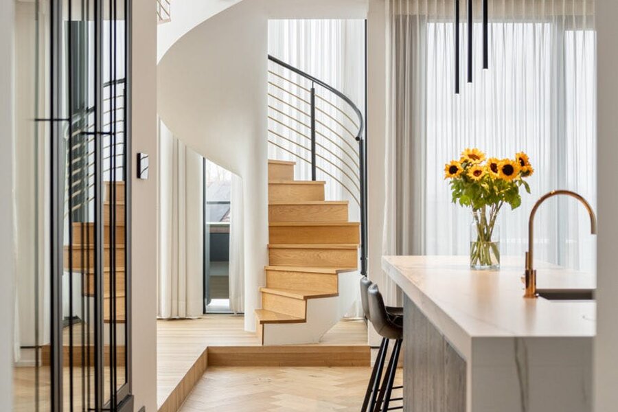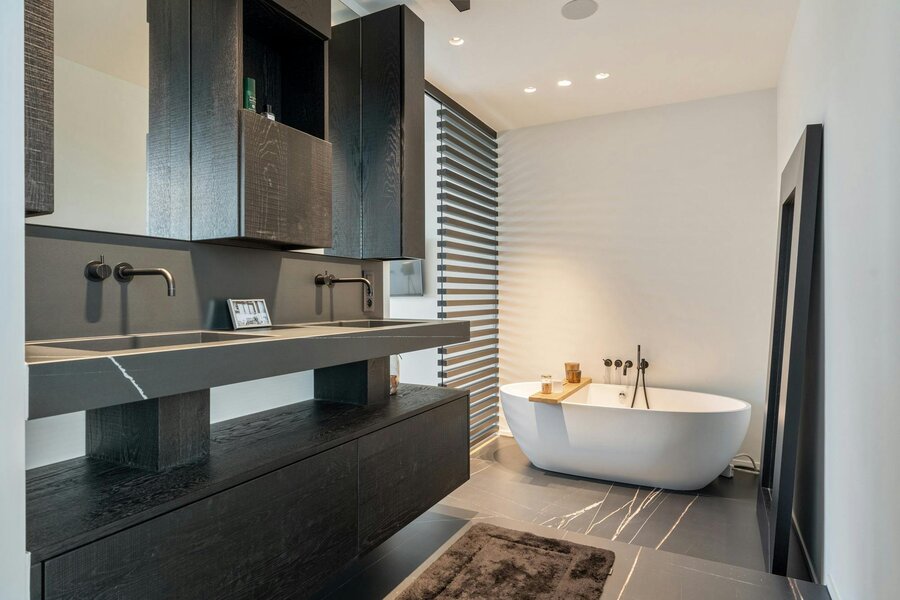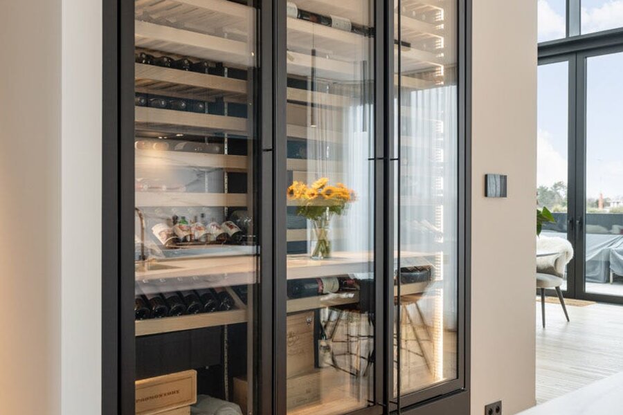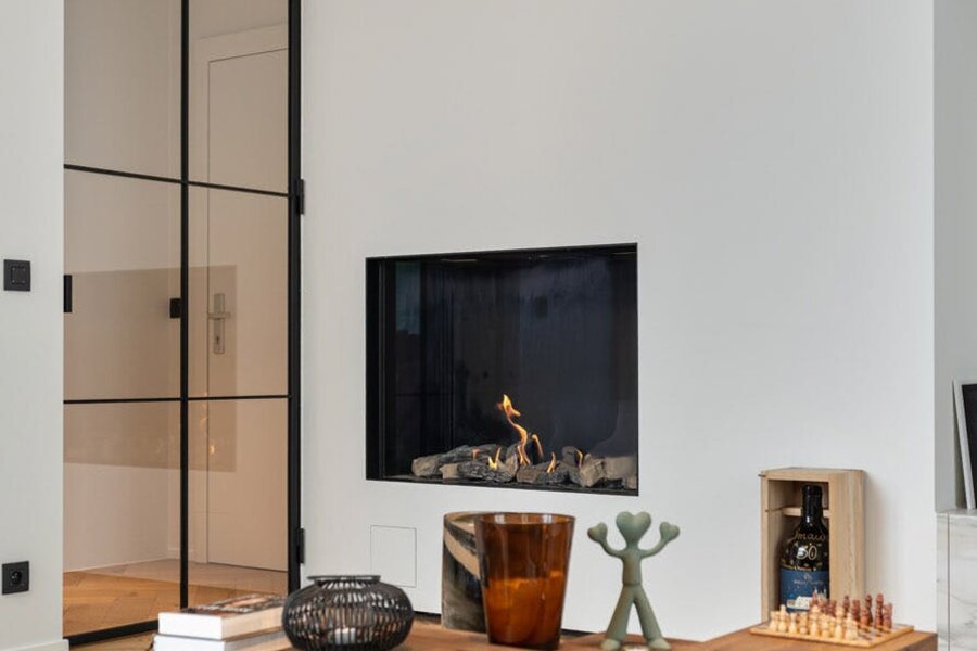 Hoogwaardige technieken zoals vloerverwarming in combinatie met een warmtepomp, domotica en automatische gordijnen zorgen voor een hedendaags wooncomfort dat naadloos aansluit bij de architectuur.