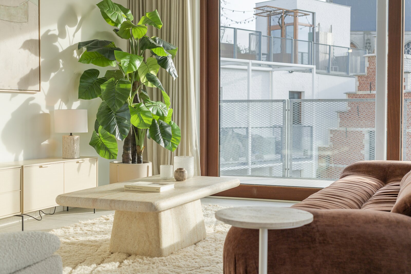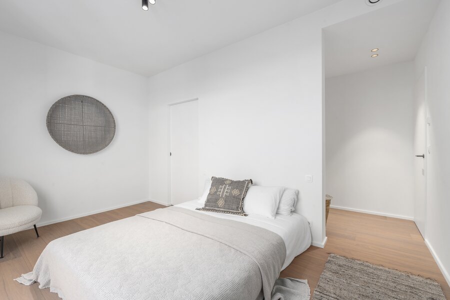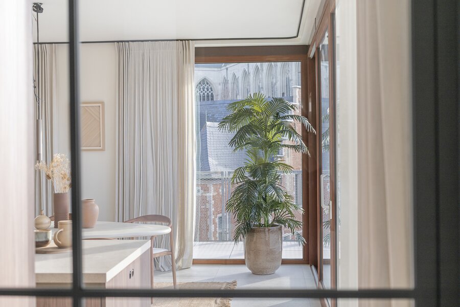 Via de hal kom je binnen in het penthouse met hoge plafonds, grote raampartijen en een aangenaam ruimtegevoel.