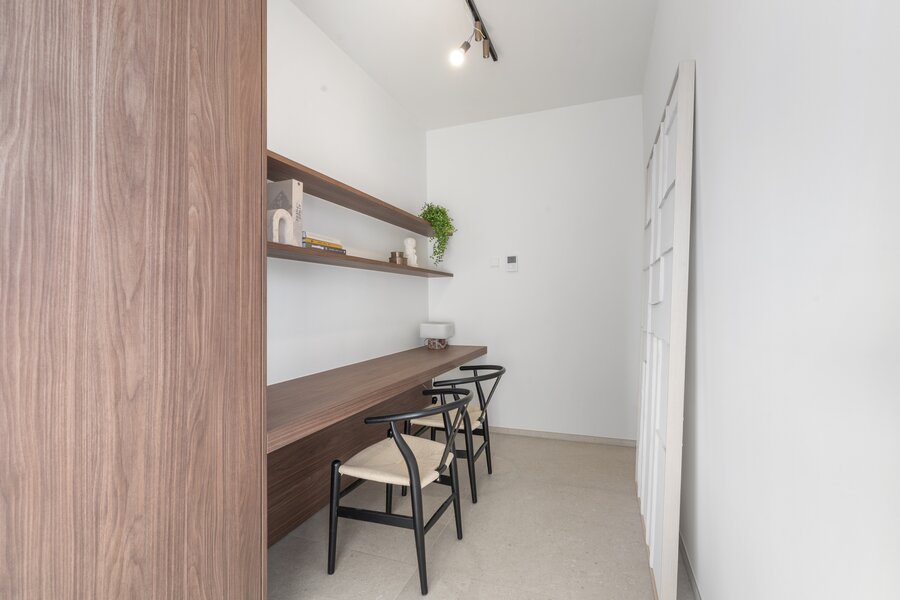 Naast de keuken is een praktische berging voorzien, met aansluitingen wasmachine. Aansluitend is er een bureauruimte aanwezig.