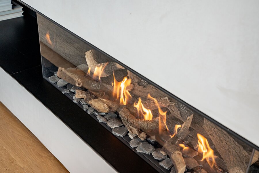 De living met gashaard vormt een gezellige ruimte met aansluitend een ruim terras.