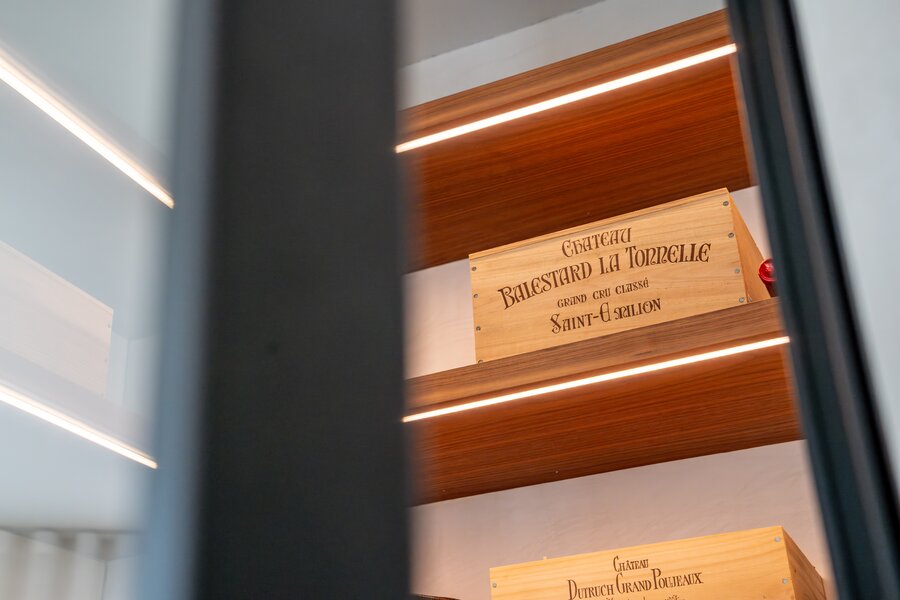 De inkomhal met gastentoilet leidt naar de ruime leefkeuken, volledig uitgerust met Miele-toestellen, een wijnfrigo en een praktische bergruimte. Het gebruik van natuursteen loopt als een rode draad doorheen het interieur. Aansluitend bevindt zich een ruime bureauruimte, ideaal om van thuis uit te werken.