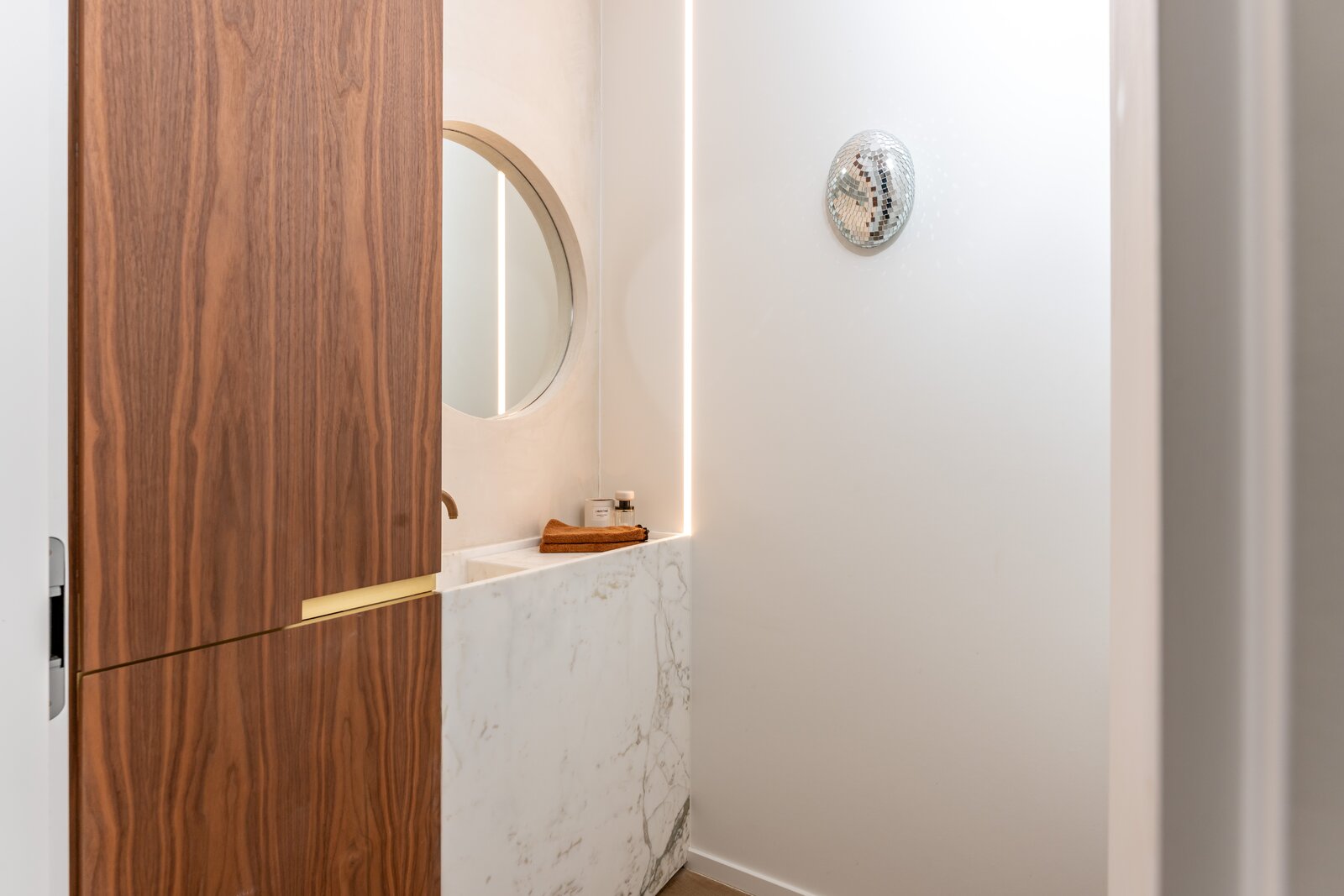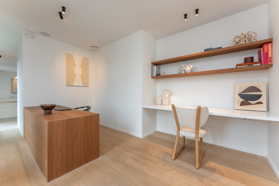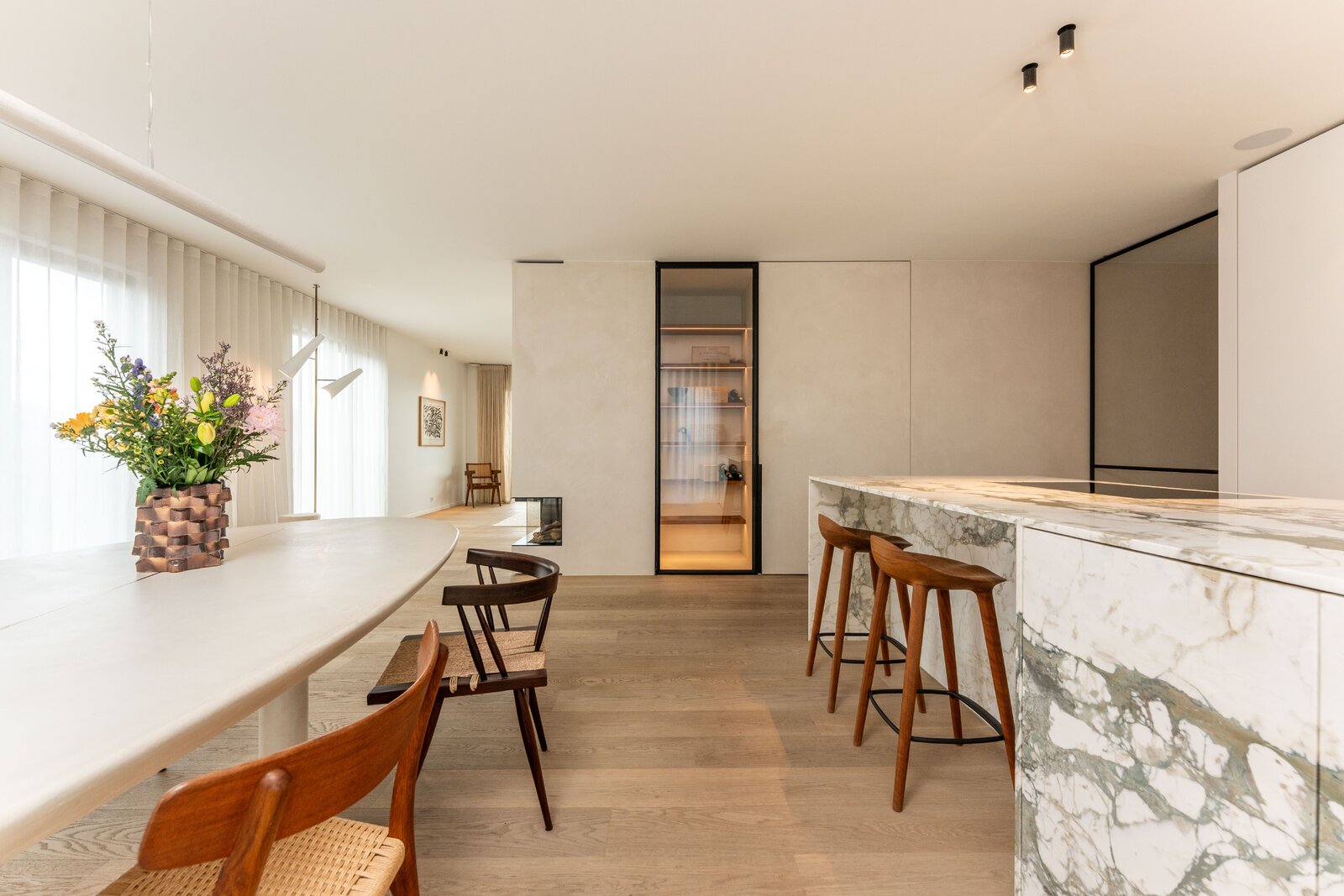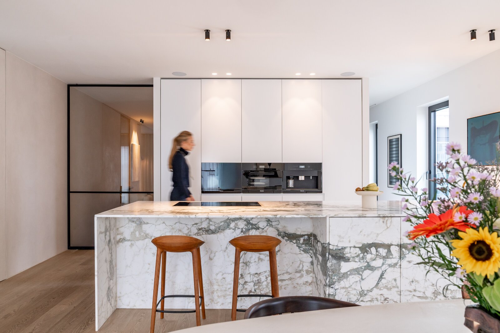 Doorheen het appartement brengen parketvloeren van Woodstoxx, Delta Light-verlichting en Vola-kraanwerk in messing een gevoel van samenhang en verfijning. Het maatwerk van Decolust, samen met de zorgvuldige afwerking en materiaalkeuze, creëert een warme en harmonieuze leefomgeving.