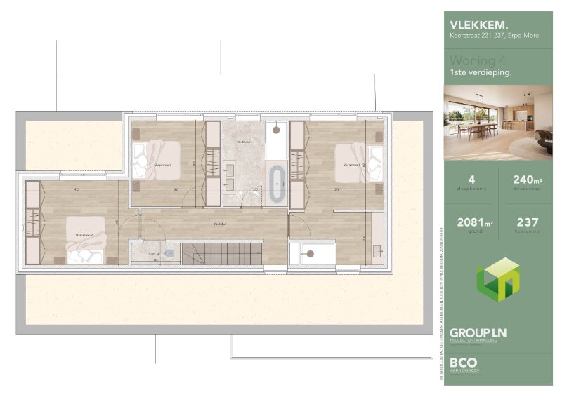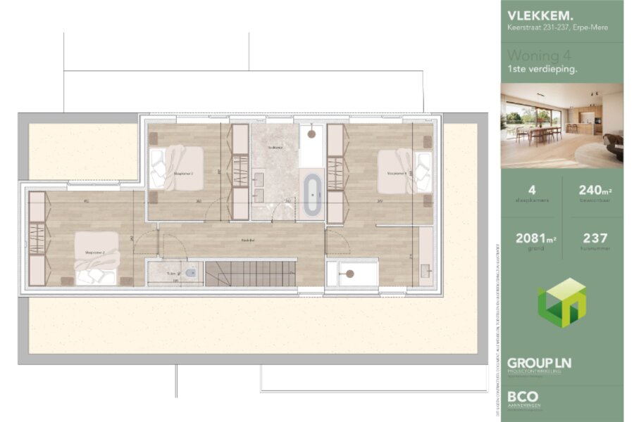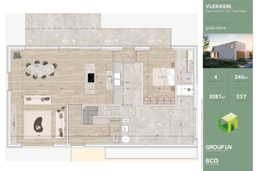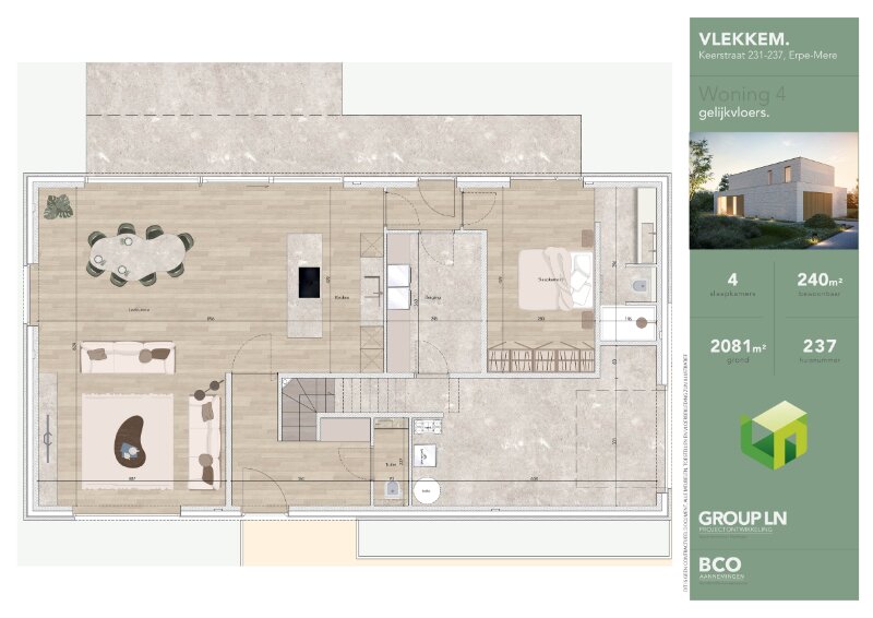 Deze open moderne villa (woning 4) is gebouwd volgens de BEN-normen en heeft een bewoonbare oppervlakte van 240m² en een perceeloppervlakte van 2081m².